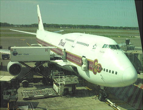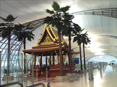 タイの建物が空港内に飾ってある。東屋なのか住居か、お寺の一部かな? 下の飛行機に乗る。