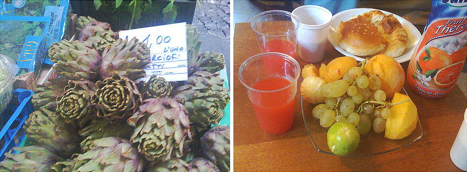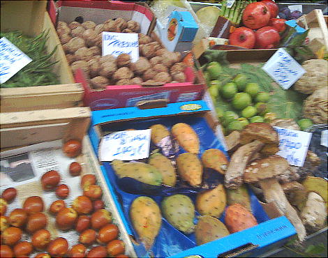 床は路上、テーブルは簡単な丸い机、天井は青空と言うわけだ。果物がおいしそうだし、見た事も無い果物か野菜か解らないがよう