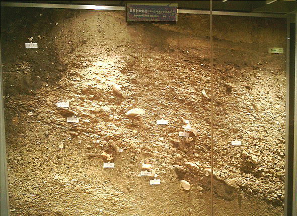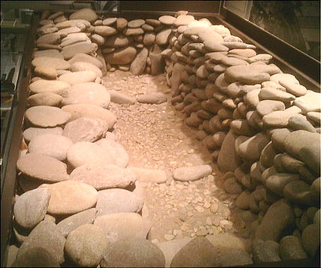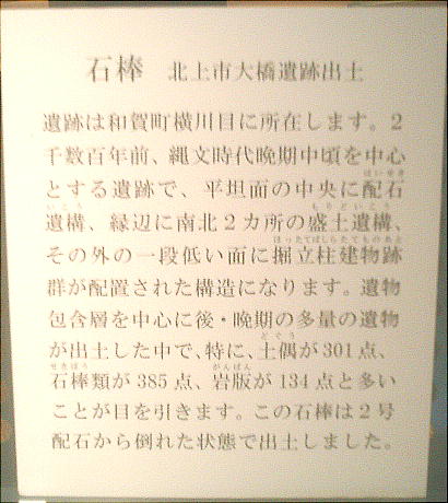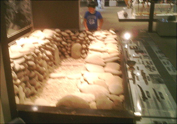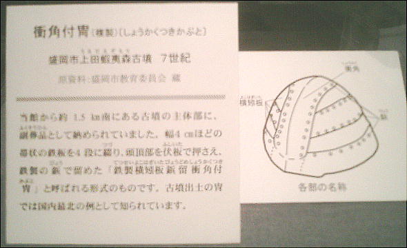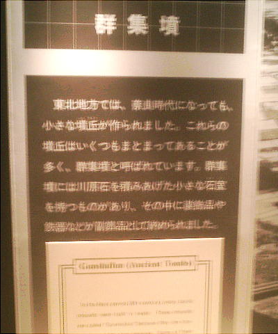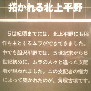 ここに展示されている模型は、北上市の長沼古墳群をモデルにした川原石積みの石室である。細長い長方形で、川原石が積み重ねら