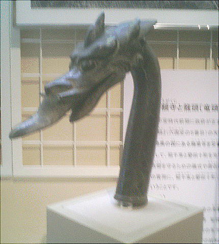 龍頭は竿の先に掲げられ、口の部分にある小孔に紐を通して幡を吊り下げ、法要の時に寺院の庭を飾るもの。平安時代の国分寺に次