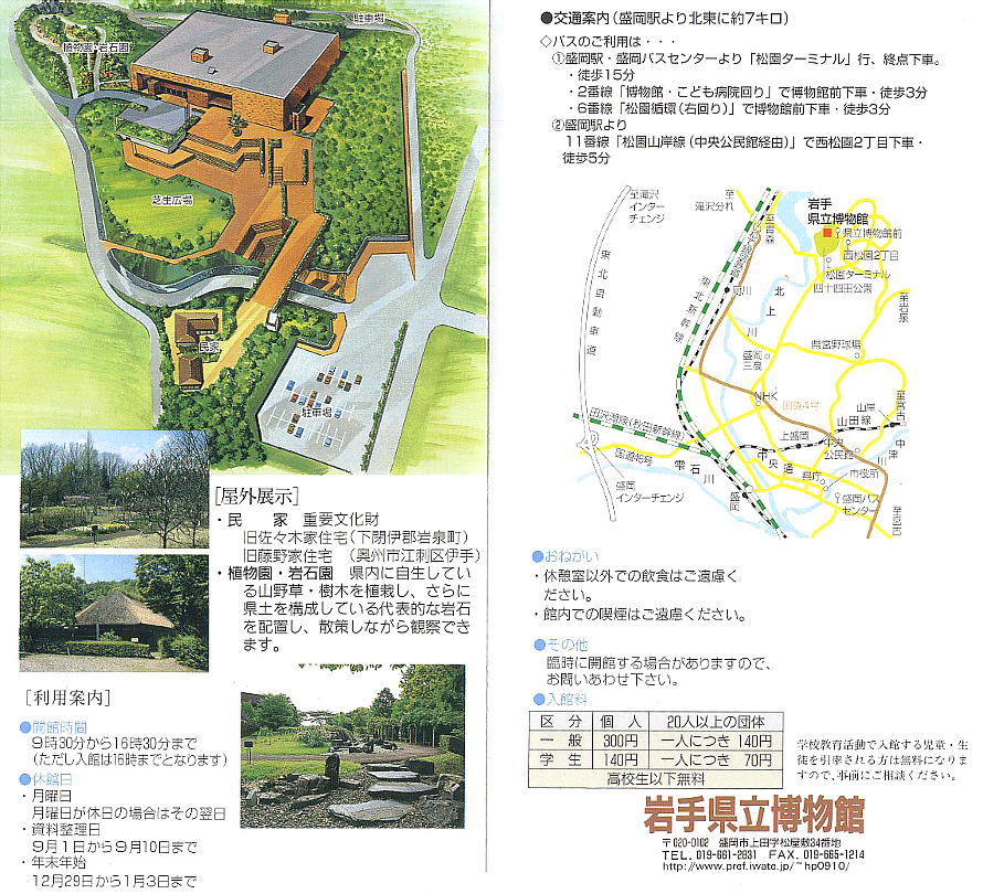アクセス 「盛岡」駅または盛岡バスセンターより松園バスターミナル行き乗車、「松園バスターミナル」下車。下車後、