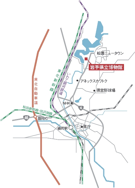 ら現代にいたる地質・考古・歴史・民俗・生物などの資料が展示され、岩手の自然と文化が学べる。盛岡駅より北東7kmとやや辺