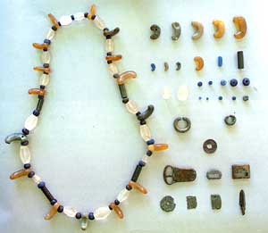 玉、碧玉やガラス製の管玉、水晶の切り子玉、ガラスや琥珀などの小玉類などがある。鉄製品は、蕨手刀をはじめとする刀剣類が多