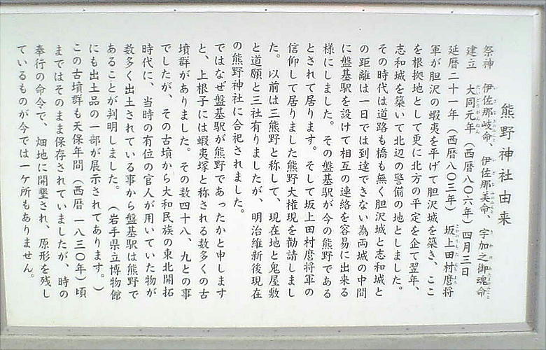 来るようにするため設けた盤城駅が、今の熊野とされている。その坂上田村麻呂が信仰していた熊野大権現を勧請し、三社あったも