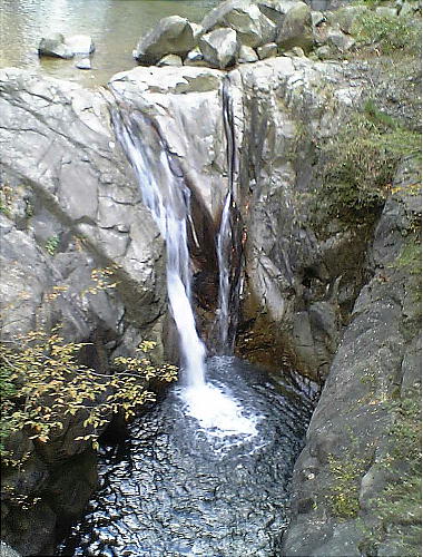 幹線新神戸駅の北約100mの所に「雌滝」が、その上200mの所に「雄滝」があり、その2つにはさまれて、上流から夫婦滝、