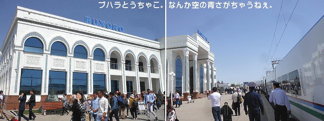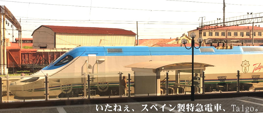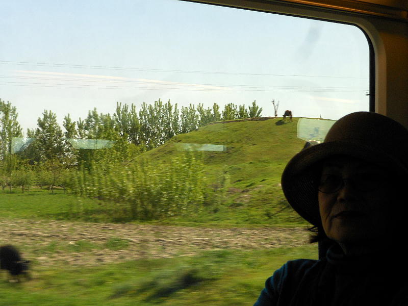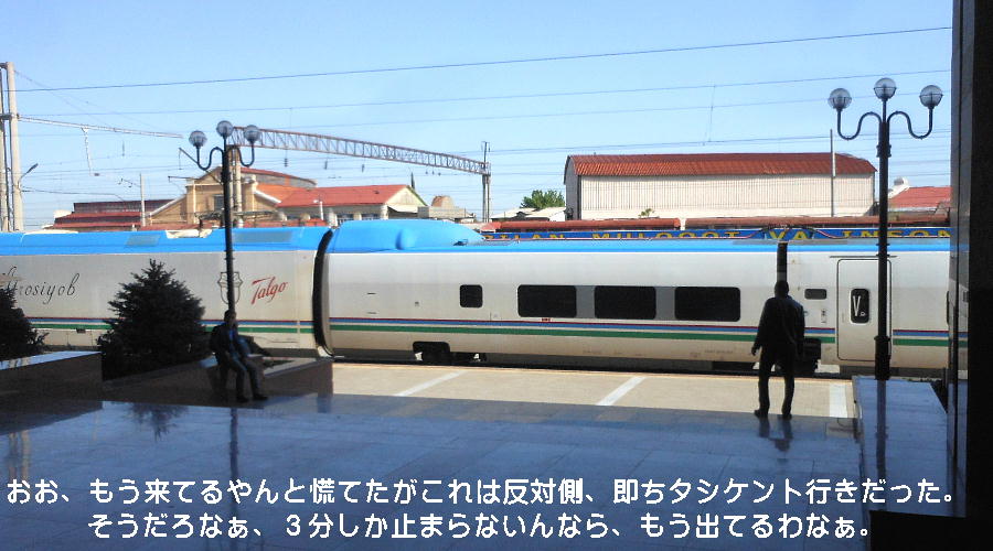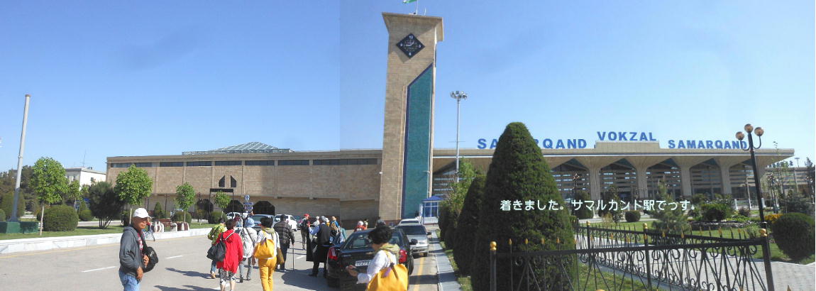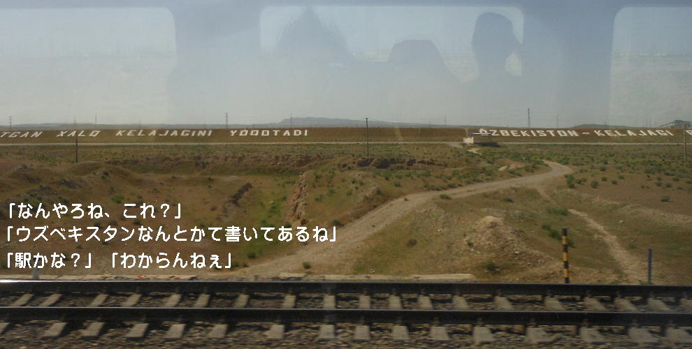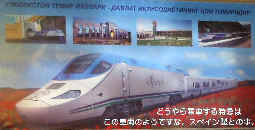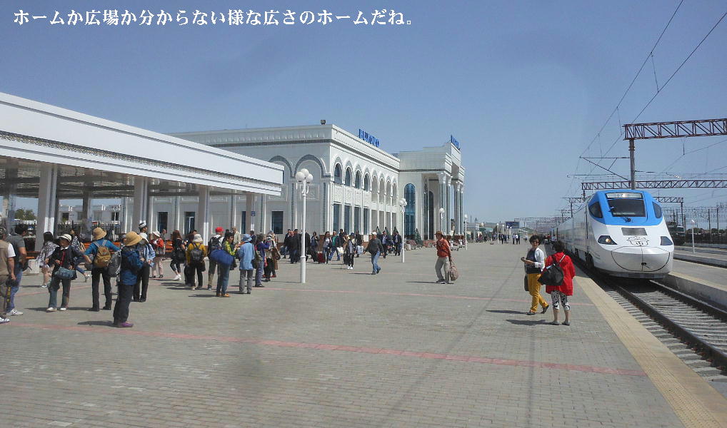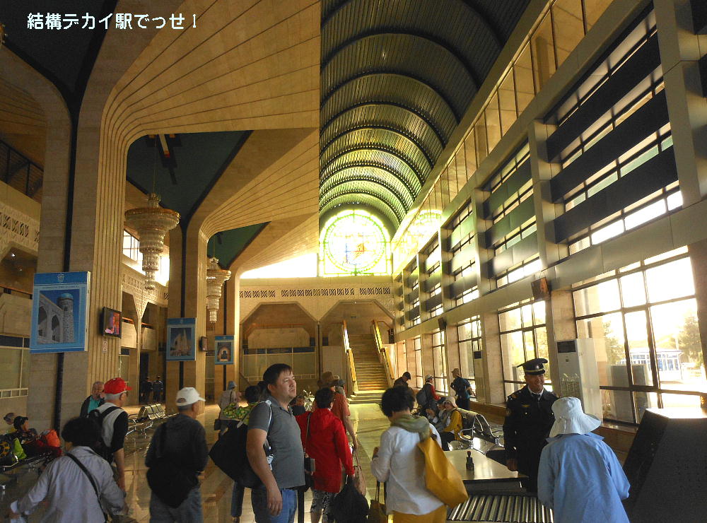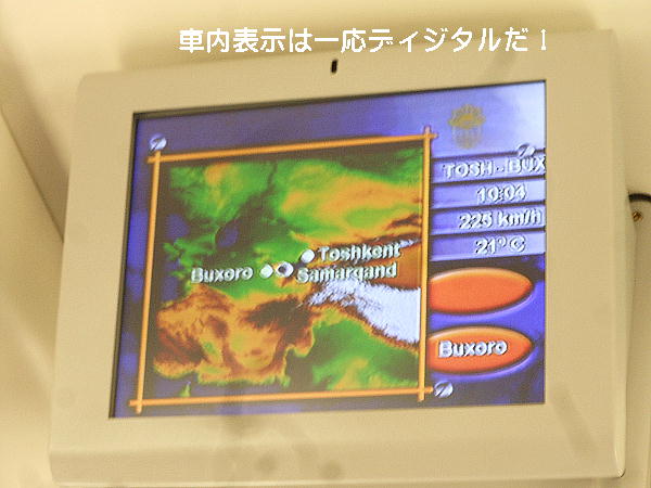 AM 7:00朝食。バスでサマルカンド駅へ向かう。午前中二時間の列車の旅。サマルカンド駅は綺麗だ。 珍しく(と誰もが言っていた)時間通りに列車がホームに入って来た。タシケント発ブハラ行き特急。 3分しか止まらないと言うので、みんな大慌てで列車に乗り込む。成る程、これで旅行ケースをガラ ガラ乗せていたら、3分では間に合わないな。先に運んでおくはずだ。旅行社の便宜でもあるわけか。 特急は快適だった。カフェ車両へ行き、インスタントコーヒーを飲みながら、車窓の風景を楽しんだ。 砂漠チックな風景に木々が疎らに生え、放牧とも放し飼いともとれるような牛の群れが幾つもいた。