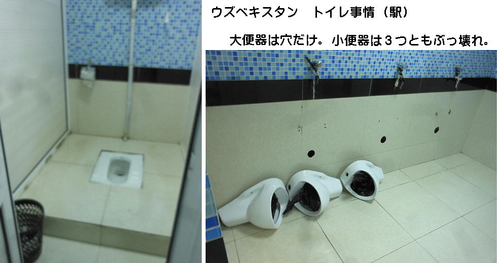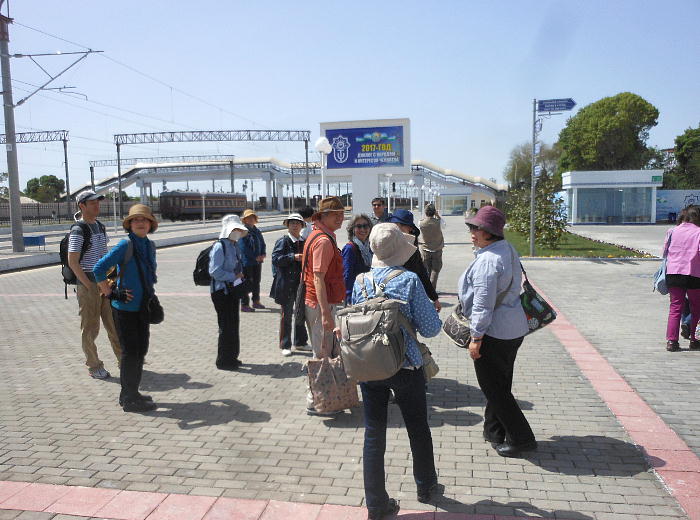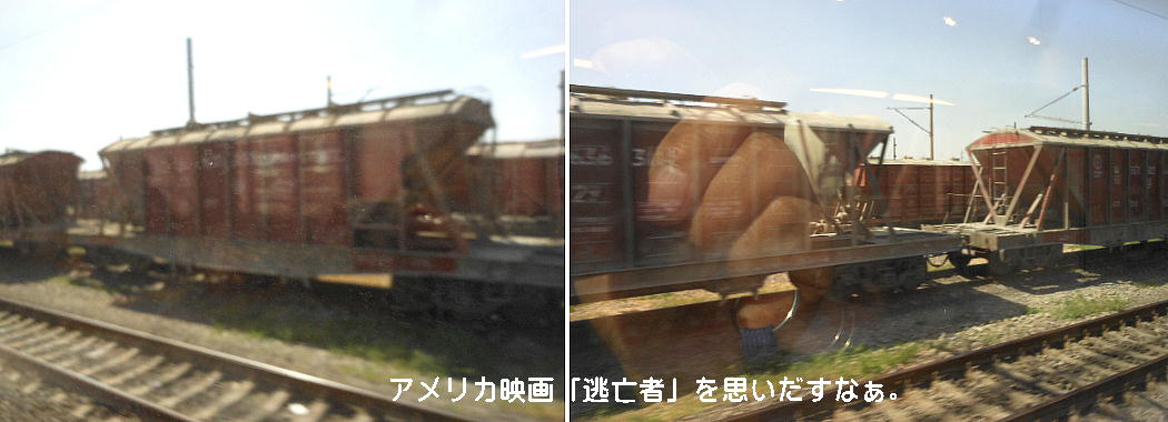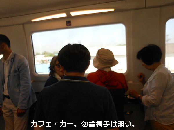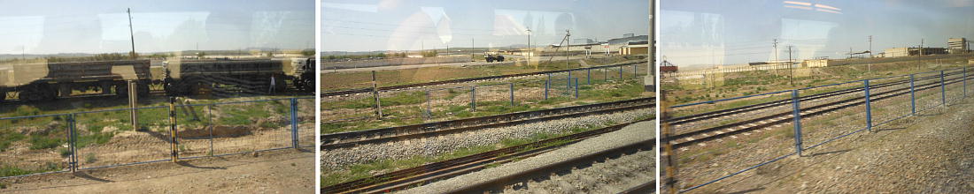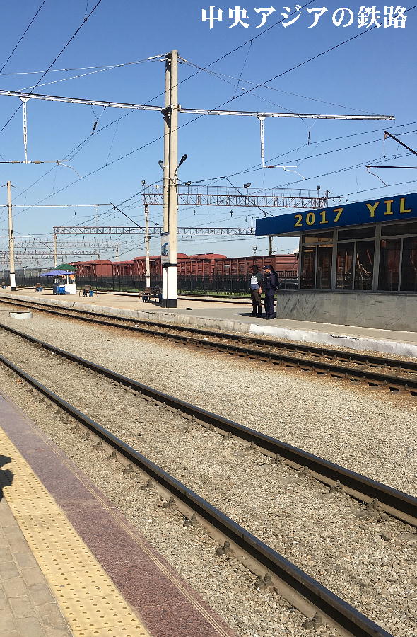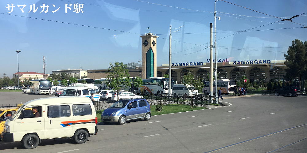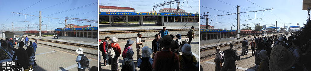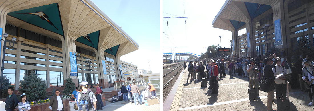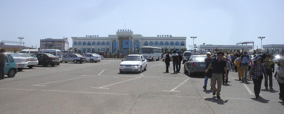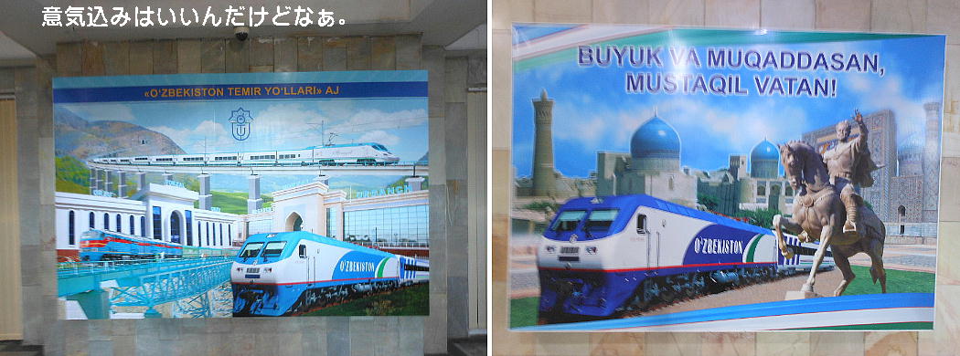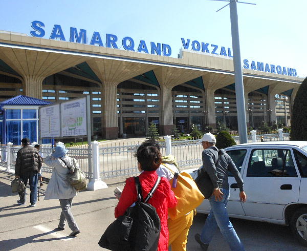 AM 7:00朝食。バスでサマルカンド駅へ向かう。午前中二時間の列車の旅。サマルカンド駅は綺麗だ。 珍しく(と誰もが言っていた)時間通りに列車がホームに入って来た。タシケント発ブハラ行き特急。 3分しか止まらないと言うので、みんな大慌てで列車に乗り込む。成る程、これで旅行ケースをガラ ガラ乗せていたら、3分では間に合わないな。先に運んでおくはずだ。旅行社の便宜でもあるわけか。 特急は快適だった。カフェ車両へ行き、インスタントコーヒーを飲みながら、車窓の風景を楽しんだ。 砂漠チックな風景に木々が疎らに生え、放牧とも放し飼いともとれるような牛の群れが幾つもいた。