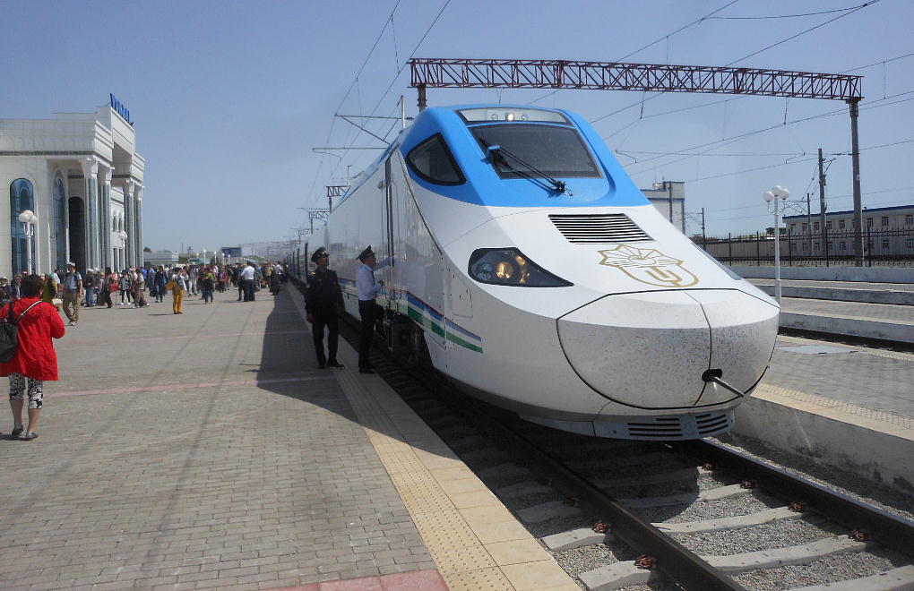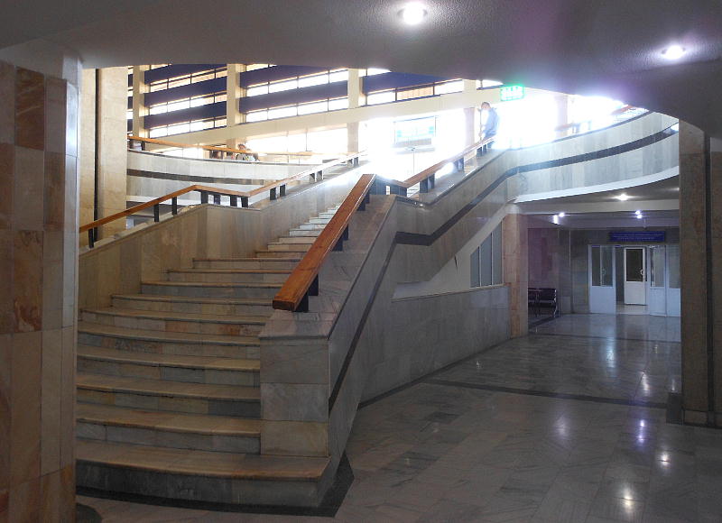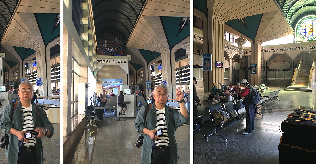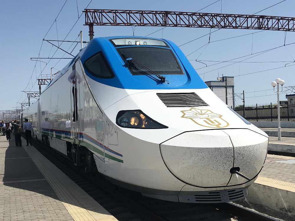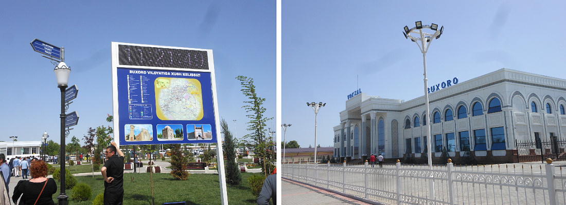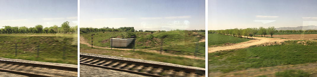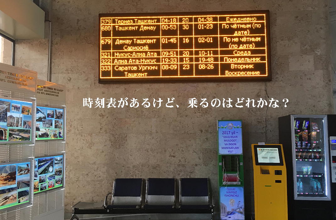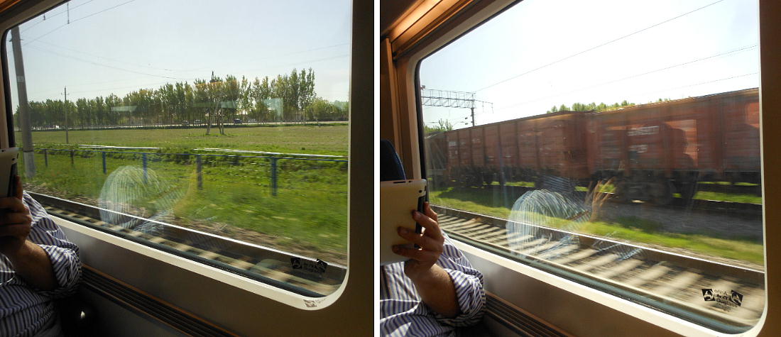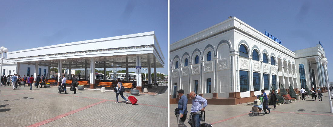 AM 7:00朝食。バスでサマルカンド駅へ向かう。午前中二時間の列車の旅。サマルカンド駅は綺麗だ。 珍しく(と誰もが言っていた)時間通りに列車がホームに入って来た。タシケント発ブハラ行き特急。 3分しか止まらないと言うので、みんな大慌てで列車に乗り込む。成る程、これで旅行ケースをガラ ガラ乗せていたら、3分では間に合わないな。先に運んでおくはずだ。旅行社の便宜でもあるわけか。 特急は快適だった。カフェ車両へ行き、インスタントコーヒーを飲みながら、車窓の風景を楽しんだ。 砂漠チックな風景に木々が疎らに生え、放牧とも放し飼いともとれるような牛の群れが幾つもいた。