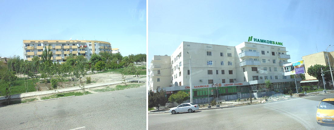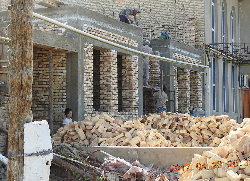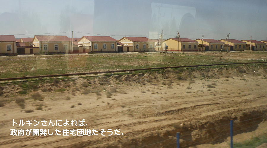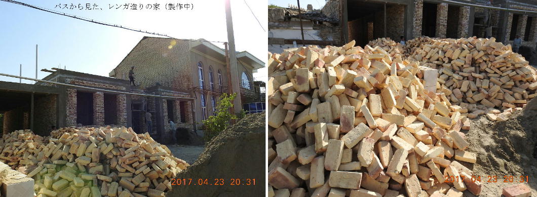 バスの車中から見た、ウズベキスタン住宅の建設現場。柱や鉄骨が在るようには見えない。全部レンガだ。