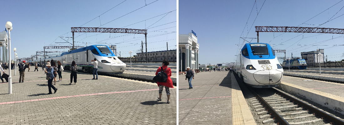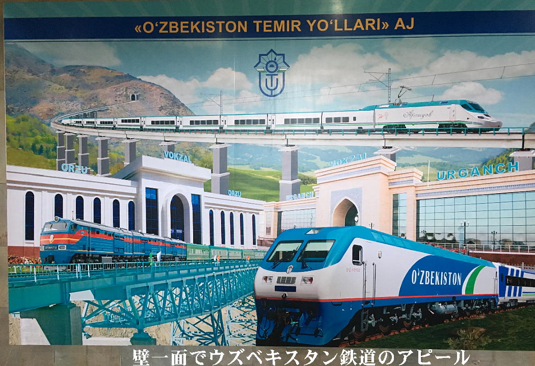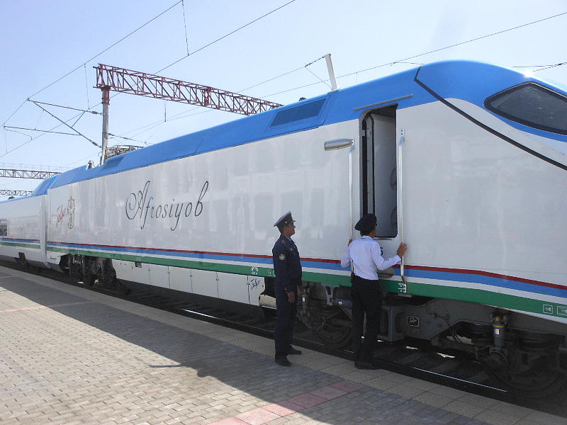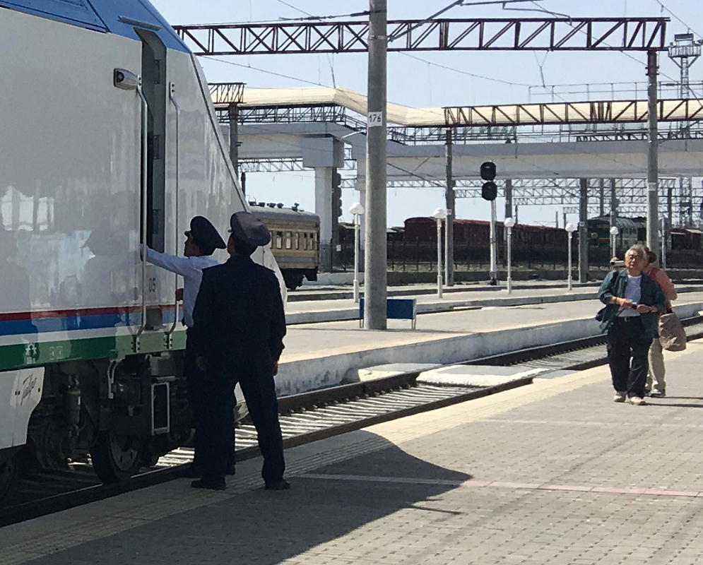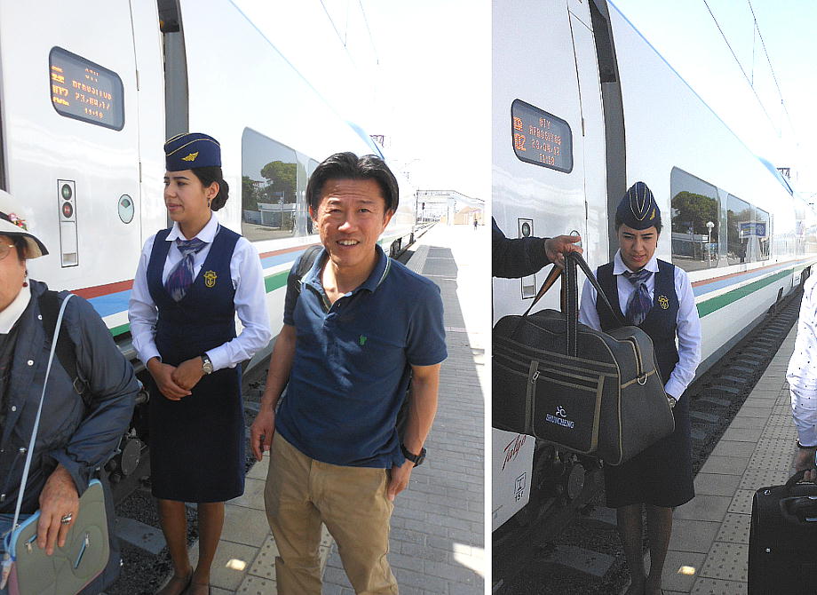 特急の車掌さんと添乗員の原田さん。ウズベキスタンの女子にとっては、電車の車掌はあこがれ の職業らしい。