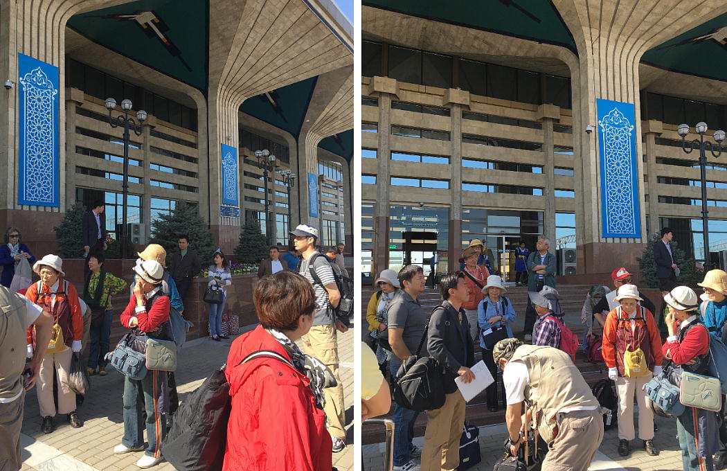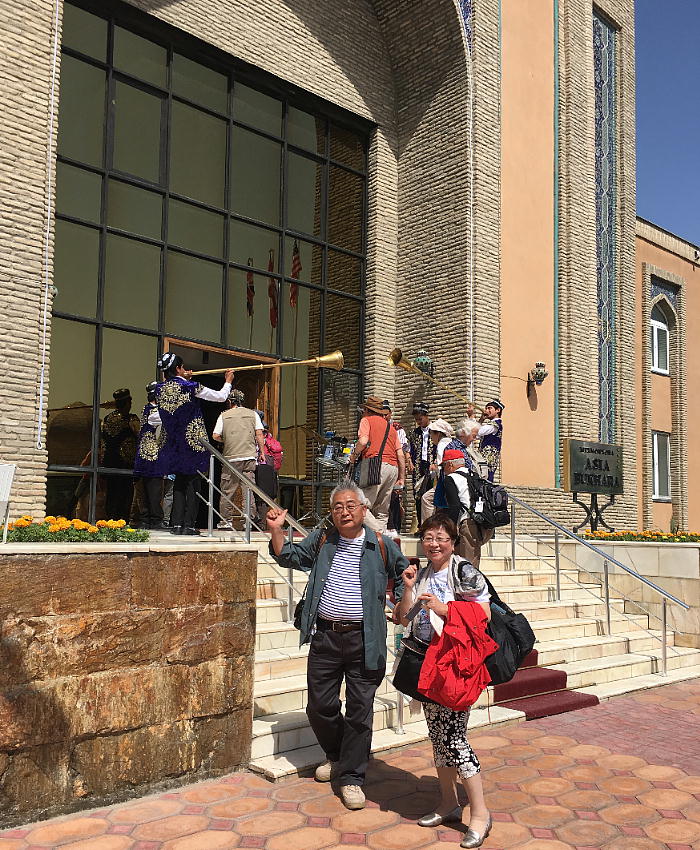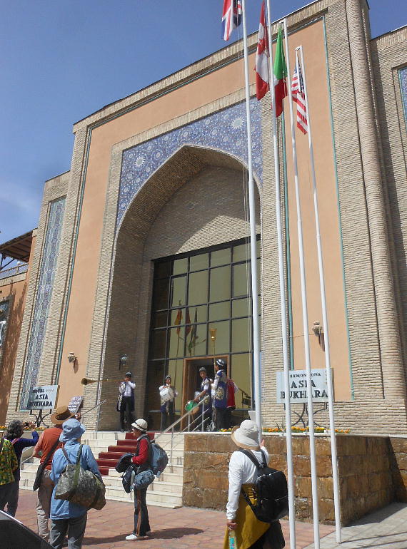 クリックでホテルの全景が見れます。 昨夜は12時迄に荷物を部屋の外へ出したが、何と、早朝荷物だけ先にブハラへ運ぶのだそうだ。 この旅行社は客に荷物を一切運ばせない、と言うか、荷物に触れる事も許さないと言う、全く老人 に優し過ぎるツアーである。一度自分でバスからホテル入り口まで運ぼうとしたら、現地ポーター に止められた。驚いてしまう。空飛ぶ老人ホームとは、けだし、言い得て妙である。