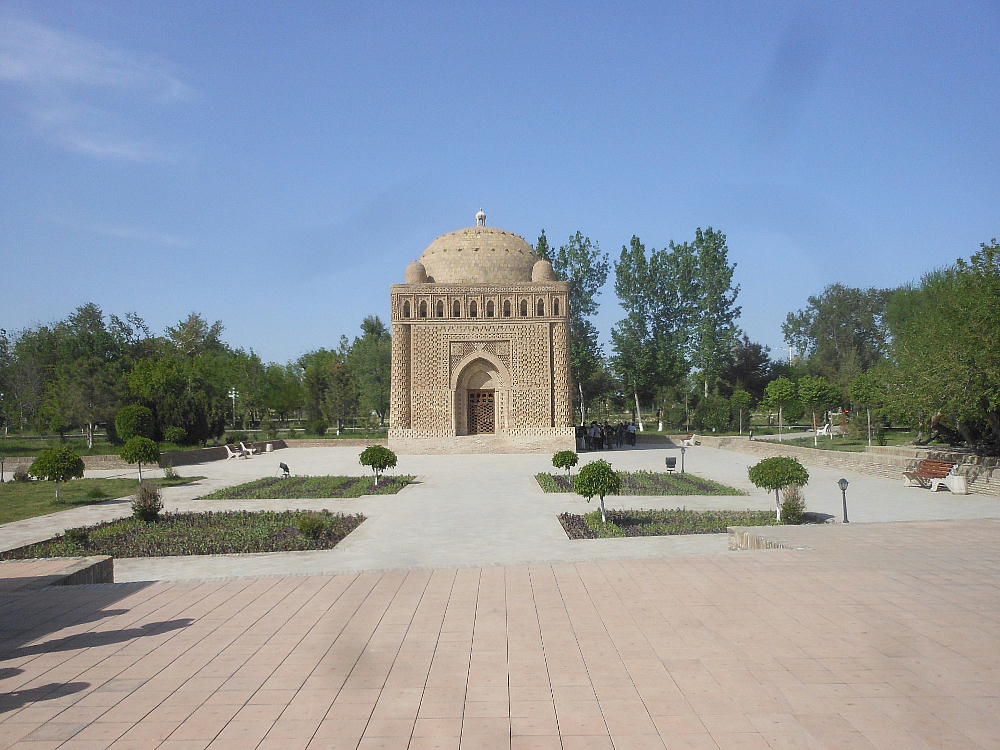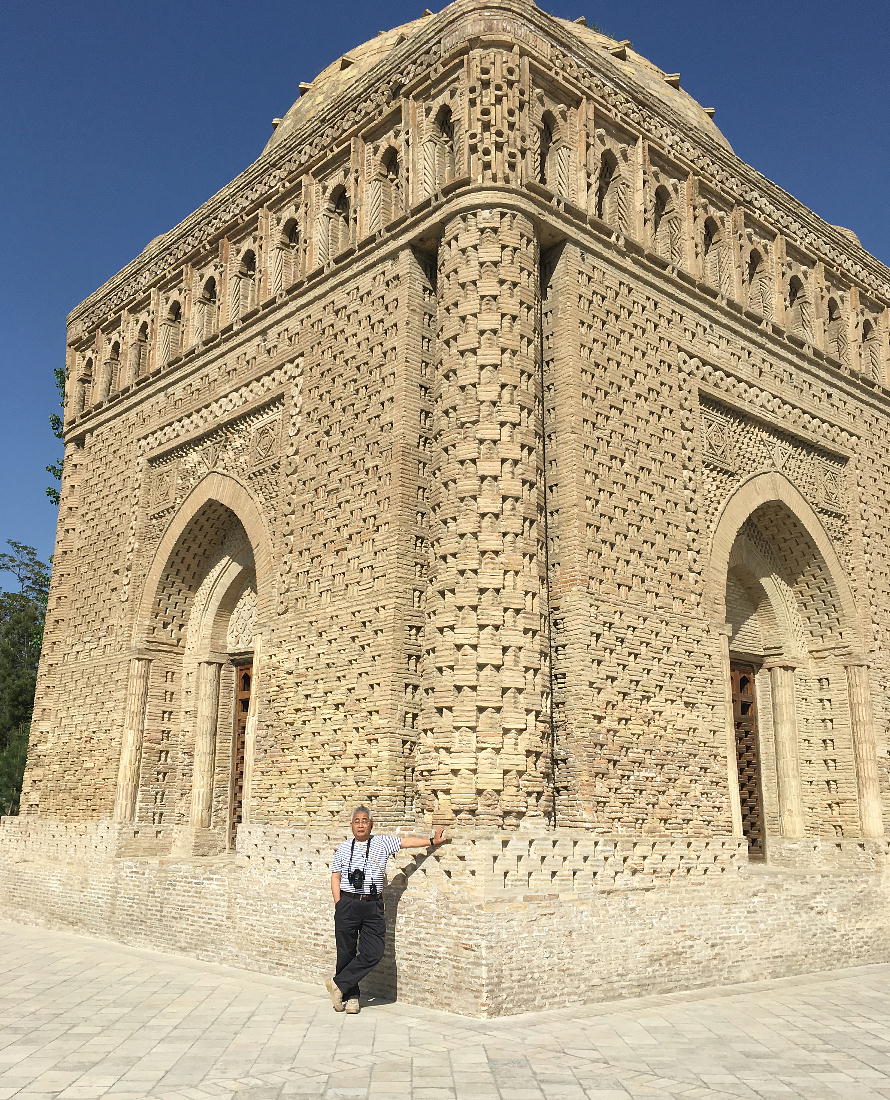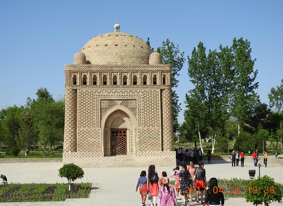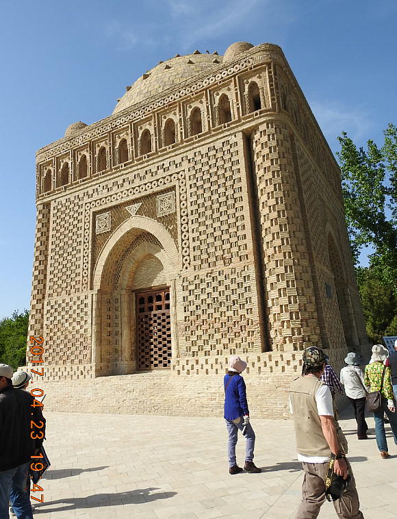 皆さんが今ご覧なっているところはブハラの真珠と言われ、中央アジアで一番古いイスラム建築のイスマイー ル・サーマーニ廟です。廟は素朴な美しさによって世界中の注目を集め、ユネスコの世界遺産になっています。 このサーマーニ廟は、9世紀(874年)にブハラを侵略してサーマーニ国家の首都としたイスマイ−ル・サ ーマーニによって、父親のアフメット・イブン・アサッドのために建てられました。記録によりますと、この廟 は892年から943年まで50年もかけて建てられたということです。 父親のために立てた霊廟ですが、後になって 彼自身もそして、彼の孫も葬られて、サーマーニ朝の王族の霊廟になりました。