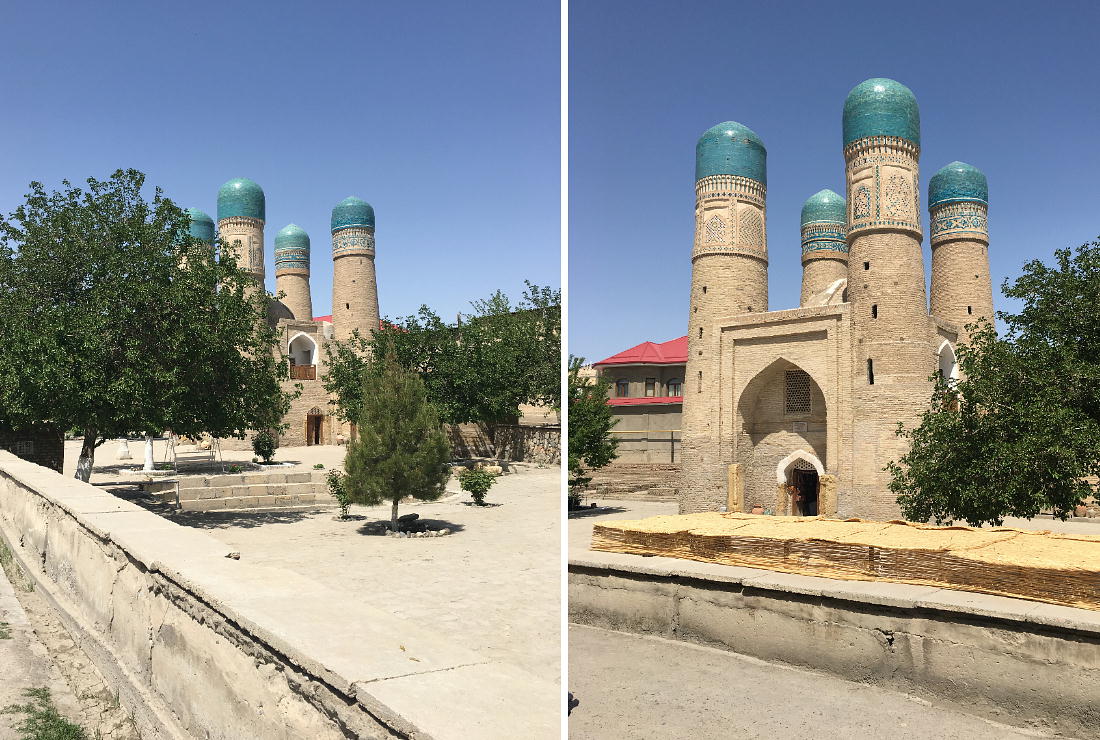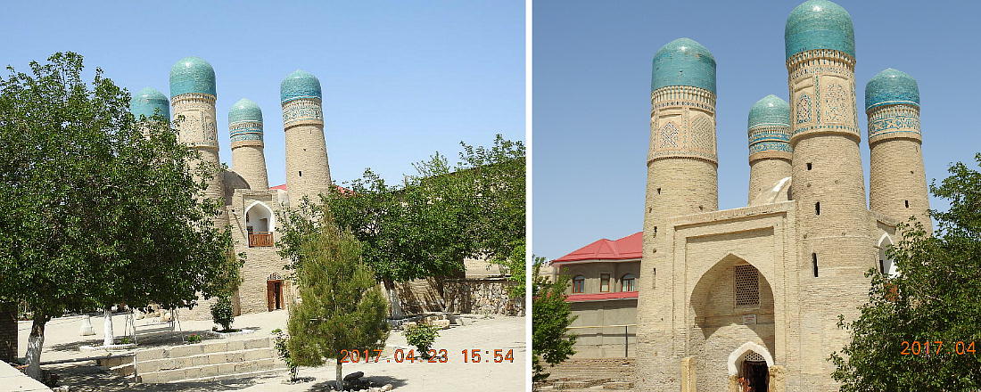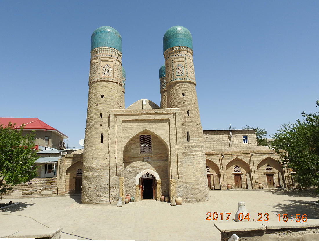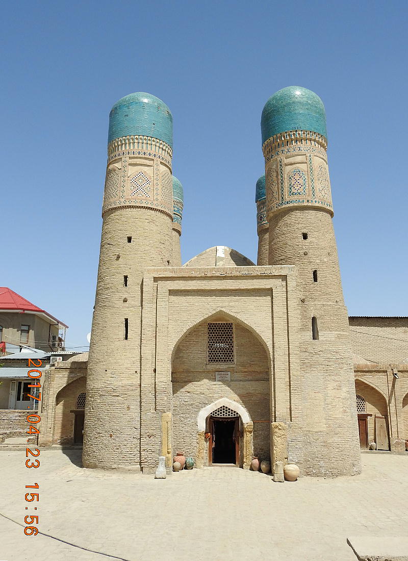 リャビ・ハウズの東北、住宅地の中に絶妙な建築構造で人を驚かせるチョル・ミノル(4つの塔)メドレセが 残存している。このメドレセ(学校)は1807年に豊かなトルクメン(トルコ)人のハリフ・ニヤズクルの 名前で建設された。メドレセ自体の構造は伝統的で両側に一階建てのフジュラが並んでいる中庭、モスク及び 石でできた貯水池である。 廻りに4つのミナレット(塔)があるアーチ型の蒼いドームの建物は、本来メドレセの入り口であった。4つ のミナレットが立ち、その上野小さなドームは蒼いタイルで装飾されている。一つの塔の中には図書室があっ た。(現地で買った案内書より:やや日本語はおかしいが、意味は分かります。)