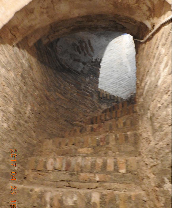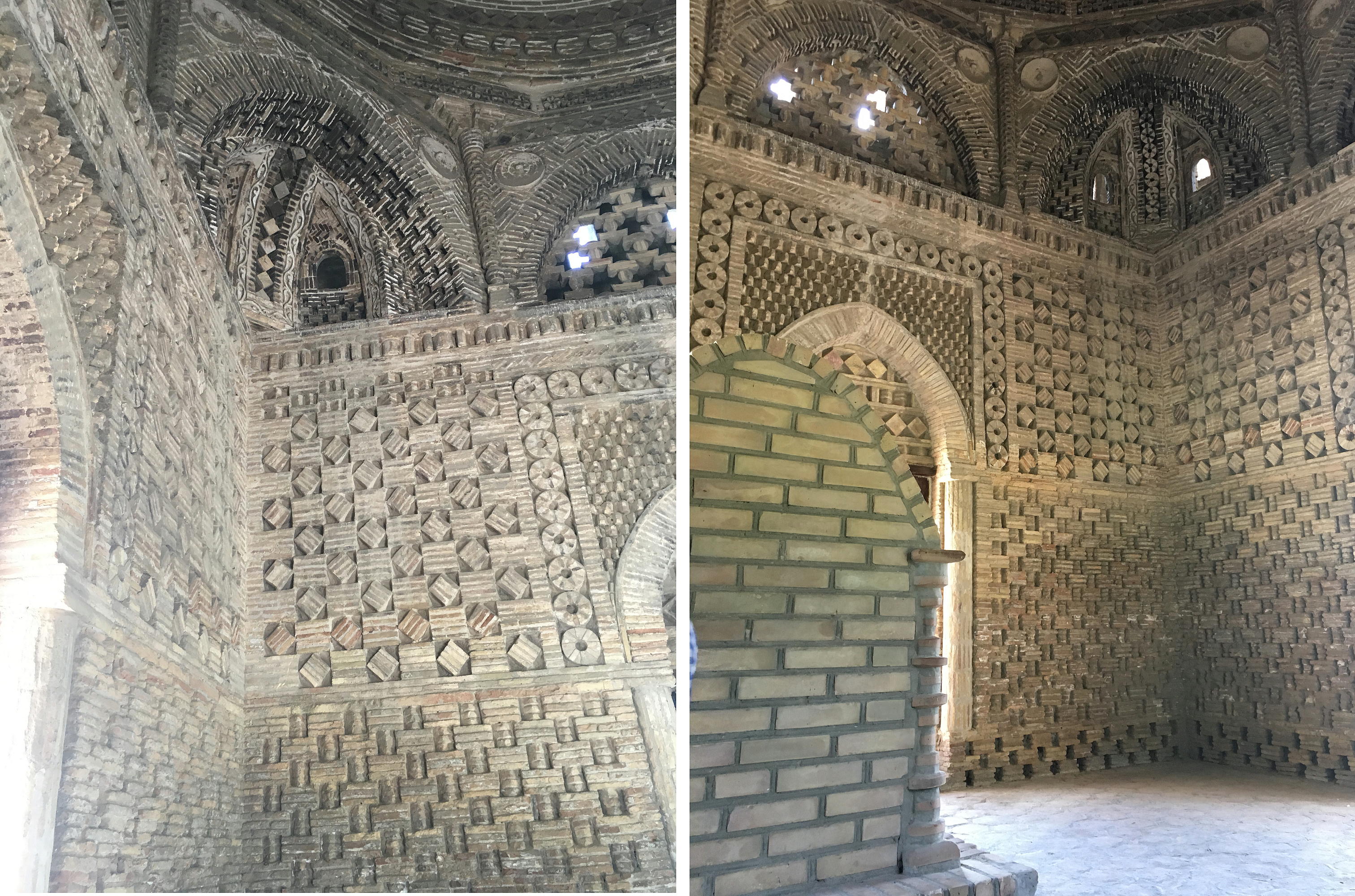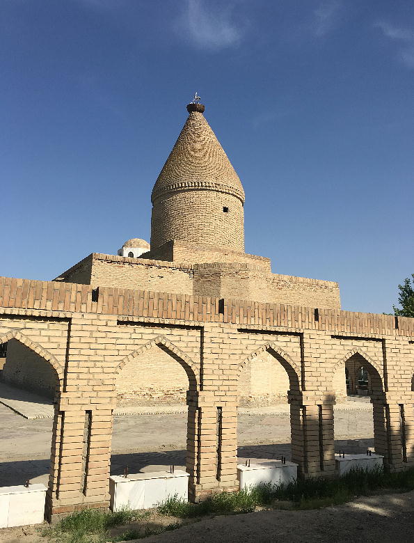 正方形は永遠のシンボルで拝火教(ゾロアスター教)の神殿も同じ形をしていました。正方形から円形に変る のは、人の精神が地上の世界から天の世界に渡ると言う意味があります。 廟は拝火教の神殿の近くに建てられ たという可能性もあります。 この廟には焼いたレンガが初めて使われ、非常に重要な初期イスラーム建築の一つになっています。外装は三 つの部分にわかれています。まず、地下の世界、二つ目は、 我々が生きている世界で、レンガの積み上げ方が 色々ありますが、これは、この世はさまざまだという意味です。