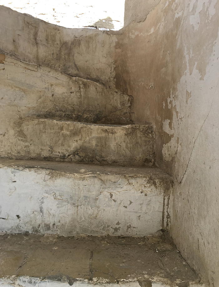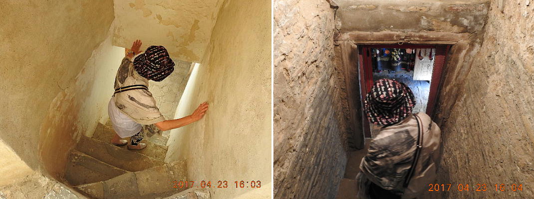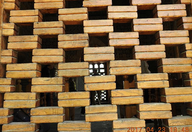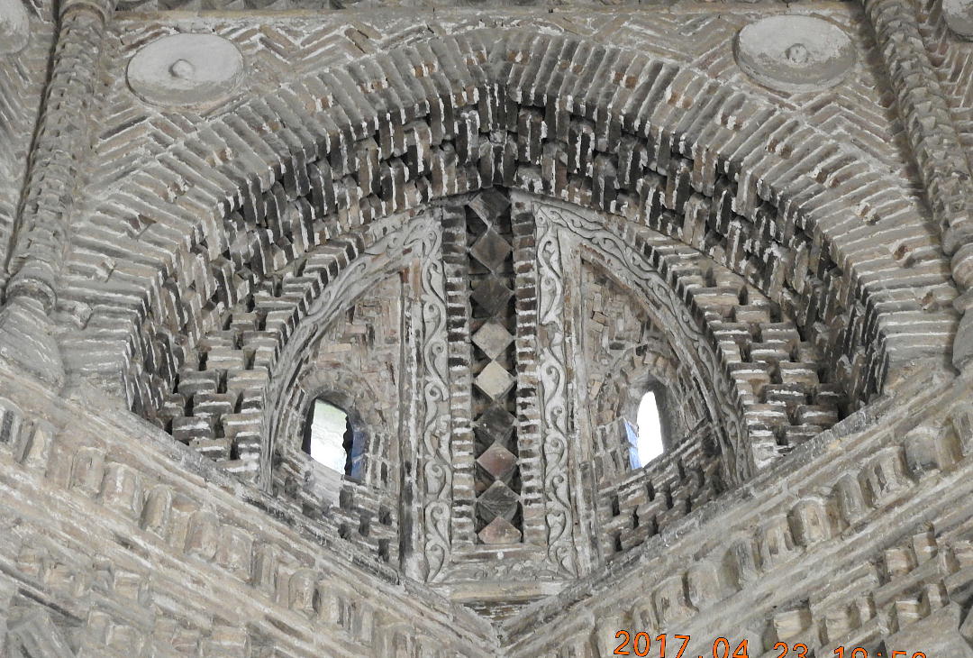 ドアの上、この三角は地下の世に向かっていて、土の下に世界があってそれは地獄を表しています。廟全体の 形は四角形です。三つ目は空、つまり天の国を表していて、空が地面を抱えんでいます。ドームは太陽の家なの です。ドームから出ているレンガは二つの意味を持っています。第一に太陽の光で、第二は邪悪な視線を防ぐ お守りです。この九つの小さい窓は精神の入口で、廟の中を照らすためにも必要でした。四本の柱は世界の四 つの方角を表しています。