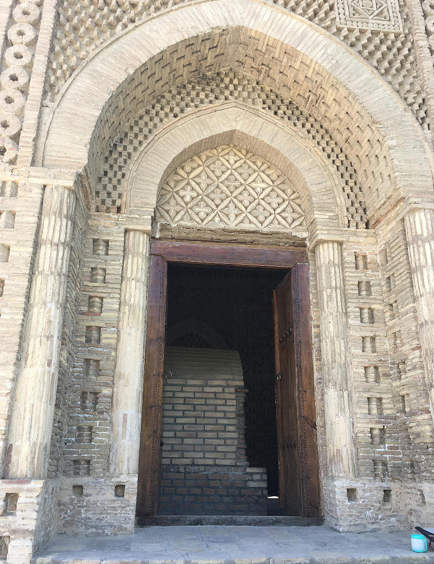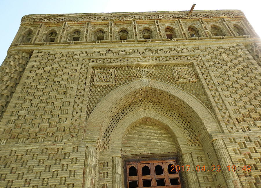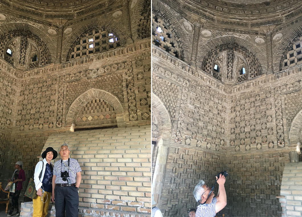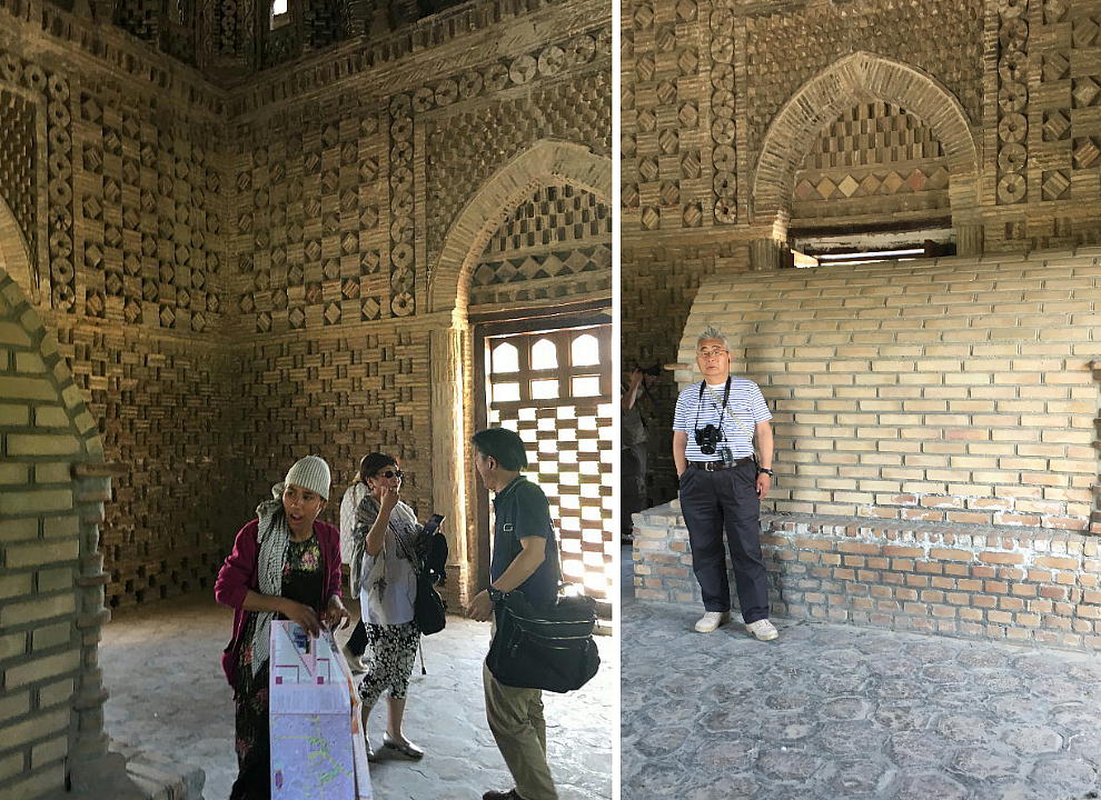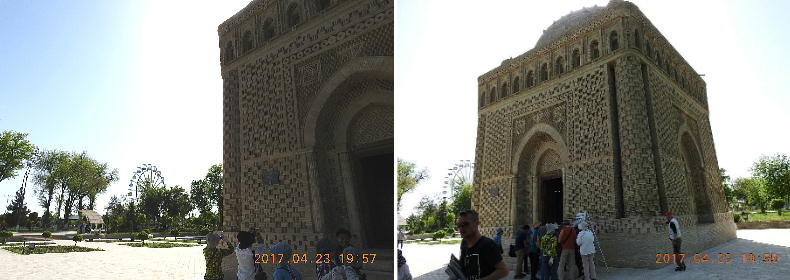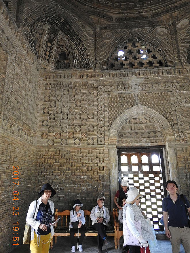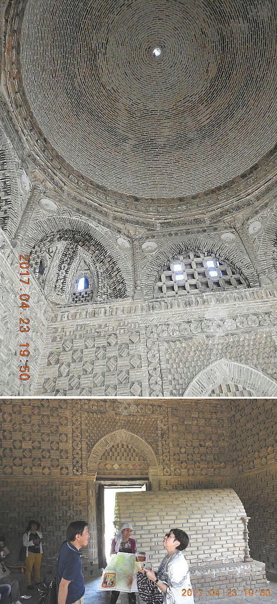 13世紀にブハラがチンギスハンによって破壊された時に、この廟は破壊を免れました。それは土の中に埋もれて いて、周りが墓地だったため、チンギスハンが気づかなかったからです。ここはムスリム人の最初の墓地でした。 霊廟は立方体の形をして、どの方向から見ても同じ正面に見えます。 壁の厚さはなんと1.8mもあります。サーマ ーニ廟は拝火教の神殿の形をしています。それは、その頃アラブの建築様式がまだなかったからです。廟の4 面全部に入口がありますが、それはもてなしの心を表しています。廟の下は正方形で地面上は円形で空を表し ています。