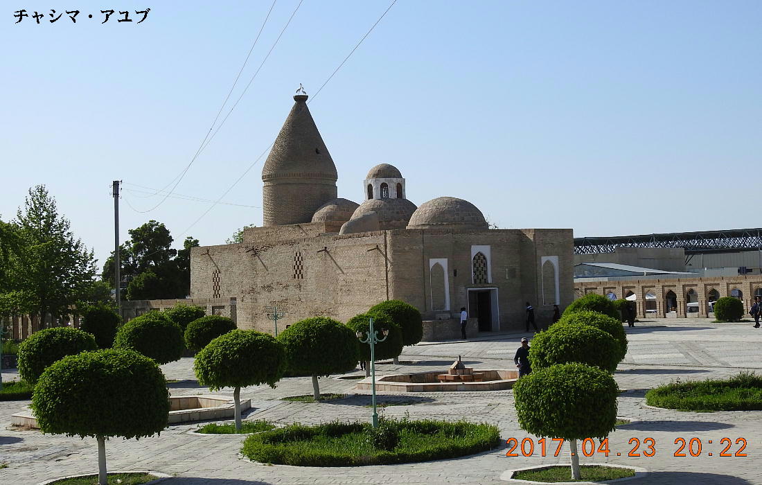 チャシマ・アユブ(現地で買った案内書より。) チャシマ・アユブ(ヨブ予言者の「井戸」)はブハラの最も古い遺跡の一つである。伝説によると、コーラン でアユブ預言者と呼ばれる聖者ヨブが一度この場所を訪問したと書かれている。彼が棒を打ち据えると、井戸 (チャシマ)ができたそうである。別の伝説によると、これはヨブの聖書の本で言及されており、アユブが沐 浴をして受難から解放された泉であるという。とにかく、アユブと関連する何らかに出来事がブハラの誕生と ここでのユダヤ人の出現に影響を与えたと言える。  前イスラム教の時代に、チャシマ・アユブは既にブハラの仙骨の中心地であり、その隣には「ナウカンド」 の墓地が造られた。しかし、井戸の築後年数は未知のままである。 チャシマ・アユブというイスラム教の墓地は、12世紀前にここで造られた。建物の上にある碑文は、この建 物がアムール・チムールの治世(1370−1405)に建設されたと指摘している。アユブの井戸は中央の ホールに位置している。その後ろに、まだ知られていない人々の墓が安置されている地下室がある。建物の特 徴としては円錐のドームが挙げられる。それはおそらくアムール・チムールがホレムズから強制的に連れてき た建築家によって建設されたと予想されている。