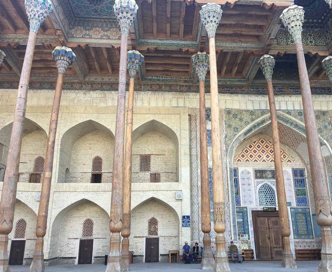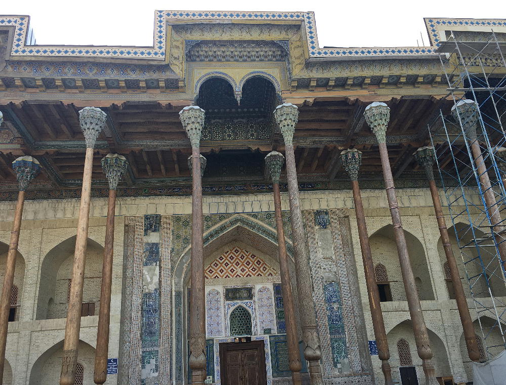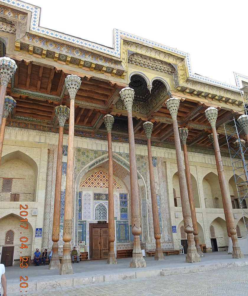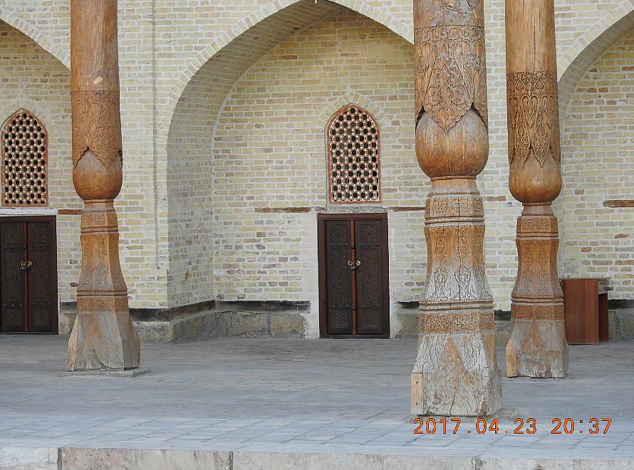 ボロ(バラ)・ハウズ・モスク(現地で買った案内書より。) 過去のレギスタン広場には、多数の美しい建物があったが、現在まで残存しているのは、中世のブハラの唯一 の記念碑ボロ・ハウズ・モスクである。このアンサンブルは、カジャン・モスクの次に都市の2番目のジュマ・ ムスク(1712年に建設された)の周りに造られた。その南と北にフジュラがあるメドレセの中庭がついて いる。マジョリカでできている碑文が残っているモスクの入り口は、アルクの門に向かっている。