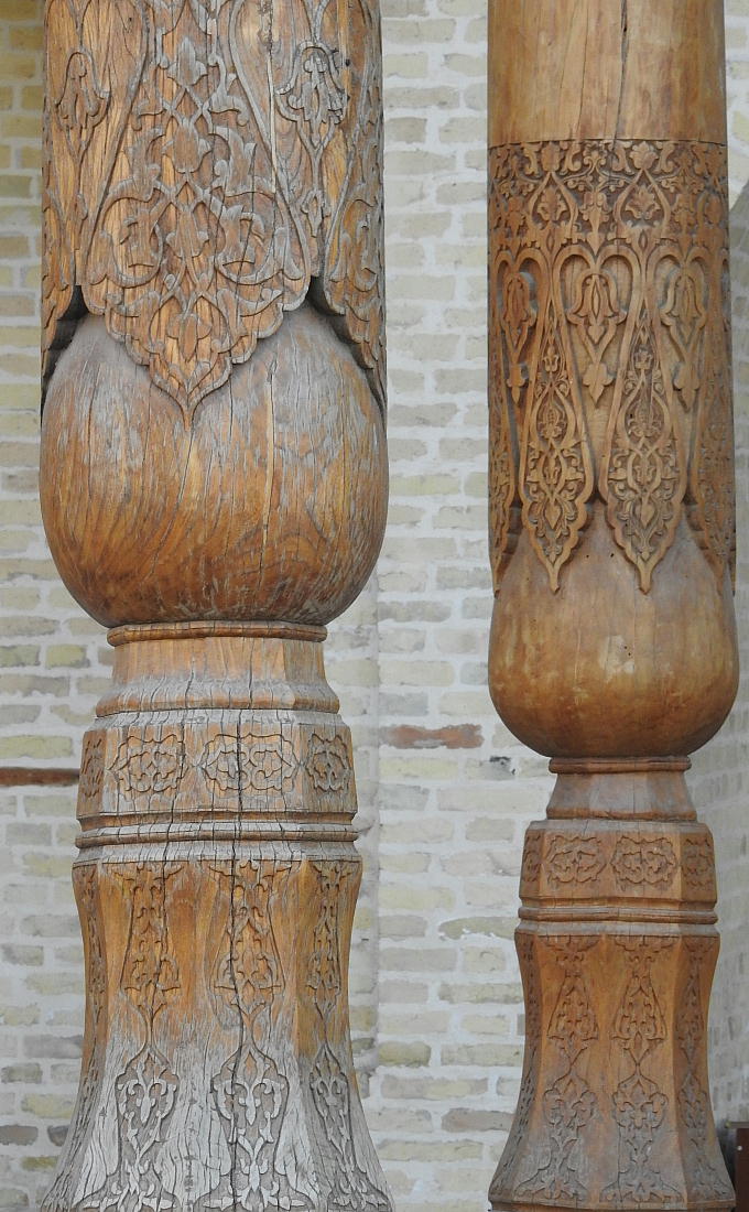 モスクの顕著な特徴は、20本の木製の柱が支えるアイウ”アンの装飾である。二つの木の幹をつないで、よ り長い柱ができている。鍾乳石形のキャツプには多彩の色のペンキが塗られている。大梁は、天上を多色の正 方形の部分に区分する。その一部は独特の特徴を持ち、職人の傑作となっている。