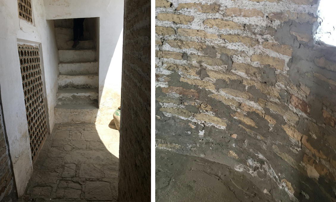 壁は四角の連続ですが、それは地球がいつも回っていることを表しています。上の円形は太陽で角にある草は 木の命を表しています。ここには陶器が使われていませんが様々な種類の粘土で作られた焼きレンガはそれぞ れ色が違って見えます。長い年月にも耐えて、この廟がいい状態で保存されているのは建築材料の質が高かっ たからでしょう。