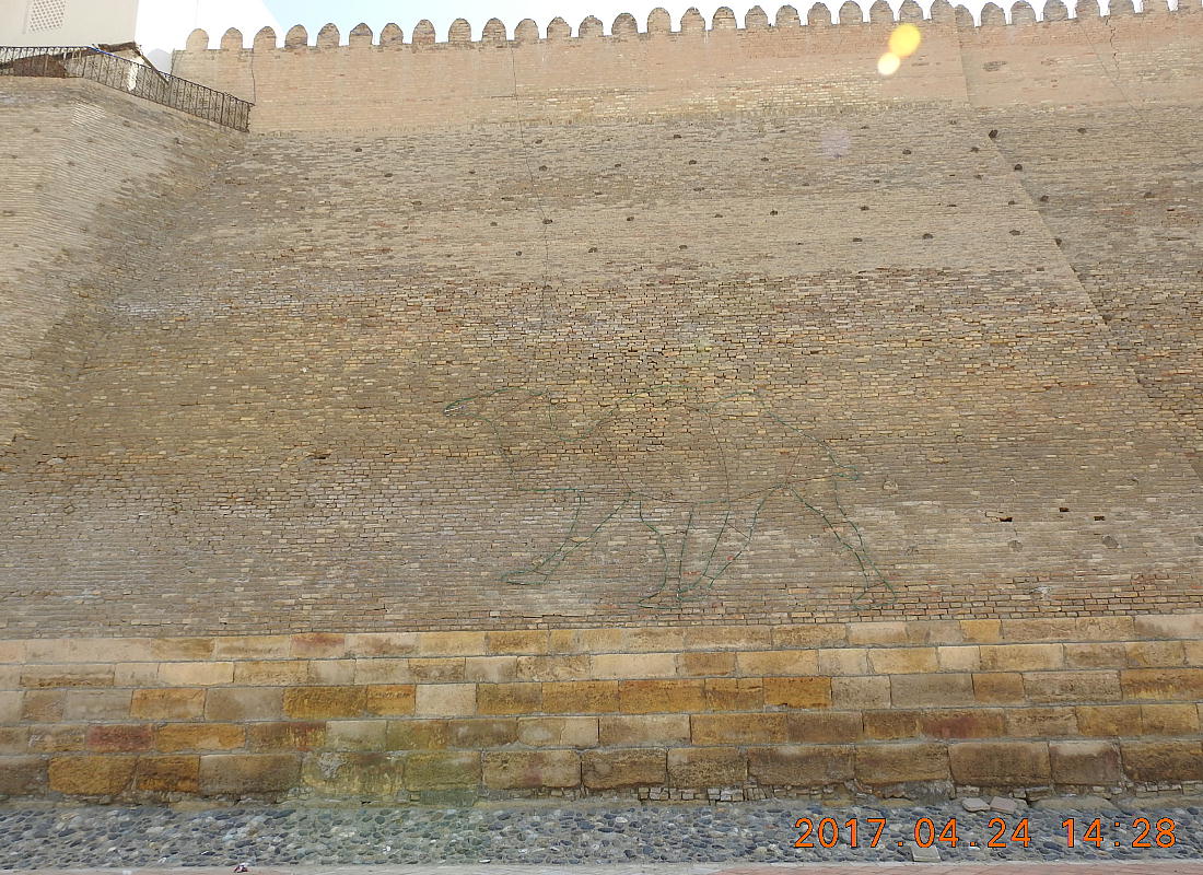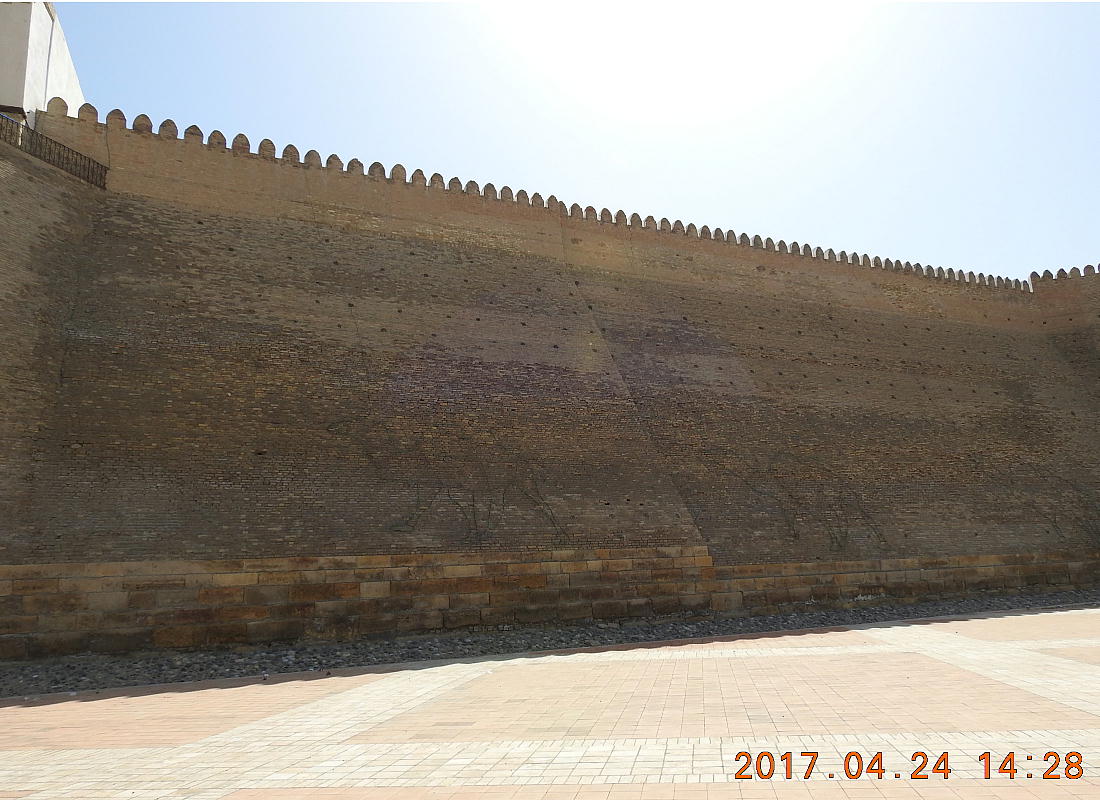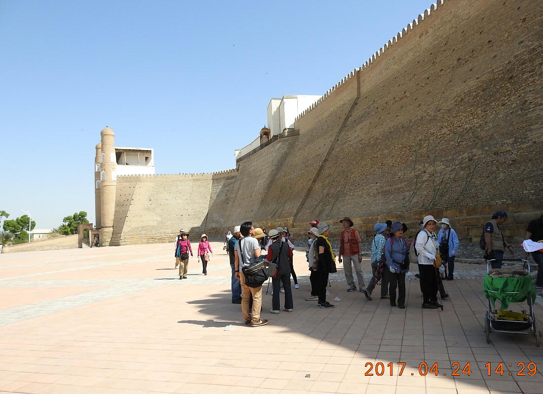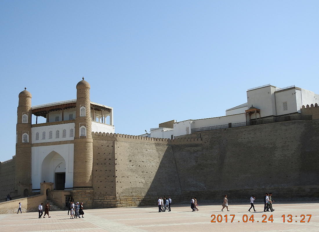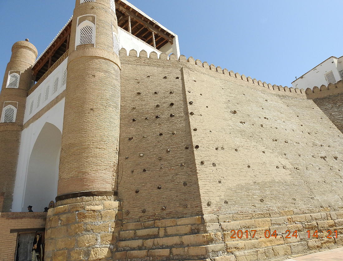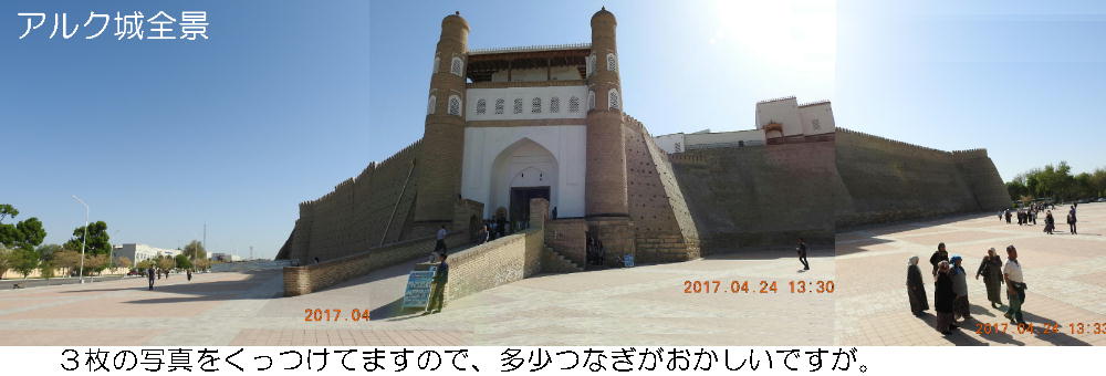 2017.4.24.(月) ウズベキスタン4日目 上はクリックで拡大します。 ウズベキスタン南東部の都市ブハラの旧市街にある。1920年のソビエト軍により攻略される まで、ブハラ・ハン国の歴代ハンの居城として使われていた。現在の建物は18世紀に再建さ れたもので、内部は博物館になっている。4ヘクタールの城域内、高さ18m−20mにある広場 には、アミール(為政者、王)の宮殿、モスク、財務局、政府行政局などがあり、刑務所ま であった。 アルク城は要塞(Ark Fortress)でもある。王の居城であると同時に、外敵に備えた大規模 な要塞構造となっている。18−19世紀に、都市国家ブハラ・ハン国の中心となっていた。 1920年にソ連軍によって陥落されるまでは、都市国家を守る要塞としての役割をもっていた。 上はクリックで超拡大します。 アルク城は当初の要塞計画では、西から東へ細長い矩形をしていた。アルク城の外壁の周囲 は789.6メートル。また面積は3.96ヘクタールあり、外壁で囲まれている。外壁の高さは16. 20メートルあるが、この高さは場所によって異なっている。 アルク城の築造年代は正確には分かっていまないが、6世紀初頭にはすでに地元の支配者の住居 であったと推察されている。現在、アルク城が建っている場所は、古代ブハラの発祥の地と言 われており、少なくとも紀元前から存在していたようである。 発掘調査によると、アルク城は紀元前4世紀から存在していたとされている。そのアルク城は アラブ、チンギスハーン(モンゴル)、ソビエト(ロシア)など何度も外敵により破壊されて は建て直されており、現存するアルク城は18世紀に構築された。 アルク城前の広大な広場は、サマルカンドと同じくレギスタン広場といい、かつては公開処刑場 として犯罪者のみならず、ブハラ・ハンの政治に異議を申し立て反抗した市民たちの首も切り落 としていた場所である。 アルク城は土の要塞である。レンガを積み重ねて堅固な外壁を構築している。現在の建物のアー チの下20mの深さの層に昔の遺跡があり、その上に要塞を構築していたと推定される。 アルクへの入り口は塔のある門で、その入り口から屋根のあるギャラリーが内部へ続いている。 現在はその内部に土産物屋や露店が軒を連ねている。かっては入り口の上に「むち」が飾られて いて、アミール(王)の無限の力の象徴だった。 通路の両側には、ガラスケースに入った展示品が飾られている。使用された土器や服装、武器な どが並んでいる。 上はクリックで拡大します。 上はクリックで拡大します。 壁の一部にはラクダなどの絵が、レンガを削り込んで描かれている。 上写真中央の白い建物が、ブハラ王が公開処刑を見届けるための監視台である。 城壁には、水抜きの穴とともに、足場用の木の棒がささっているのが見える。これはウズベキ スタンの多くの大型建物に見られる構造である。どうやら、城壁を建築、修復する際に足場と して使われたもののようである。 赤軍の攻撃によってアルク上の大部分が破壊され、かってはアルク上の7割が荒れ地となって いた。当時のもので残存しているのは、木製のアイウ"アンのあるジュマ・モスク、クシベギ (首相)の公邸、王位のホールなどである。城壁内には、王、及びその軍事指導者そして多数 の使用人が住んでいた。アルク城は石や泥ではなく木造の建築物が中心だった。 7世紀にはフタ・ハウタンという女王が、このアルク城の砦でアラブ軍と戦ったとされている。 モンゴル軍が襲来してきた時、多くの住民がアルク城に立てこもり抵抗したが、結局チンギス ・ハーンによって住民は虐殺され、同時に城も破壊されている。 上はクリックしていただけば、超拡大します。 その後も何度も外敵に襲われた。アルク城は破壊と修復を繰り返してきたが、ロシア革命後の 1920年、ソビエト赤軍による爆撃によりほぼ城全体が崩壊し、現在は石造りの部分のみが往事 の面影を残している。
