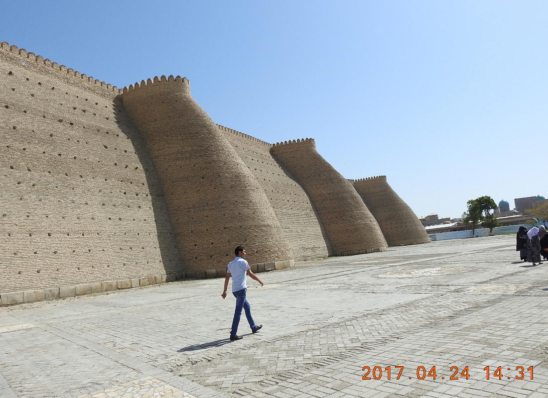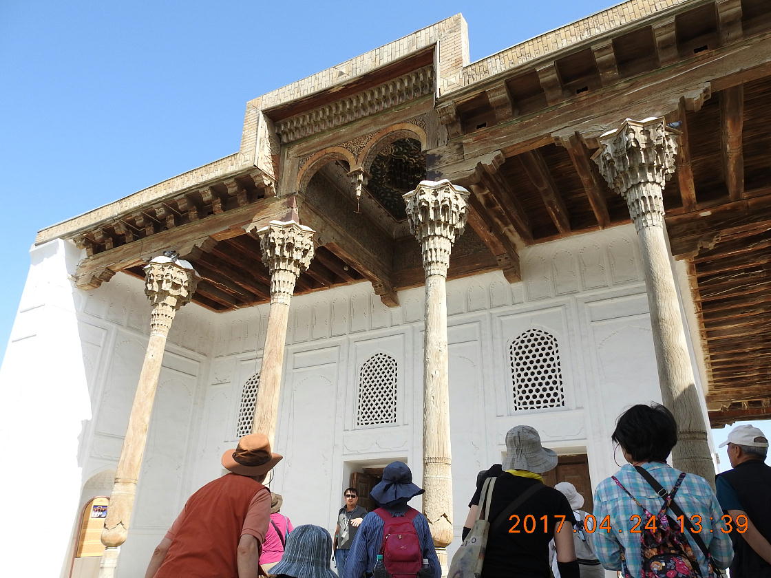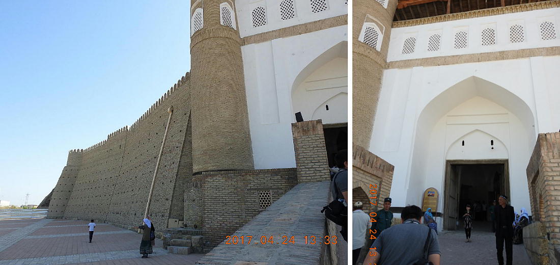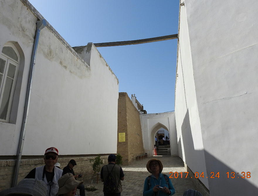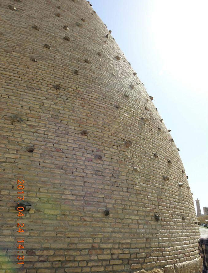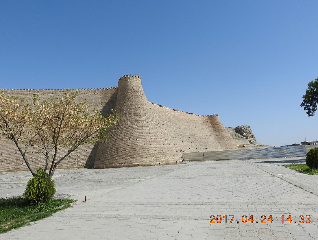 2017.4.24.(月) ウズベキスタン4日目 上はクリックで拡大します。 ウズベキスタン南東部の都市ブハラの旧市街にある。1920年のソビエト軍により攻略される まで、ブハラ・ハン国の歴代ハンの居城として使われていた。現在の建物は18世紀に再建さ れたもので、内部は博物館になっている。4ヘクタールの城域内、高さ18m−20mにある広場 には、アミール(為政者、王)の宮殿、モスク、財務局、政府行政局などがあり、刑務所ま であった。 アルク城は要塞(Ark Fortress)でもある。王の居城であると同時に、外敵に備えた大規模 な要塞構造となっている。18−19世紀に、都市国家ブハラ・ハン国の中心となっていた。 1920年にソ連軍によって陥落されるまでは、都市国家を守る要塞としての役割をもっていた。 上はクリックで超拡大します。 アルク城は当初の要塞計画では、西から東へ細長い矩形をしていた。アルク城の外壁の周囲 は789.6メートル。また面積は3.96ヘクタールあり、外壁で囲まれている。外壁の高さは16. 20メートルあるが、この高さは場所によって異なっている。 アルク城の築造年代は正確には分かっていまないが、6世紀初頭にはすでに地元の支配者の住居 であったと推察されている。現在、アルク城が建っている場所は、古代ブハラの発祥の地と言 われており、少なくとも紀元前から存在していたようである。 発掘調査によると、アルク城は紀元前4世紀から存在していたとされている。そのアルク城は アラブ、チンギスハーン(モンゴル)、ソビエト(ロシア)など何度も外敵により破壊されて は建て直されており、現存するアルク城は18世紀に構築された。 アルク城前の広大な広場は、サマルカンドと同じくレギスタン広場といい、かつては公開処刑場 として犯罪者のみならず、ブハラ・ハンの政治に異議を申し立て反抗した市民たちの首も切り落 としていた場所である。 アルク城は土の要塞である。レンガを積み重ねて堅固な外壁を構築している。現在の建物のアー チの下20mの深さの層に昔の遺跡があり、その上に要塞を構築していたと推定される。 アルクへの入り口は塔のある門で、その入り口から屋根のあるギャラリーが内部へ続いている。 現在はその内部に土産物屋や露店が軒を連ねている。かっては入り口の上に「むち」が飾られて いて、アミール(王)の無限の力の象徴だった。 通路の両側には、ガラスケースに入った展示品が飾られている。使用された土器や服装、武器な どが並んでいる。 上はクリックで拡大します。 上はクリックで拡大します。 壁の一部にはラクダなどの絵が、レンガを削り込んで描かれている。 上写真中央の白い建物が、ブハラ王が公開処刑を見届けるための監視台である。 城壁には、水抜きの穴とともに、足場用の木の棒がささっているのが見える。これはウズベキ スタンの多くの大型建物に見られる構造である。どうやら、城壁を建築、修復する際に足場と して使われたもののようである。 赤軍の攻撃によってアルク上の大部分が破壊され、かってはアルク上の7割が荒れ地となって いた。当時のもので残存しているのは、木製のアイウ"アンのあるジュマ・モスク、クシベギ (首相)の公邸、王位のホールなどである。城壁内には、王、及びその軍事指導者そして多数 の使用人が住んでいた。アルク城は石や泥ではなく木造の建築物が中心だった。 7世紀にはフタ・ハウタンという女王が、このアルク城の砦でアラブ軍と戦ったとされている。 モンゴル軍が襲来してきた時、多くの住民がアルク城に立てこもり抵抗したが、結局チンギス ・ハーンによって住民は虐殺され、同時に城も破壊されている。 上はクリックしていただけば、超拡大します。 その後も何度も外敵に襲われた。アルク城は破壊と修復を繰り返してきたが、ロシア革命後の 1920年、ソビエト赤軍による爆撃によりほぼ城全体が崩壊し、現在は石造りの部分のみが往事 の面影を残している。