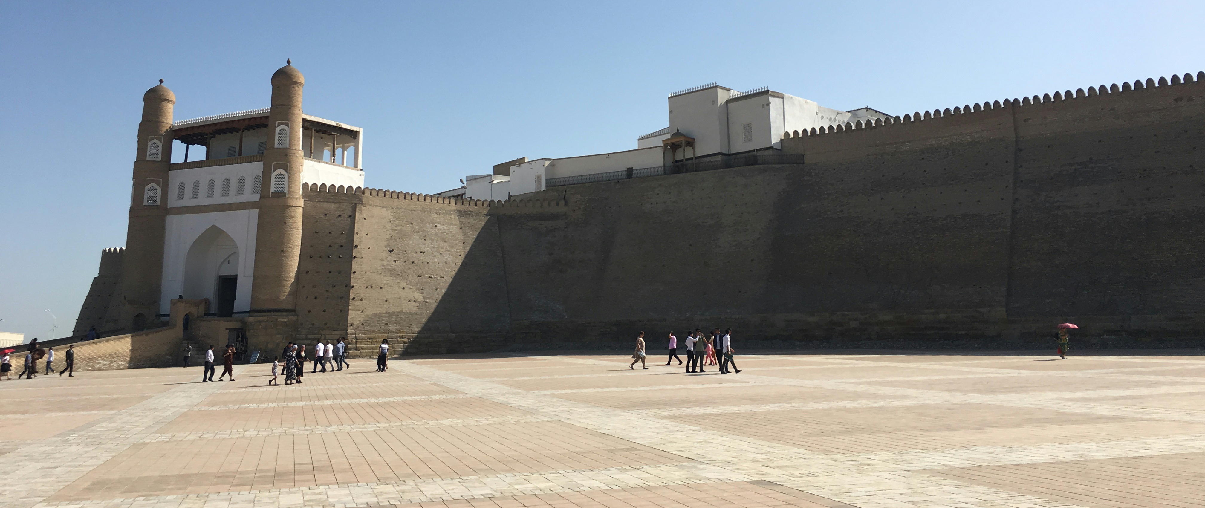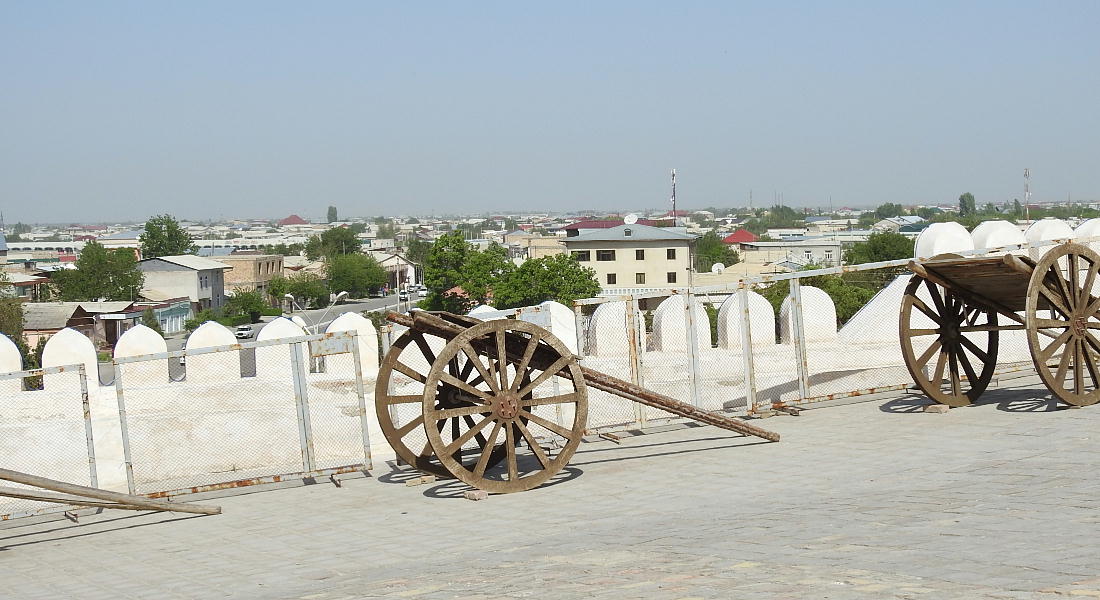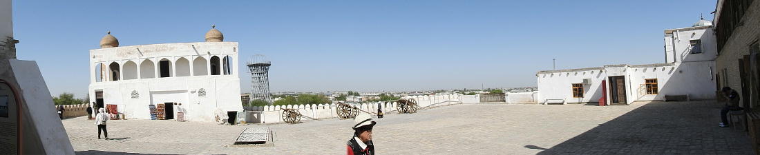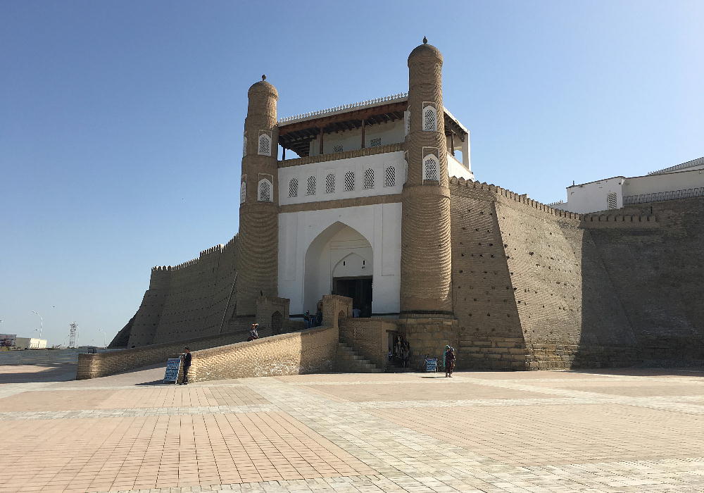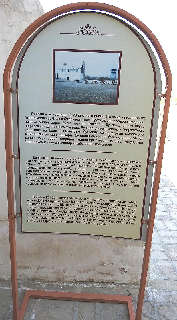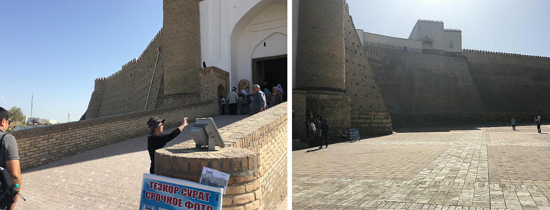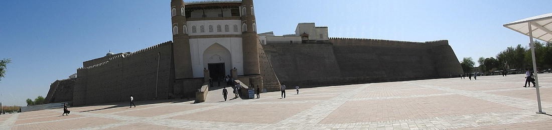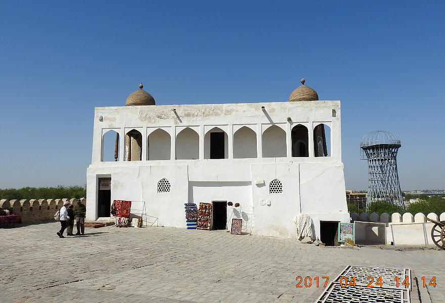 2017.4.24.(月) ウズベキスタン4日目 上はクリックで拡大します。 ウズベキスタン南東部の都市ブハラの旧市街にある。1920年のソビエト軍により攻略される まで、ブハラ・ハン国の歴代ハンの居城として使われていた。現在の建物は18世紀に再建さ れたもので、内部は博物館になっている。4ヘクタールの城域内、高さ18m−20mにある広場 には、アミール(為政者、王)の宮殿、モスク、財務局、政府行政局などがあり、刑務所ま であった。 アルク城は要塞(Ark Fortress)でもある。王の居城であると同時に、外敵に備えた大規模 な要塞構造となっている。18−19世紀に、都市国家ブハラ・ハン国の中心となっていた。 1920年にソ連軍によって陥落されるまでは、都市国家を守る要塞としての役割をもっていた。 上はクリックで超拡大します。 アルク城は当初の要塞計画では、西から東へ細長い矩形をしていた。アルク城の外壁の周囲 は789.6メートル。また面積は3.96ヘクタールあり、外壁で囲まれている。外壁の高さは16. 20メートルあるが、この高さは場所によって異なっている。 アルク城の築造年代は正確には分かっていまないが、6世紀初頭にはすでに地元の支配者の住居 であったと推察されている。現在、アルク城が建っている場所は、古代ブハラの発祥の地と言 われており、少なくとも紀元前から存在していたようである。 発掘調査によると、アルク城は紀元前4世紀から存在していたとされている。そのアルク城は アラブ、チンギスハーン(モンゴル)、ソビエト(ロシア)など何度も外敵により破壊されて は建て直されており、現存するアルク城は18世紀に構築された。 アルク城前の広大な広場は、サマルカンドと同じくレギスタン広場といい、かつては公開処刑場 として犯罪者のみならず、ブハラ・ハンの政治に異議を申し立て反抗した市民たちの首も切り落 としていた場所である。 アルク城は土の要塞である。レンガを積み重ねて堅固な外壁を構築している。現在の建物のアー チの下20mの深さの層に昔の遺跡があり、その上に要塞を構築していたと推定される。 アルクへの入り口は塔のある門で、その入り口から屋根のあるギャラリーが内部へ続いている。 現在はその内部に土産物屋や露店が軒を連ねている。かっては入り口の上に「むち」が飾られて いて、アミール(王)の無限の力の象徴だった。 通路の両側には、ガラスケースに入った展示品が飾られている。使用された土器や服装、武器な どが並んでいる。 上はクリックで拡大します。 上はクリックで拡大します。 壁の一部にはラクダなどの絵が、レンガを削り込んで描かれている。 上写真中央の白い建物が、ブハラ王が公開処刑を見届けるための監視台である。 城壁には、水抜きの穴とともに、足場用の木の棒がささっているのが見える。これはウズベキ スタンの多くの大型建物に見られる構造である。どうやら、城壁を建築、修復する際に足場と して使われたもののようである。 赤軍の攻撃によってアルク上の大部分が破壊され、かってはアルク上の7割が荒れ地となって いた。当時のもので残存しているのは、木製のアイウ"アンのあるジュマ・モスク、クシベギ (首相)の公邸、王位のホールなどである。城壁内には、王、及びその軍事指導者そして多数 の使用人が住んでいた。アルク城は石や泥ではなく木造の建築物が中心だった。 7世紀にはフタ・ハウタンという女王が、このアルク城の砦でアラブ軍と戦ったとされている。 モンゴル軍が襲来してきた時、多くの住民がアルク城に立てこもり抵抗したが、結局チンギス ・ハーンによって住民は虐殺され、同時に城も破壊されている。 上はクリックしていただけば、超拡大します。 その後も何度も外敵に襲われた。アルク城は破壊と修復を繰り返してきたが、ロシア革命後の 1920年、ソビエト赤軍による爆撃によりほぼ城全体が崩壊し、現在は石造りの部分のみが往事 の面影を残している。