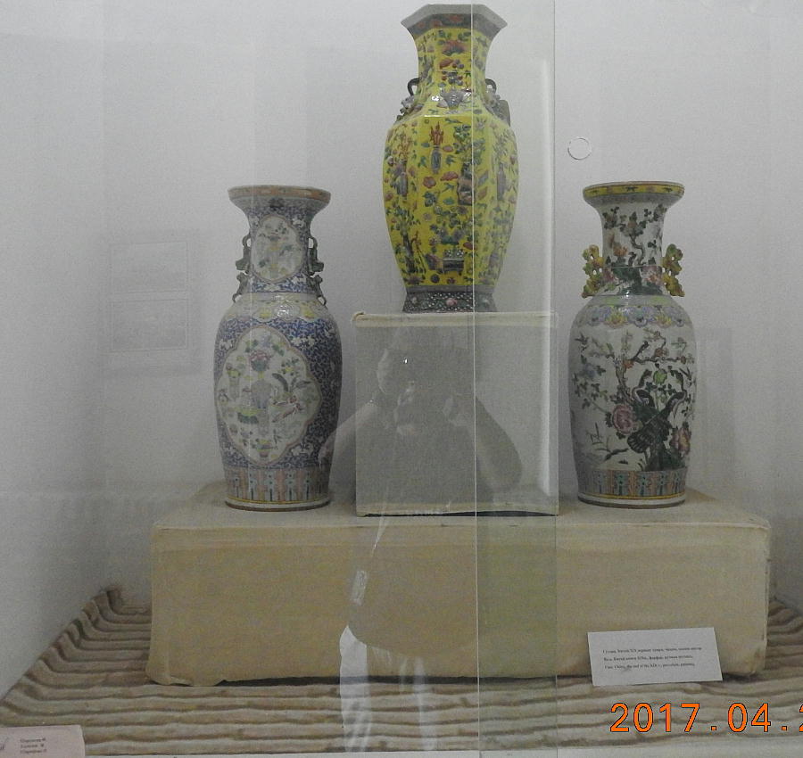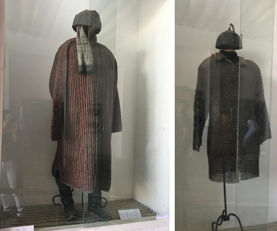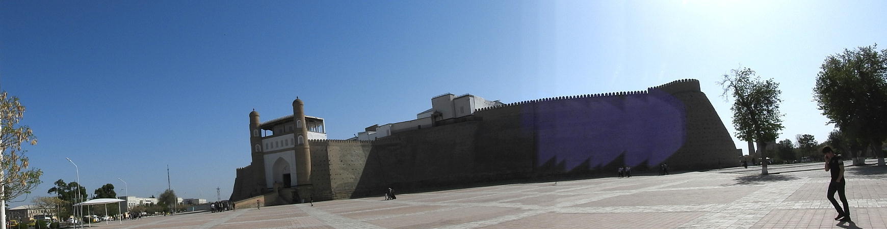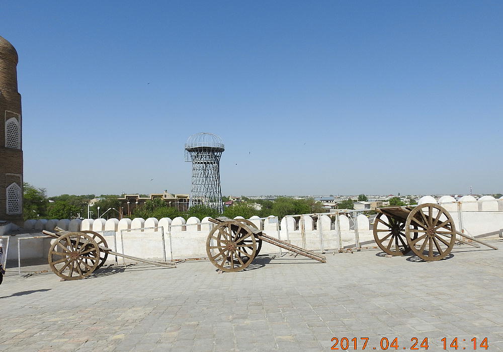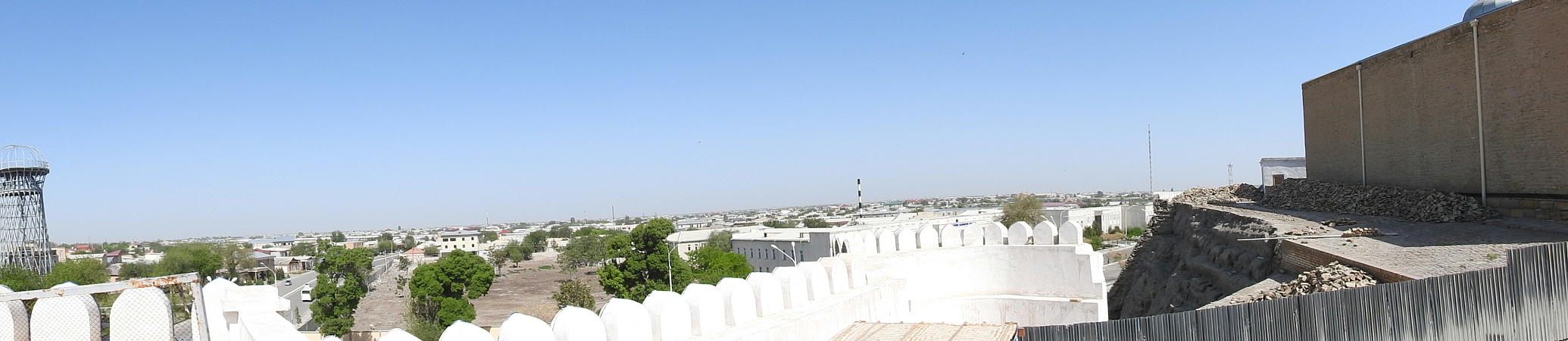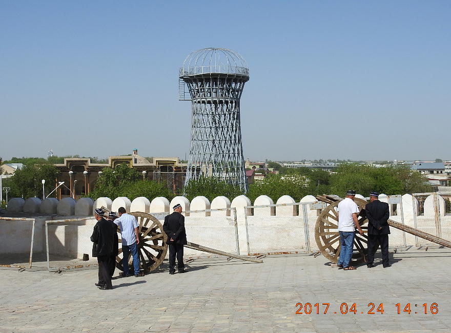 2017.4.24.(月) ウズベキスタン4日目 上はクリックで拡大します。 ウズベキスタン南東部の都市ブハラの旧市街にある。1920年のソビエト軍により攻略される まで、ブハラ・ハン国の歴代ハンの居城として使われていた。現在の建物は18世紀に再建さ れたもので、内部は博物館になっている。4ヘクタールの城域内、高さ18m−20mにある広場 には、アミール(為政者、王)の宮殿、モスク、財務局、政府行政局などがあり、刑務所ま であった。 アルク城は要塞(Ark Fortress)でもある。王の居城であると同時に、外敵に備えた大規模 な要塞構造となっている。18−19世紀に、都市国家ブハラ・ハン国の中心となっていた。 1920年にソ連軍によって陥落されるまでは、都市国家を守る要塞としての役割をもっていた。 上はクリックで超拡大します。 アルク城は当初の要塞計画では、西から東へ細長い矩形をしていた。アルク城の外壁の周囲 は789.6メートル。また面積は3.96ヘクタールあり、外壁で囲まれている。外壁の高さは16. 20メートルあるが、この高さは場所によって異なっている。 アルク城の築造年代は正確には分かっていまないが、6世紀初頭にはすでに地元の支配者の住居 であったと推察されている。現在、アルク城が建っている場所は、古代ブハラの発祥の地と言 われており、少なくとも紀元前から存在していたようである。 発掘調査によると、アルク城は紀元前4世紀から存在していたとされている。そのアルク城は アラブ、チンギスハーン(モンゴル)、ソビエト(ロシア)など何度も外敵により破壊されて は建て直されており、現存するアルク城は18世紀に構築された。 アルク城前の広大な広場は、サマルカンドと同じくレギスタン広場といい、かつては公開処刑場 として犯罪者のみならず、ブハラ・ハンの政治に異議を申し立て反抗した市民たちの首も切り落 としていた場所である。 アルク城は土の要塞である。レンガを積み重ねて堅固な外壁を構築している。現在の建物のアー チの下20mの深さの層に昔の遺跡があり、その上に要塞を構築していたと推定される。 アルクへの入り口は塔のある門で、その入り口から屋根のあるギャラリーが内部へ続いている。 現在はその内部に土産物屋や露店が軒を連ねている。かっては入り口の上に「むち」が飾られて いて、アミール(王)の無限の力の象徴だった。 通路の両側には、ガラスケースに入った展示品が飾られている。使用された土器や服装、武器な どが並んでいる。 上はクリックで拡大します。 上はクリックで拡大します。 壁の一部にはラクダなどの絵が、レンガを削り込んで描かれている。 上写真中央の白い建物が、ブハラ王が公開処刑を見届けるための監視台である。 城壁には、水抜きの穴とともに、足場用の木の棒がささっているのが見える。これはウズベキ スタンの多くの大型建物に見られる構造である。どうやら、城壁を建築、修復する際に足場と して使われたもののようである。 赤軍の攻撃によってアルク上の大部分が破壊され、かってはアルク上の7割が荒れ地となって いた。当時のもので残存しているのは、木製のアイウ"アンのあるジュマ・モスク、クシベギ (首相)の公邸、王位のホールなどである。城壁内には、王、及びその軍事指導者そして多数 の使用人が住んでいた。アルク城は石や泥ではなく木造の建築物が中心だった。 7世紀にはフタ・ハウタンという女王が、このアルク城の砦でアラブ軍と戦ったとされている。 モンゴル軍が襲来してきた時、多くの住民がアルク城に立てこもり抵抗したが、結局チンギス ・ハーンによって住民は虐殺され、同時に城も破壊されている。 上はクリックしていただけば、超拡大します。 その後も何度も外敵に襲われた。アルク城は破壊と修復を繰り返してきたが、ロシア革命後の 1920年、ソビエト赤軍による爆撃によりほぼ城全体が崩壊し、現在は石造りの部分のみが往事 の面影を残している。