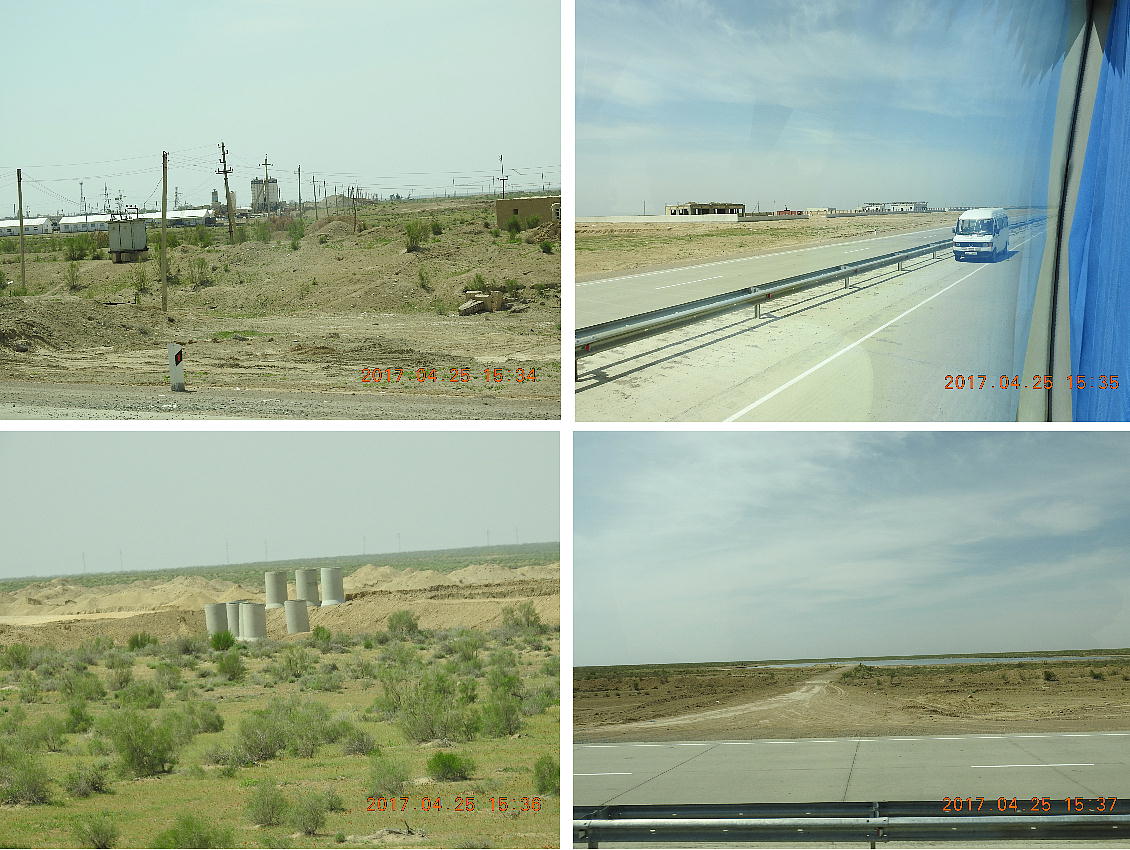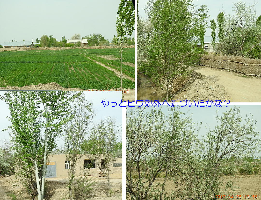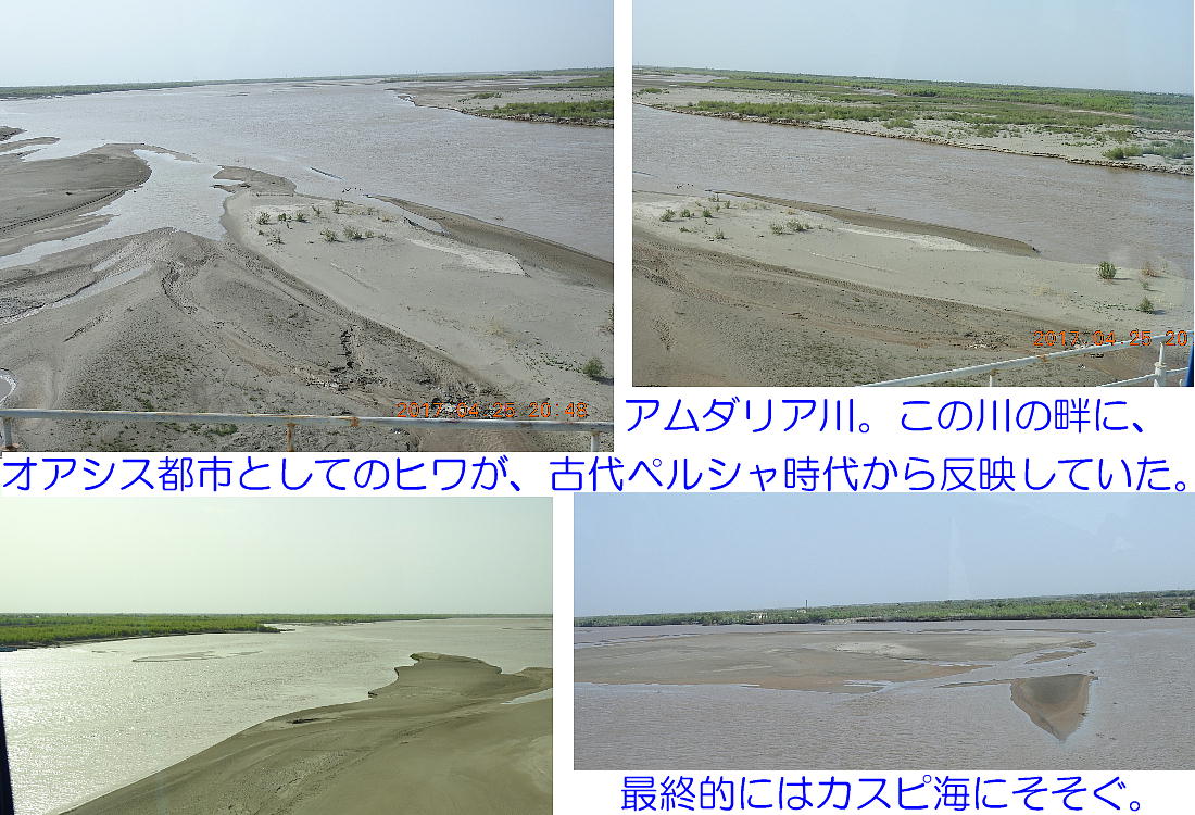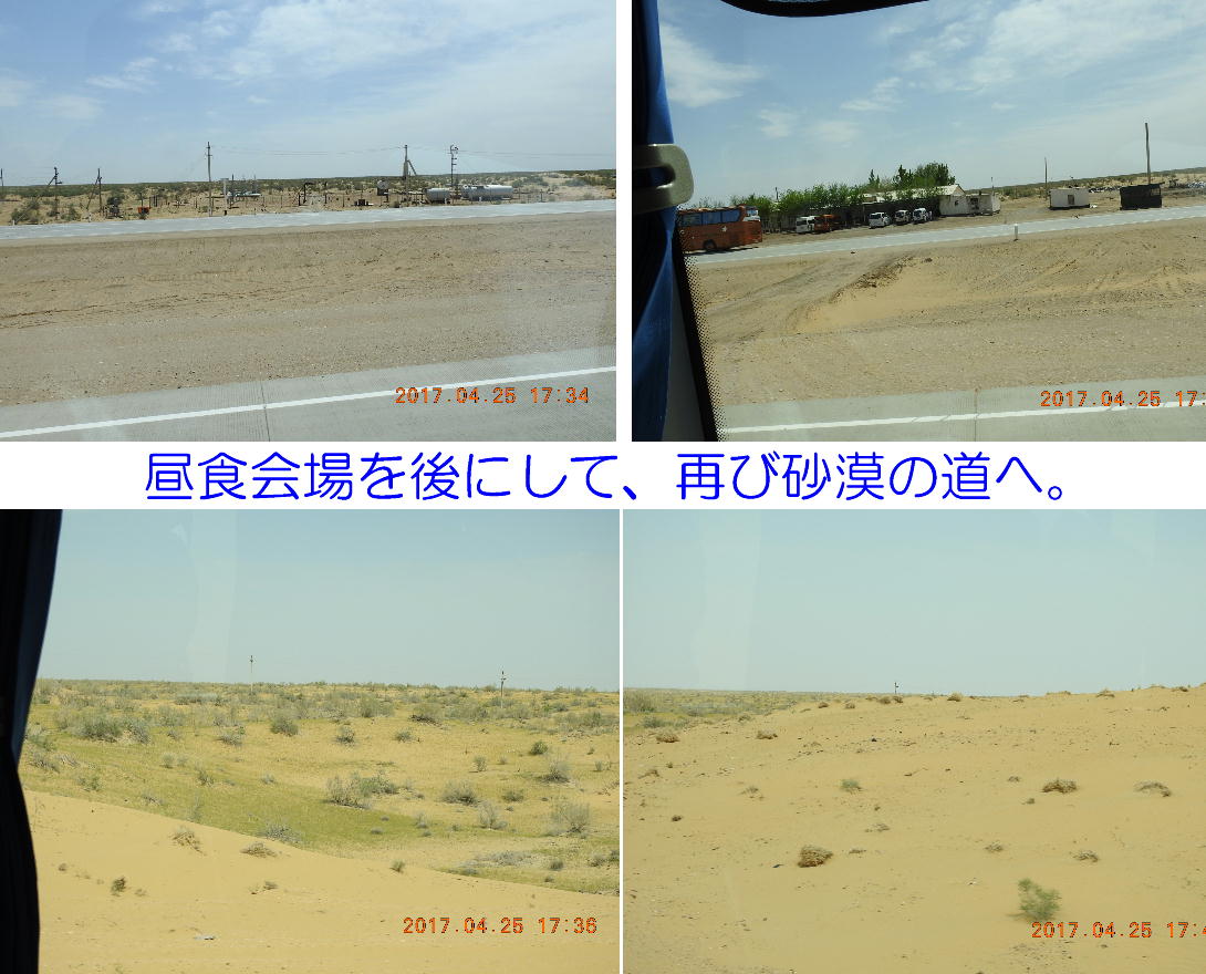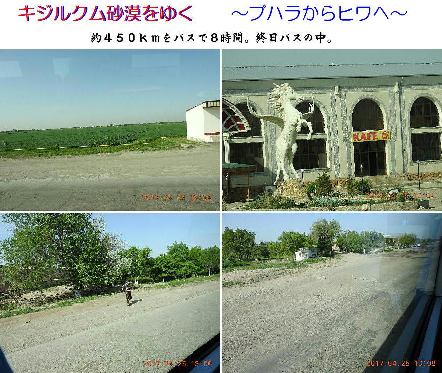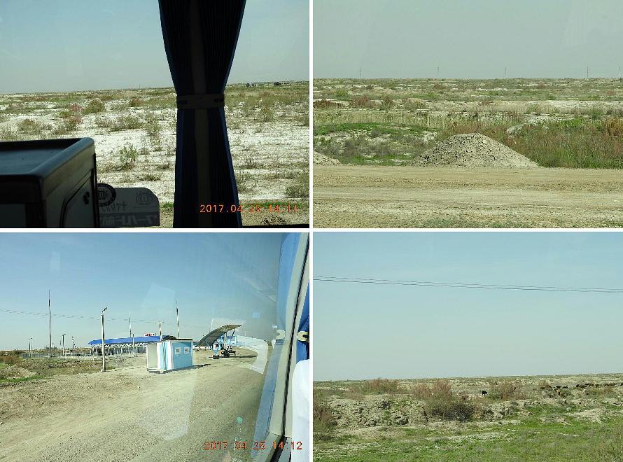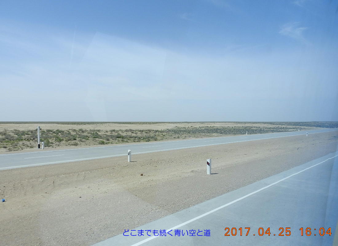 2017.4.25.(火) 〜ブハラからヒワへ〜 キジルクム砂漠をゆく 今日はキジルクム砂漠をバスでゆく。ブハラーヒワ間約450km。終日バスの中である。高速道路 があれば4〜5時間なのだろうが、日本の高速道路に匹敵するような道はない。戦後すぐのようなデ コボコ道と、舗装された道との組み合わせだ。一応8時出発で5時半到着予定だから、9時間半の移 動予定。途中のオアシスでの昼食と、2回のトイレタイムがあったのでそれを差し引いても、ま、8 時間ほどのバスの旅だった。飛行場も鉄道もないのでバスでゆくしかないのである。しかし車が出現 するまでは、この道を馬車と駱駝の隊商達が徒歩で通っていたのだ。 いざ、キジルクム砂漠縦断の旅へ出発。 東トルキスタンのゴビ砂漠のような礫(れき)の砂漠ではなく、タクラマカンのような砂の砂漠でも ない。荒れ地に灌木が点在する、まさに「荒野」という形容がぴったりの砂漠だった。 ブハラとヒワの間にはこの道路しかない。鉄道は建設中だがまだ完成していないし、ヒワには空港は あるが、ブハラには無いようだ。あったとしても、このツアーではその費用を出せないのかもしれな い。延々とバスで移動など、何か無駄な行程のような気がしたが、存外おもしろかった。果てしなく 続く砂漠にも、様々な表情があるのだ。乗客の殆どはその行程の大半を眠っていたようだが、私は砂 漠を見続けながら、深遠な宇宙の真理など、様々な思索にふけっていた。 さぁそれでは、延々と続く砂漠の旅をご覧ください。今日は一日これです。 まだブハラの近郊だからか、結構農作業の機械や人を見る。 小さな村のような集落が点在している。 <キジルクム砂漠> 出典:ウィキペディア他 キジルクム砂漠(英語:Kyzyl kum)は、カザフスタン、ウズベキスタン、それにトルクメニスタン の一部にかけて広がる砂漠。キジルクムはテュルク諸語で「赤い砂」を意味する。面積は約29万8000 km2。北東にシルダリヤ川、南西にアムダリヤ川が流れている。金や天然ガスといった資源が眠り、 川やオアシス周辺では農業がおこなわれている。 ウズベキスタン北西部のキジルクム砂漠には、古代ホレズム王国の都城遺跡(カラ)が点在している。 荒涼とした砂漠に聳える遺跡群で、アヤズ・カラが有名。今回は訪れないが、上の地図には示されて いる。しかしヒワ(ヒヴァ)のイチャン・カラは、1990年にユネスコの世界遺産に登録されているし、 ヒワの旧市街地でこの王国のよすがを今も忍ぶことができる。 イチャン・カラ(ウズベク語: Ichan Qa'la)とは、中央アジア、西アジアの都市に見られる市街地の 形態である。城壁に囲われた市街地で、日本語に直訳すると「内城」となる。城壁の外に発展した郊 外の区域は「デシャン・カラ(ディシャン・カラ、外城)」と呼ばれる。 <古代ホレズム王国> 出典:[国立情報学研究所] 『"古都ホレズムは中央アジアのエジプトである" ― 人類の文明を探求し続けてきた考古学者らは、 古代ホレズムの研究を通じ、偉大な結論に辿り着いた。彼らはホレズムの文化・芸術・歴史は中央ア ジアの発展に密接に関係していることを証明したのである。』 <ソ連の民族学者 S.P.トルストフ> 地理的にホレズムという地域はアラル海の南東、アムダリヤ川下流の両岸と、イラン北東部付近一帯 を指します。また、アラル海の南西部にある乾燥したウスティユルト高原の南側地域と、アムダリヤ 川とシルダリヤ川に挟まれた地域も含みます。現代ではウズベキスタン共和国内にあたり、古くはシ ルクロード上の重要な地域であったところです。 ホレズムという名称はアヴェスタと呼ばれるゾロアスター教の経典の中で記述されています。アヴェ スタには当時、イラン東部と中央アジアには経済格差のある階級社会が存在していたこと、また、国 家を形成していた聖職者、軍人、農夫、職人、奴隷らについても詳細に記されています。また“アリ アナム・バイジャ”の地で起こった物語が翻訳されており、権威あるホレズムの科学者によって立証 されています。 11〜13世紀のホレズム帝国にはパルティア(カスピ海南東部、イラン高原東北部)、メルブ(トルク メニスタン)、ソグディアナ(ウズベキスタンのサマルカンド州とブハラ州、タジキスタンのソグド 州)、ホレズム(ウズベキスタン西部)が含まれていました。 中央アジアで最初の国家は、紀元前 9〜8世紀頃にアラル海南部のバクトリア地域で発展しました。 ホレズムは、紀元前6世紀に王国として発展しバクトリアとホレズムは、アムダリヤ川河口において、 開拓地を共有していました。乾燥したホレズム地方での最初の灌漑工事が紀元前6−5世紀頃から始ま ったと言われています。住民は、主に村では農夫、都市では職人と貿易商で占められていましたが、 遺跡の発掘により科学者の存在も確認されています。 ホレズム人は天文学、数学において高い知識を持っており、角度を測定する道具を発明し、それらを 科学の研究に使用して