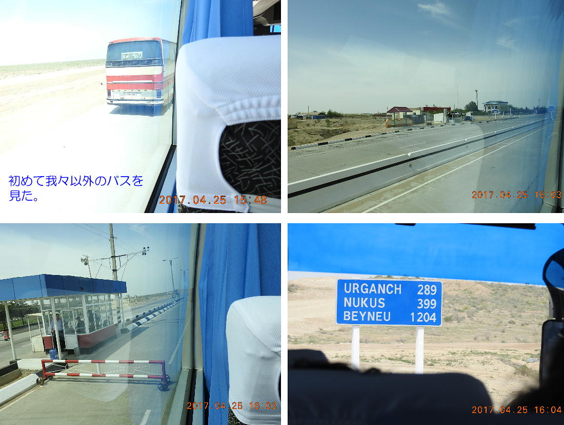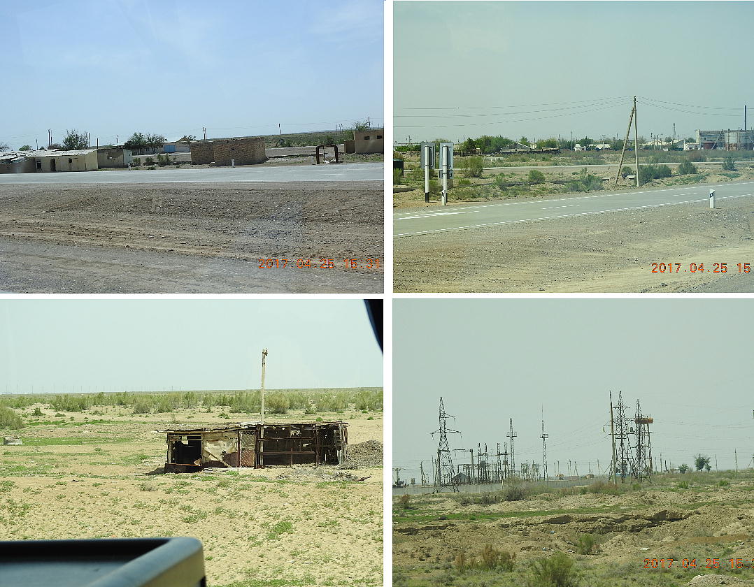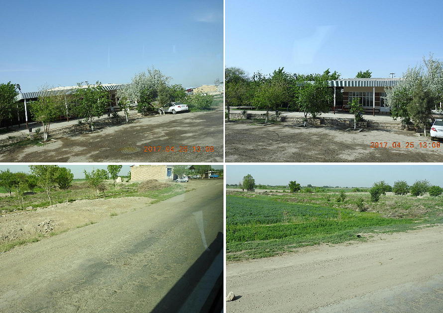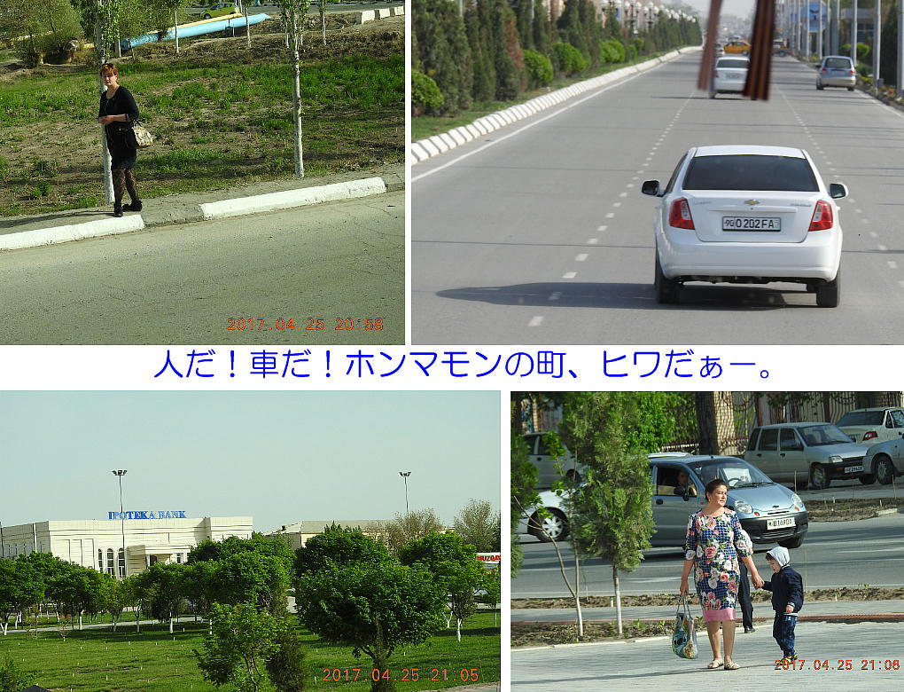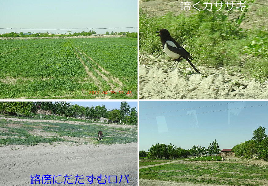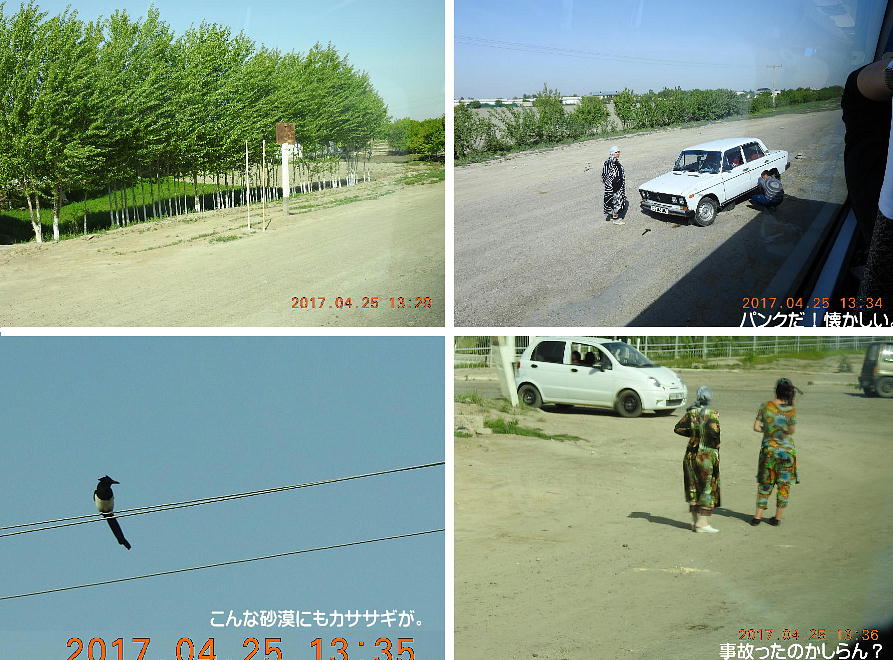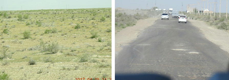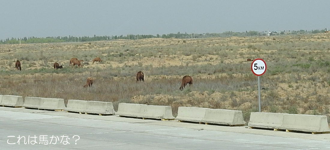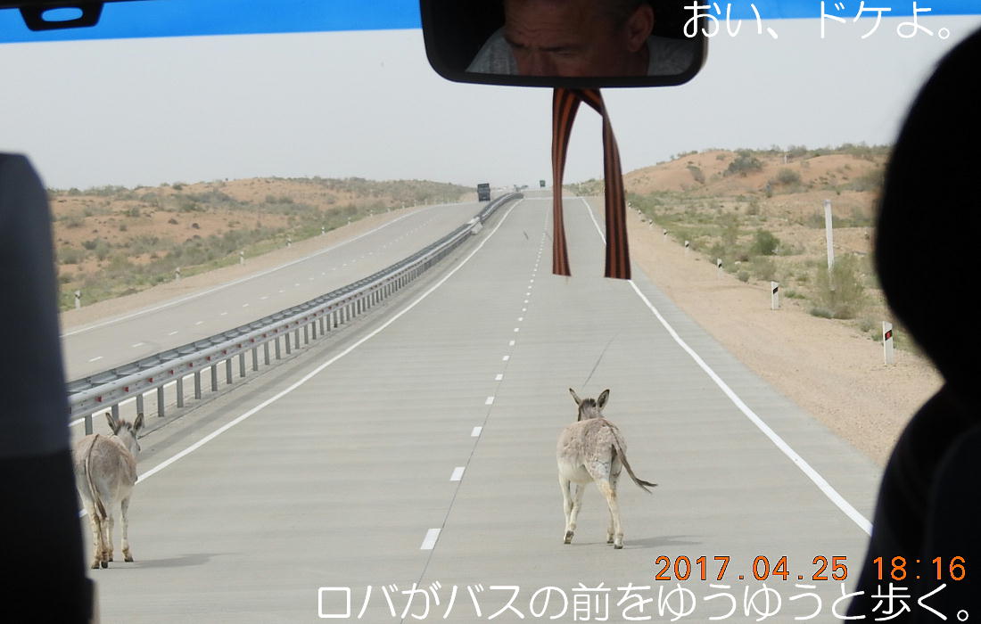 2017.4.25.(火) 〜ブハラからヒワへ〜 キジルクム砂漠をゆく 今日はキジルクム砂漠をバスでゆく。ブハラーヒワ間約450km。終日バスの中である。高速道路 があれば4〜5時間なのだろうが、日本の高速道路に匹敵するような道はない。戦後すぐのようなデ コボコ道と、舗装された道との組み合わせだ。一応8時出発で5時半到着予定だから、9時間半の移 動予定。途中のオアシスでの昼食と、2回のトイレタイムがあったのでそれを差し引いても、ま、8 時間ほどのバスの旅だった。飛行場も鉄道もないのでバスでゆくしかないのである。しかし車が出現 するまでは、この道を馬車と駱駝の隊商達が徒歩で通っていたのだ。 いざ、キジルクム砂漠縦断の旅へ出発。 東トルキスタンのゴビ砂漠のような礫(れき)の砂漠ではなく、タクラマカンのような砂の砂漠でも ない。荒れ地に灌木が点在する、まさに「荒野」という形容がぴったりの砂漠だった。 ブハラとヒワの間にはこの道路しかない。鉄道は建設中だがまだ完成していないし、ヒワには空港は あるが、ブハラには無いようだ。あったとしても、このツアーではその費用を出せないのかもしれな い。延々とバスで移動など、何か無駄な行程のような気がしたが、存外おもしろかった。果てしなく 続く砂漠にも、様々な表情があるのだ。乗客の殆どはその行程の大半を眠っていたようだが、私は砂 漠を見続けながら、深遠な宇宙の真理など、様々な思索にふけっていた。 さぁそれでは、延々と続く砂漠の旅をご覧ください。今日は一日これです。 まだブハラの近郊だからか、結構農作業の機械や人を見る。 小さな村のような集落が点在している。 <キジルクム砂漠> 出典:ウィキペディア他 キジルクム砂漠(英語:Kyzyl kum)は、カザフスタン、ウズベキスタン、それにトルクメニスタン の一部にかけて広がる砂漠。キジルクムはテュルク諸語で「赤い砂」を意味する。面積は約29万8000 km2。北東にシルダリヤ川、南西にアムダリヤ川が流れている。金や天然ガスといった資源が眠り、 川やオアシス周辺では農業がおこなわれている。 ウズベキスタン北西部のキジルクム砂漠には、古代ホレズム王国の都城遺跡(カラ)が点在している。 荒涼とした砂漠に聳える遺跡群で、アヤズ・カラが有名。今回は訪れないが、上の地図には示されて いる。しかしヒワ(ヒヴァ)のイチャン・カラは、1990年にユネスコの世界遺産に登録されているし、 ヒワの旧市街地でこの王国のよすがを今も忍ぶことができる。 イチャン・カラ(ウズベク語: Ichan Qa'la)とは、中央アジア、西アジアの都市に見られる市街地の 形態である。城壁に囲われた市街地で、日本語に直訳すると「内城」となる。城壁の外に発展した郊 外の区域は「デシャン・カラ(ディシャン・カラ、外城)」と呼ばれる。 <古代ホレズム王国> 出典:[国立情報学研究所] 『"古都ホレズムは中央アジアのエジプトである" ― 人類の文明を探求し続けてきた考古学者らは、 古代ホレズムの研究を通じ、偉大な結論に辿り着いた。彼らはホレズムの文化・芸術・歴史は中央ア ジアの発展に密接に関係していることを証明したのである。』 <ソ連の民族学者 S.P.トルストフ> 地理的にホレズムという地域はアラル海の南東、アムダリヤ川下流の両岸と、イラン北東部付近一帯 を指します。また、アラル海の南西部にある乾燥したウスティユルト高原の南側地域と、アムダリヤ 川とシルダリヤ川に挟まれた地域も含みます。現代ではウズベキスタン共和国内にあたり、古くはシ ルクロード上の重要な地域であったところです。 ホレズムという名称はアヴェスタと呼ばれるゾロアスター教の経典の中で記述されています。アヴェ スタには当時、イラン東部と中央アジアには経済格差のある階級社会が存在していたこと、また、国 家を形成していた聖職者、軍人、農夫、職人、奴隷らについても詳細に記されています。また“アリ アナム・バイジャ”の地で起こった物語が翻訳されており、権威あるホレズムの科学者によって立証 されています。 11〜13世紀のホレズム帝国にはパルティア(カスピ海南東部、イラン高原東北部)、メルブ(トルク メニスタン)、ソグディアナ(ウズベキスタンのサマルカンド州とブハラ州、タジキスタンのソグド 州)、ホレズム(ウズベキスタン西部)が含まれていました。 中央アジアで最初の国家は、紀元前 9〜8世紀頃にアラル海南部のバクトリア地域で発展しました。 ホレズムは、紀元前6世紀に王国として発展しバクトリアとホレズムは、アムダリヤ川河口において、 開拓地を共有していました。乾燥したホレズム地方での最初の灌漑工事が紀元前6−5世紀頃から始ま ったと言われています。住民は、主に村では農夫、都市では職人と貿易商で占められていましたが、 遺跡の発掘により科学者の存在も確認されています。 ホレズム人は天文学、数学において高い知識を持っており、角度を測定する道具を発明し、それらを 科学の研究に使用して