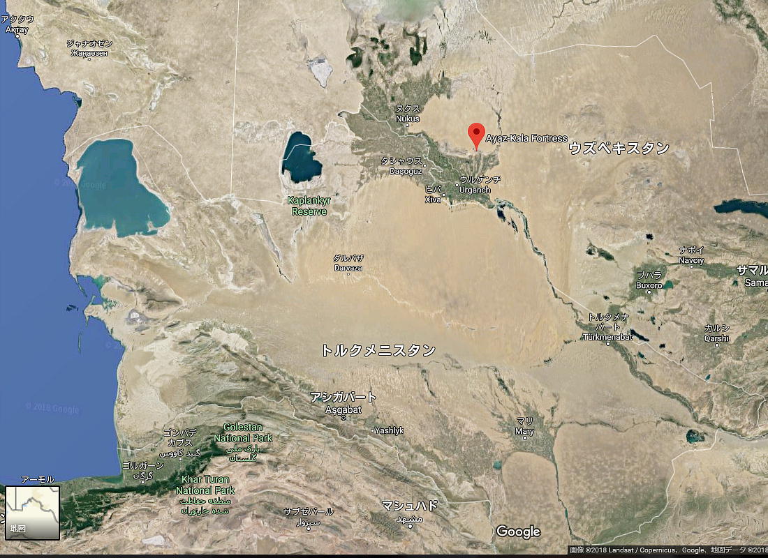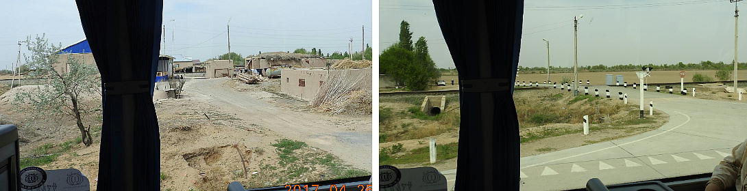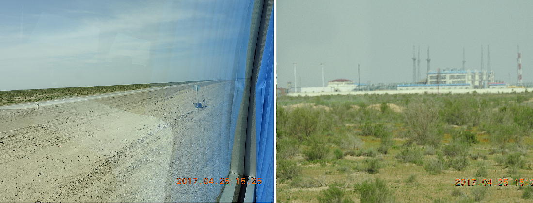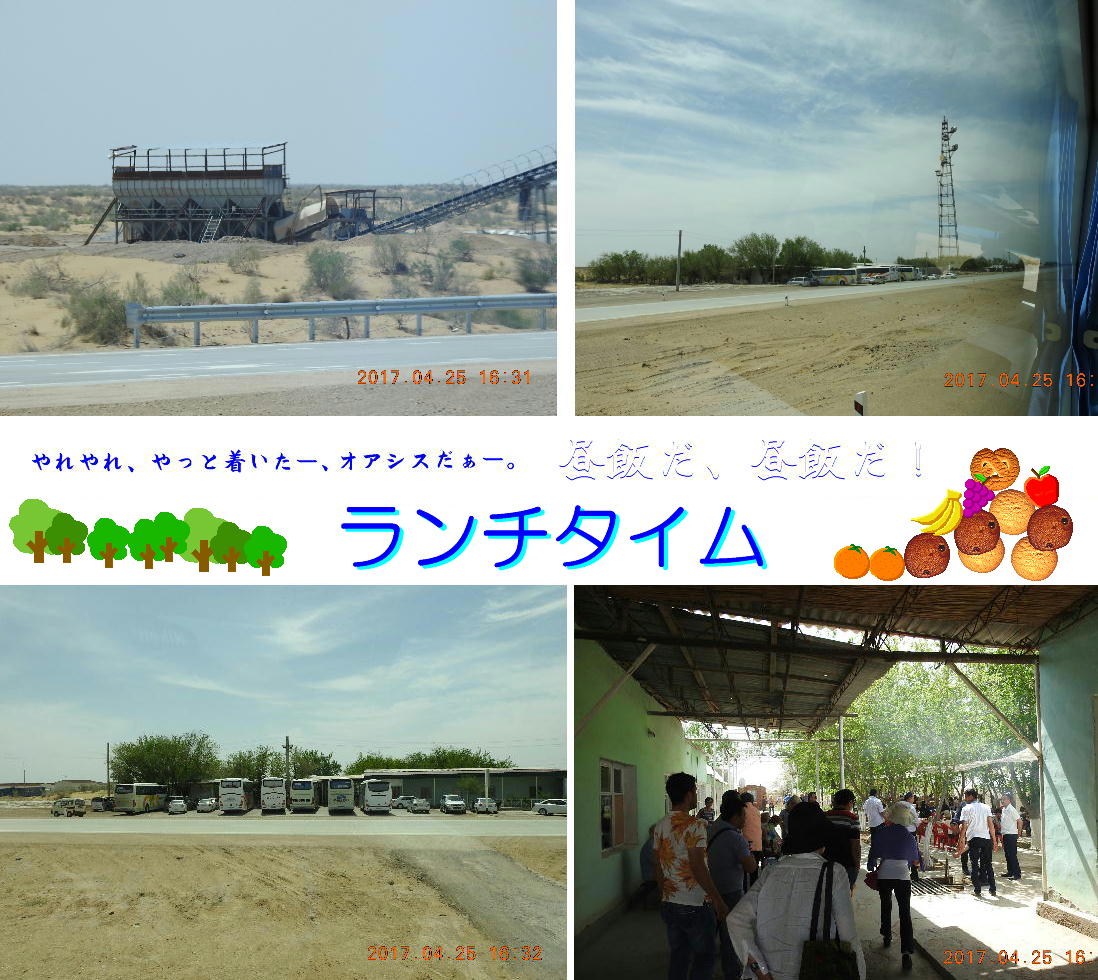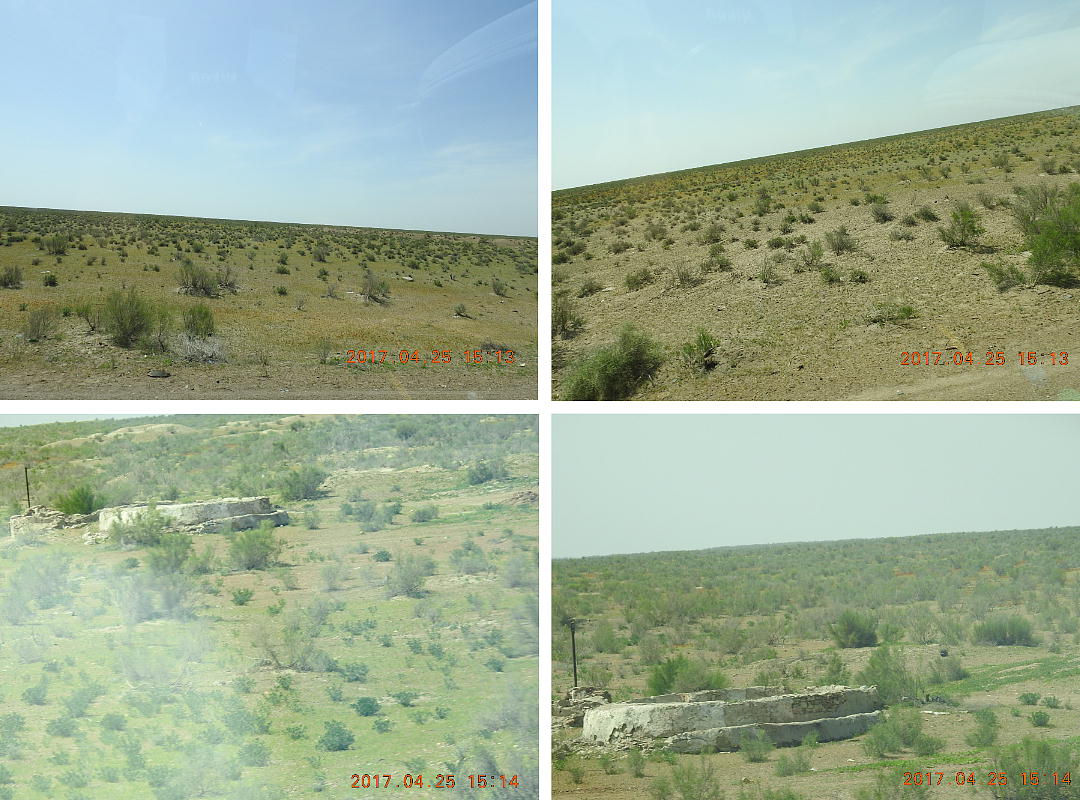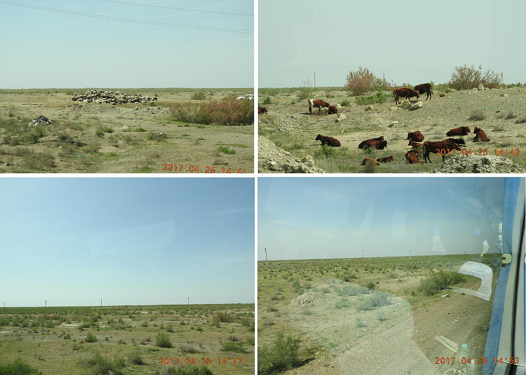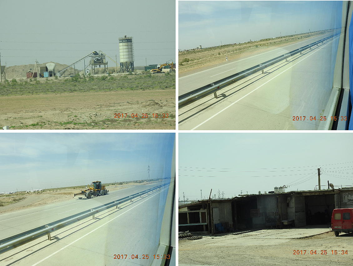 2017.4.25.(火) 〜ブハラからヒワへ〜 キジルクム砂漠をゆく 今日はキジルクム砂漠をバスでゆく。ブハラーヒワ間約450km。終日バスの中である。高速道路 があれば4〜5時間なのだろうが、日本の高速道路に匹敵するような道はない。戦後すぐのようなデ コボコ道と、舗装された道との組み合わせだ。一応8時出発で5時半到着予定だから、9時間半の移 動予定。途中のオアシスでの昼食と、2回のトイレタイムがあったのでそれを差し引いても、ま、8 時間ほどのバスの旅だった。飛行場も鉄道もないのでバスでゆくしかないのである。しかし車が出現 するまでは、この道を馬車と駱駝の隊商達が徒歩で通っていたのだ。 いざ、キジルクム砂漠縦断の旅へ出発。 東トルキスタンのゴビ砂漠のような礫(れき)の砂漠ではなく、タクラマカンのような砂の砂漠でも ない。荒れ地に灌木が点在する、まさに「荒野」という形容がぴったりの砂漠だった。 ブハラとヒワの間にはこの道路しかない。鉄道は建設中だがまだ完成していないし、ヒワには空港は あるが、ブハラには無いようだ。あったとしても、このツアーではその費用を出せないのかもしれな い。延々とバスで移動など、何か無駄な行程のような気がしたが、存外おもしろかった。果てしなく 続く砂漠にも、様々な表情があるのだ。乗客の殆どはその行程の大半を眠っていたようだが、私は砂 漠を見続けながら、深遠な宇宙の真理など、様々な思索にふけっていた。 さぁそれでは、延々と続く砂漠の旅をご覧ください。今日は一日これです。 まだブハラの近郊だからか、結構農作業の機械や人を見る。 小さな村のような集落が点在している。 <キジルクム砂漠> 出典:ウィキペディア他 キジルクム砂漠(英語:Kyzyl kum)は、カザフスタン、ウズベキスタン、それにトルクメニスタン の一部にかけて広がる砂漠。キジルクムはテュルク諸語で「赤い砂」を意味する。面積は約29万8000 km2。北東にシルダリヤ川、南西にアムダリヤ川が流れている。金や天然ガスといった資源が眠り、 川やオアシス周辺では農業がおこなわれている。 ウズベキスタン北西部のキジルクム砂漠には、古代ホレズム王国の都城遺跡(カラ)が点在している。 荒涼とした砂漠に聳える遺跡群で、アヤズ・カラが有名。今回は訪れないが、上の地図には示されて いる。しかしヒワ(ヒヴァ)のイチャン・カラは、1990年にユネスコの世界遺産に登録されているし、 ヒワの旧市街地でこの王国のよすがを今も忍ぶことができる。 イチャン・カラ(ウズベク語: Ichan Qa'la)とは、中央アジア、西アジアの都市に見られる市街地の 形態である。城壁に囲われた市街地で、日本語に直訳すると「内城」となる。城壁の外に発展した郊 外の区域は「デシャン・カラ(ディシャン・カラ、外城)」と呼ばれる。 <古代ホレズム王国> 出典:[国立情報学研究所] 『"古都ホレズムは中央アジアのエジプトである" ― 人類の文明を探求し続けてきた考古学者らは、 古代ホレズムの研究を通じ、偉大な結論に辿り着いた。彼らはホレズムの文化・芸術・歴史は中央ア ジアの発展に密接に関係していることを証明したのである。』 <ソ連の民族学者 S.P.トルストフ> 地理的にホレズムという地域はアラル海の南東、アムダリヤ川下流の両岸と、イラン北東部付近一帯 を指します。また、アラル海の南西部にある乾燥したウスティユルト高原の南側地域と、アムダリヤ 川とシルダリヤ川に挟まれた地域も含みます。現代ではウズベキスタン共和国内にあたり、古くはシ ルクロード上の重要な地域であったところです。 ホレズムという名称はアヴェスタと呼ばれるゾロアスター教の経典の中で記述されています。アヴェ スタには当時、イラン東部と中央アジアには経済格差のある階級社会が存在していたこと、また、国 家を形成していた聖職者、軍人、農夫、職人、奴隷らについても詳細に記されています。また“アリ アナム・バイジャ”の地で起こった物語が翻訳されており、権威あるホレズムの科学者によって立証 されています。 11〜13世紀のホレズム帝国にはパルティア(カスピ海南東部、イラン高原東北部)、メルブ(トルク メニスタン)、ソグディアナ(ウズベキスタンのサマルカンド州とブハラ州、タジキスタンのソグド 州)、ホレズム(ウズベキスタン西部)が含まれていました。 中央アジアで最初の国家は、紀元前 9〜8世紀頃にアラル海南部のバクトリア地域で発展しました。 ホレズムは、紀元前6世紀に王国として発展しバクトリアとホレズムは、アムダリヤ川河口において、 開拓地を共有していました。乾燥したホレズム地方での最初の灌漑工事が紀元前6−5世紀頃から始ま ったと言われています。住民は、主に村では農夫、都市では職人と貿易商で占められていましたが、 遺跡の発掘により科学者の存在も確認されています。 ホレズム人は天文学、数学において高い知識を持っており、角度を測定する道具を発明し、それらを 科学の研究に使用して