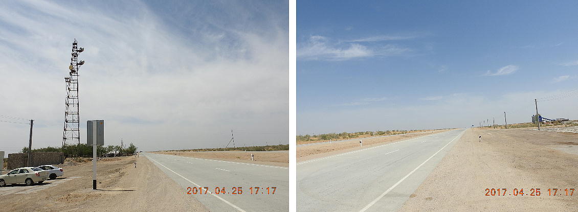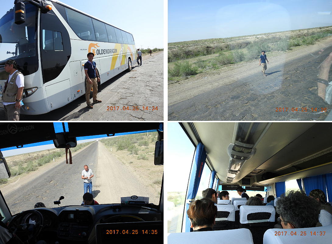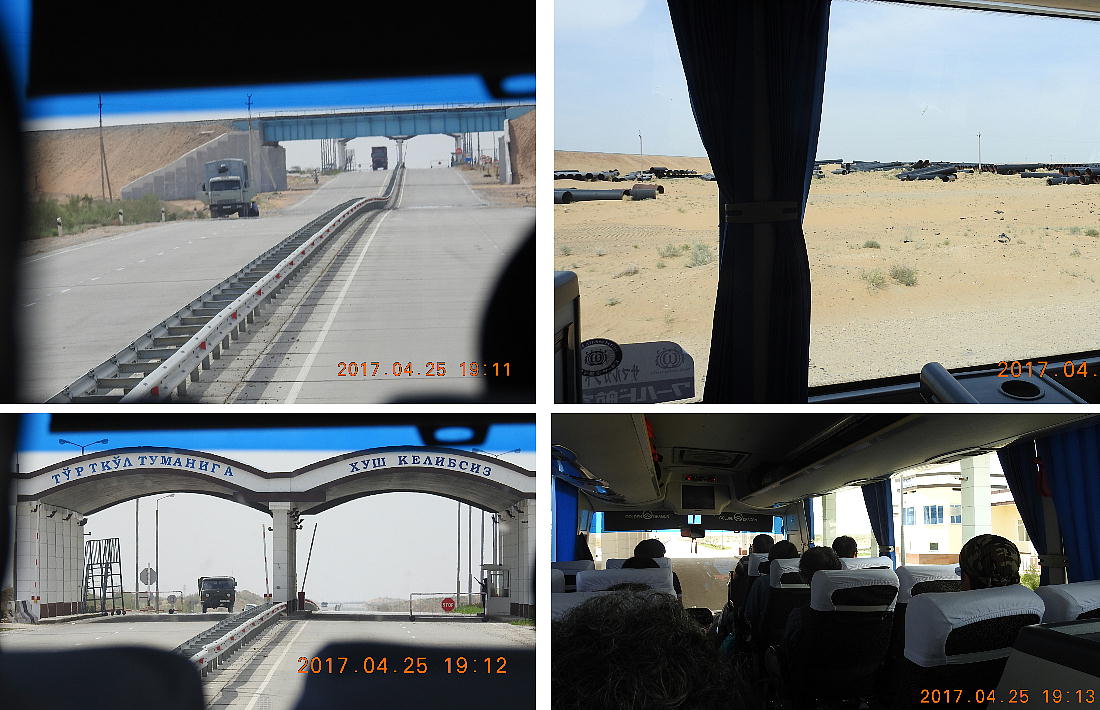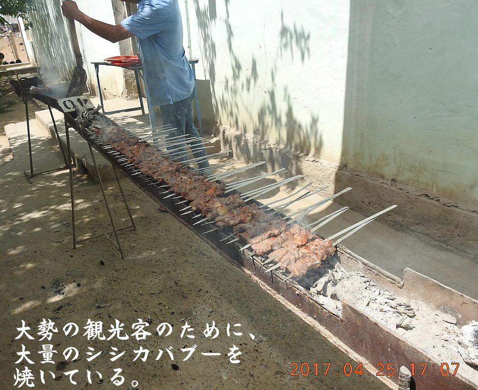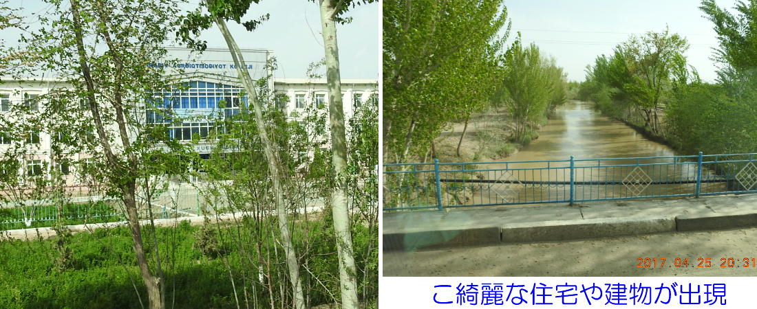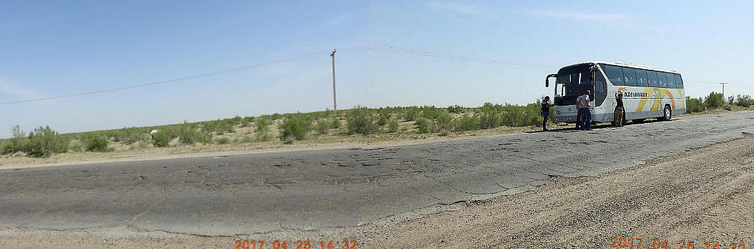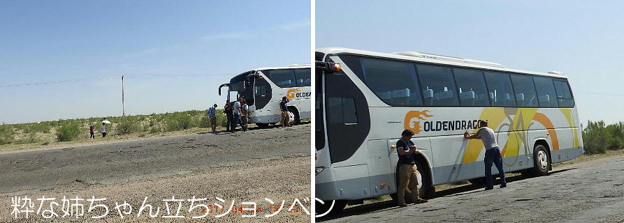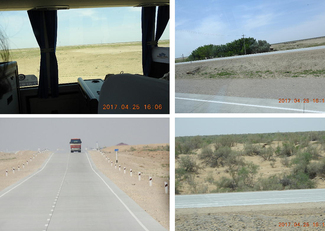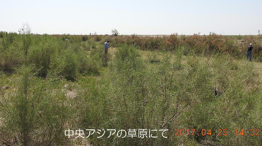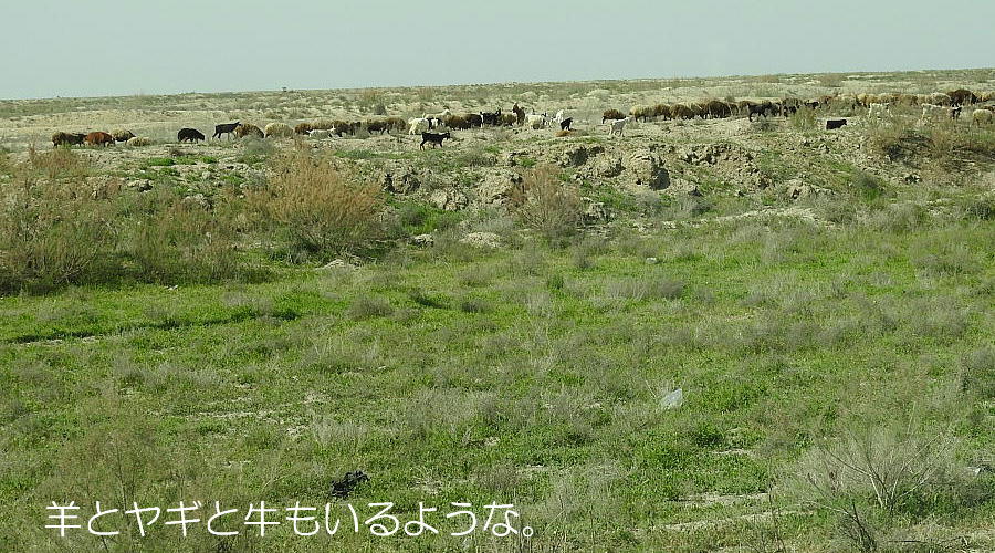 2017.4.25.(火) 〜ブハラからヒワへ〜 キジルクム砂漠をゆく 今日はキジルクム砂漠をバスでゆく。ブハラーヒワ間約450km。終日バスの中である。高速道路 があれば4〜5時間なのだろうが、日本の高速道路に匹敵するような道はない。戦後すぐのようなデ コボコ道と、舗装された道との組み合わせだ。一応8時出発で5時半到着予定だから、9時間半の移 動予定。途中のオアシスでの昼食と、2回のトイレタイムがあったのでそれを差し引いても、ま、8 時間ほどのバスの旅だった。飛行場も鉄道もないのでバスでゆくしかないのである。しかし車が出現 するまでは、この道を馬車と駱駝の隊商達が徒歩で通っていたのだ。 いざ、キジルクム砂漠縦断の旅へ出発。 東トルキスタンのゴビ砂漠のような礫(れき)の砂漠ではなく、タクラマカンのような砂の砂漠でも ない。荒れ地に灌木が点在する、まさに「荒野」という形容がぴったりの砂漠だった。 ブハラとヒワの間にはこの道路しかない。鉄道は建設中だがまだ完成していないし、ヒワには空港は あるが、ブハラには無いようだ。あったとしても、このツアーではその費用を出せないのかもしれな い。延々とバスで移動など、何か無駄な行程のような気がしたが、存外おもしろかった。果てしなく 続く砂漠にも、様々な表情があるのだ。乗客の殆どはその行程の大半を眠っていたようだが、私は砂 漠を見続けながら、深遠な宇宙の真理など、様々な思索にふけっていた。 さぁそれでは、延々と続く砂漠の旅をご覧ください。今日は一日これです。 まだブハラの近郊だからか、結構農作業の機械や人を見る。 小さな村のような集落が点在している。 <キジルクム砂漠> 出典:ウィキペディア他 キジルクム砂漠(英語:Kyzyl kum)は、カザフスタン、ウズベキスタン、それにトルクメニスタン の一部にかけて広がる砂漠。キジルクムはテュルク諸語で「赤い砂」を意味する。面積は約29万8000 km2。北東にシルダリヤ川、南西にアムダリヤ川が流れている。金や天然ガスといった資源が眠り、 川やオアシス周辺では農業がおこなわれている。 ウズベキスタン北西部のキジルクム砂漠には、古代ホレズム王国の都城遺跡(カラ)が点在している。 荒涼とした砂漠に聳える遺跡群で、アヤズ・カラが有名。今回は訪れないが、上の地図には示されて いる。しかしヒワ(ヒヴァ)のイチャン・カラは、1990年にユネスコの世界遺産に登録されているし、 ヒワの旧市街地でこの王国のよすがを今も忍ぶことができる。 イチャン・カラ(ウズベク語: Ichan Qa'la)とは、中央アジア、西アジアの都市に見られる市街地の 形態である。城壁に囲われた市街地で、日本語に直訳すると「内城」となる。城壁の外に発展した郊 外の区域は「デシャン・カラ(ディシャン・カラ、外城)」と呼ばれる。 <古代ホレズム王国> 出典:[国立情報学研究所] 『"古都ホレズムは中央アジアのエジプトである" ― 人類の文明を探求し続けてきた考古学者らは、 古代ホレズムの研究を通じ、偉大な結論に辿り着いた。彼らはホレズムの文化・芸術・歴史は中央ア ジアの発展に密接に関係していることを証明したのである。』 <ソ連の民族学者 S.P.トルストフ> 地理的にホレズムという地域はアラル海の南東、アムダリヤ川下流の両岸と、イラン北東部付近一帯 を指します。また、アラル海の南西部にある乾燥したウスティユルト高原の南側地域と、アムダリヤ 川とシルダリヤ川に挟まれた地域も含みます。現代ではウズベキスタン共和国内にあたり、古くはシ ルクロード上の重要な地域であったところです。 ホレズムという名称はアヴェスタと呼ばれるゾロアスター教の経典の中で記述されています。アヴェ スタには当時、イラン東部と中央アジアには経済格差のある階級社会が存在していたこと、また、国 家を形成していた聖職者、軍人、農夫、職人、奴隷らについても詳細に記されています。また“アリ アナム・バイジャ”の地で起こった物語が翻訳されており、権威あるホレズムの科学者によって立証 されています。 11〜13世紀のホレズム帝国にはパルティア(カスピ海南東部、イラン高原東北部)、メルブ(トルク メニスタン)、ソグディアナ(ウズベキスタンのサマルカンド州とブハラ州、タジキスタンのソグド 州)、ホレズム(ウズベキスタン西部)が含まれていました。 中央アジアで最初の国家は、紀元前 9〜8世紀頃にアラル海南部のバクトリア地域で発展しました。 ホレズムは、紀元前6世紀に王国として発展しバクトリアとホレズムは、アムダリヤ川河口において、 開拓地を共有していました。乾燥したホレズム地方での最初の灌漑工事が紀元前6−5世紀頃から始ま ったと言われています。住民は、主に村では農夫、都市では職人と貿易商で占められていましたが、 遺跡の発掘により科学者の存在も確認されています。 ホレズム人は天文学、数学において高い知識を持っており、角度を測定する道具を発明し、それらを 科学の研究に使用して