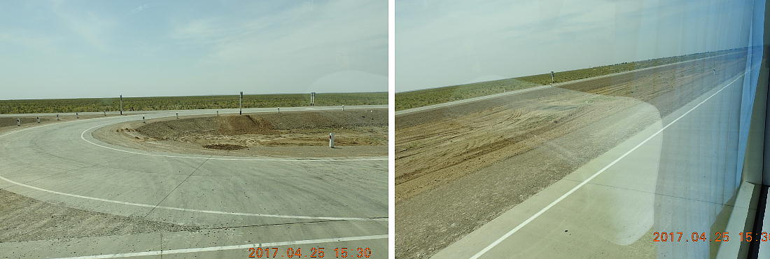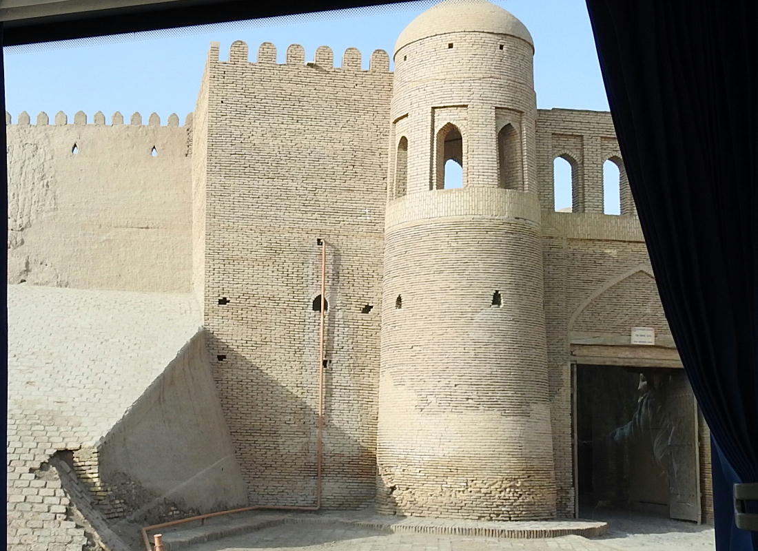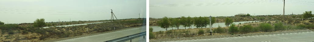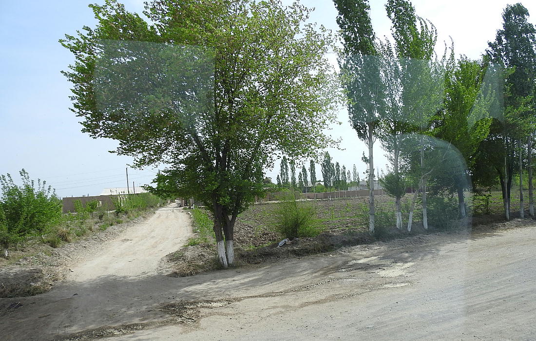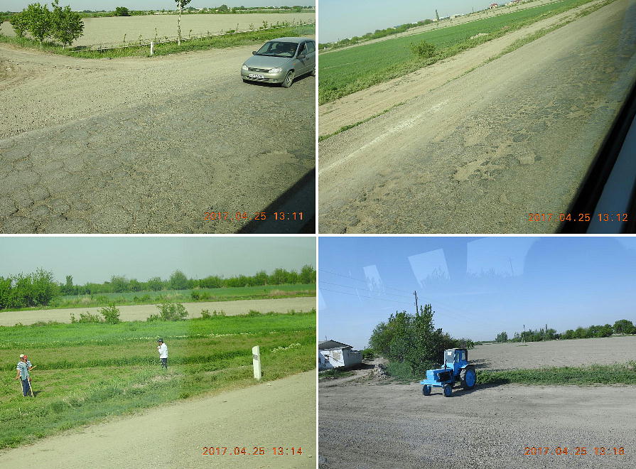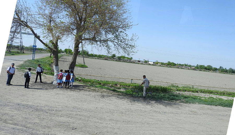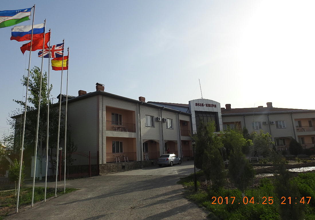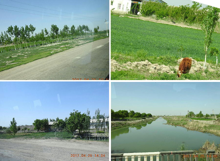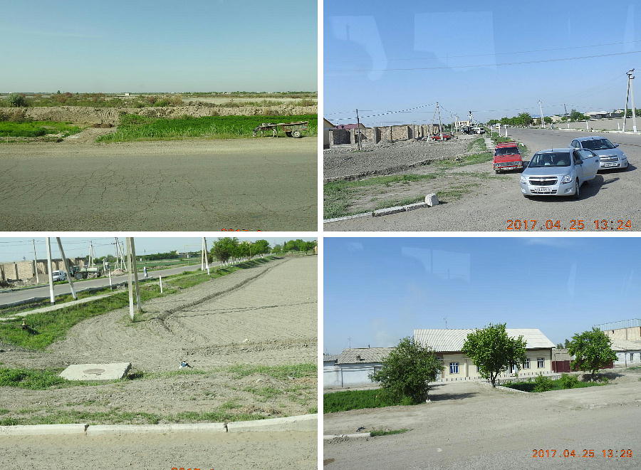 2017.4.25.(火) 〜ブハラからヒワへ〜 キジルクム砂漠をゆく 今日はキジルクム砂漠をバスでゆく。ブハラーヒワ間約450km。終日バスの中である。高速道路 があれば4〜5時間なのだろうが、日本の高速道路に匹敵するような道はない。戦後すぐのようなデ コボコ道と、舗装された道との組み合わせだ。一応8時出発で5時半到着予定だから、9時間半の移 動予定。途中のオアシスでの昼食と、2回のトイレタイムがあったのでそれを差し引いても、ま、8 時間ほどのバスの旅だった。飛行場も鉄道もないのでバスでゆくしかないのである。しかし車が出現 するまでは、この道を馬車と駱駝の隊商達が徒歩で通っていたのだ。 いざ、キジルクム砂漠縦断の旅へ出発。 東トルキスタンのゴビ砂漠のような礫(れき)の砂漠ではなく、タクラマカンのような砂の砂漠でも ない。荒れ地に灌木が点在する、まさに「荒野」という形容がぴったりの砂漠だった。 ブハラとヒワの間にはこの道路しかない。鉄道は建設中だがまだ完成していないし、ヒワには空港は あるが、ブハラには無いようだ。あったとしても、このツアーではその費用を出せないのかもしれな い。延々とバスで移動など、何か無駄な行程のような気がしたが、存外おもしろかった。果てしなく 続く砂漠にも、様々な表情があるのだ。乗客の殆どはその行程の大半を眠っていたようだが、私は砂 漠を見続けながら、深遠な宇宙の真理など、様々な思索にふけっていた。 さぁそれでは、延々と続く砂漠の旅をご覧ください。今日は一日これです。 まだブハラの近郊だからか、結構農作業の機械や人を見る。 小さな村のような集落が点在している。 <キジルクム砂漠> 出典:ウィキペディア他 キジルクム砂漠(英語:Kyzyl kum)は、カザフスタン、ウズベキスタン、それにトルクメニスタン の一部にかけて広がる砂漠。キジルクムはテュルク諸語で「赤い砂」を意味する。面積は約29万8000 km2。北東にシルダリヤ川、南西にアムダリヤ川が流れている。金や天然ガスといった資源が眠り、 川やオアシス周辺では農業がおこなわれている。 ウズベキスタン北西部のキジルクム砂漠には、古代ホレズム王国の都城遺跡(カラ)が点在している。 荒涼とした砂漠に聳える遺跡群で、アヤズ・カラが有名。今回は訪れないが、上の地図には示されて いる。しかしヒワ(ヒヴァ)のイチャン・カラは、1990年にユネスコの世界遺産に登録されているし、 ヒワの旧市街地でこの王国のよすがを今も忍ぶことができる。 イチャン・カラ(ウズベク語: Ichan Qa'la)とは、中央アジア、西アジアの都市に見られる市街地の 形態である。城壁に囲われた市街地で、日本語に直訳すると「内城」となる。城壁の外に発展した郊 外の区域は「デシャン・カラ(ディシャン・カラ、外城)」と呼ばれる。 <古代ホレズム王国> 出典:[国立情報学研究所] 『"古都ホレズムは中央アジアのエジプトである" ― 人類の文明を探求し続けてきた考古学者らは、 古代ホレズムの研究を通じ、偉大な結論に辿り着いた。彼らはホレズムの文化・芸術・歴史は中央ア ジアの発展に密接に関係していることを証明したのである。』 <ソ連の民族学者 S.P.トルストフ> 地理的にホレズムという地域はアラル海の南東、アムダリヤ川下流の両岸と、イラン北東部付近一帯 を指します。また、アラル海の南西部にある乾燥したウスティユルト高原の南側地域と、アムダリヤ 川とシルダリヤ川に挟まれた地域も含みます。現代ではウズベキスタン共和国内にあたり、古くはシ ルクロード上の重要な地域であったところです。 ホレズムという名称はアヴェスタと呼ばれるゾロアスター教の経典の中で記述されています。アヴェ スタには当時、イラン東部と中央アジアには経済格差のある階級社会が存在していたこと、また、国 家を形成していた聖職者、軍人、農夫、職人、奴隷らについても詳細に記されています。また“アリ アナム・バイジャ”の地で起こった物語が翻訳されており、権威あるホレズムの科学者によって立証 されています。 11〜13世紀のホレズム帝国にはパルティア(カスピ海南東部、イラン高原東北部)、メルブ(トルク メニスタン)、ソグディアナ(ウズベキスタンのサマルカンド州とブハラ州、タジキスタンのソグド 州)、ホレズム(ウズベキスタン西部)が含まれていました。 中央アジアで最初の国家は、紀元前 9〜8世紀頃にアラル海南部のバクトリア地域で発展しました。 ホレズムは、紀元前6世紀に王国として発展しバクトリアとホレズムは、アムダリヤ川河口において、 開拓地を共有していました。乾燥したホレズム地方での最初の灌漑工事が紀元前6−5世紀頃から始ま ったと言われています。住民は、主に村では農夫、都市では職人と貿易商で占められていましたが、 遺跡の発掘により科学者の存在も確認されています。 ホレズム人は天文学、数学において高い知識を持っており、角度を測定する道具を発明し、それらを 科学の研究に使用して