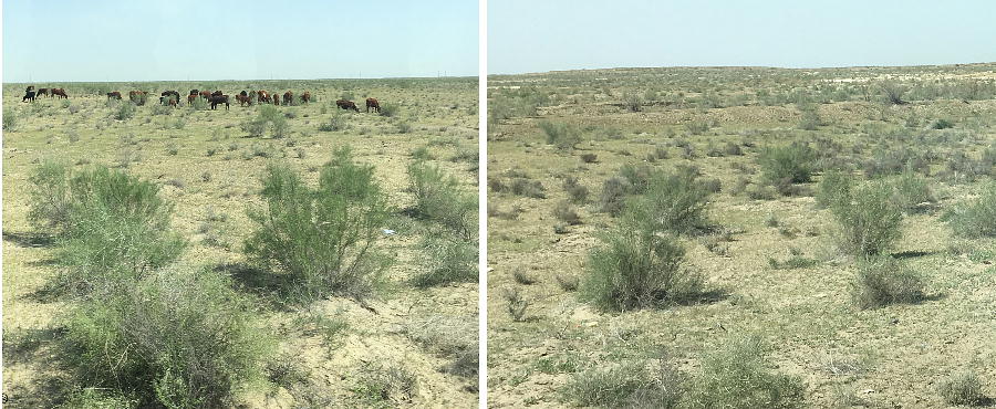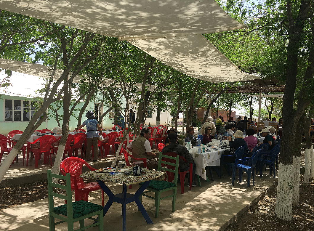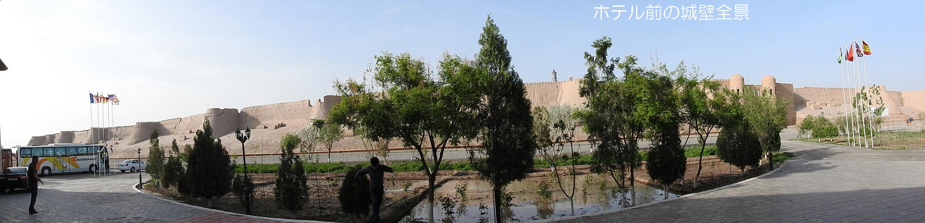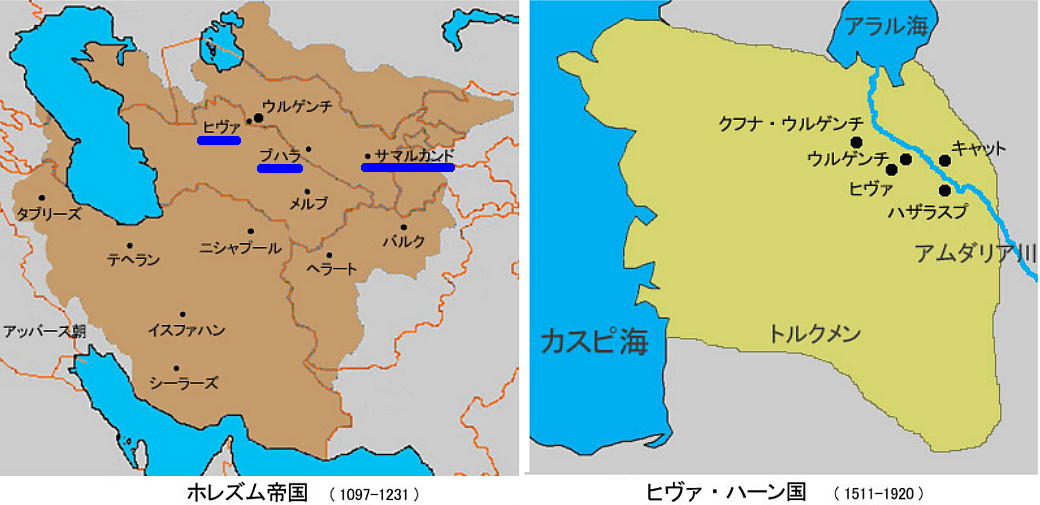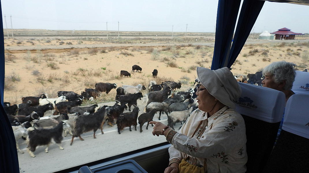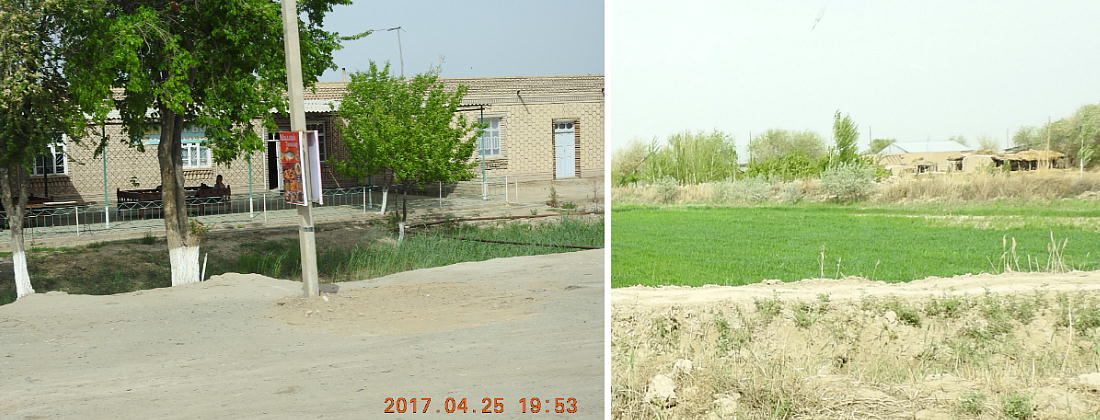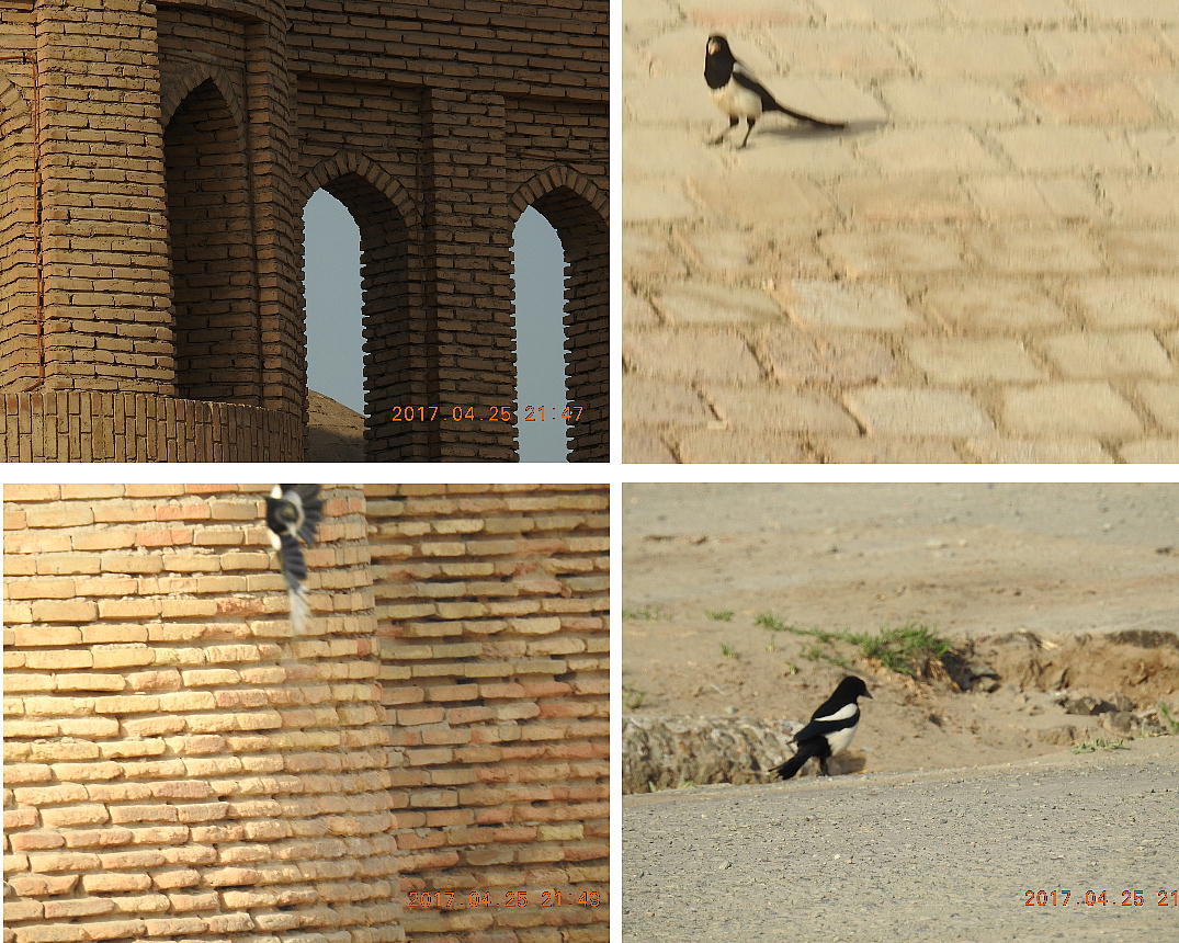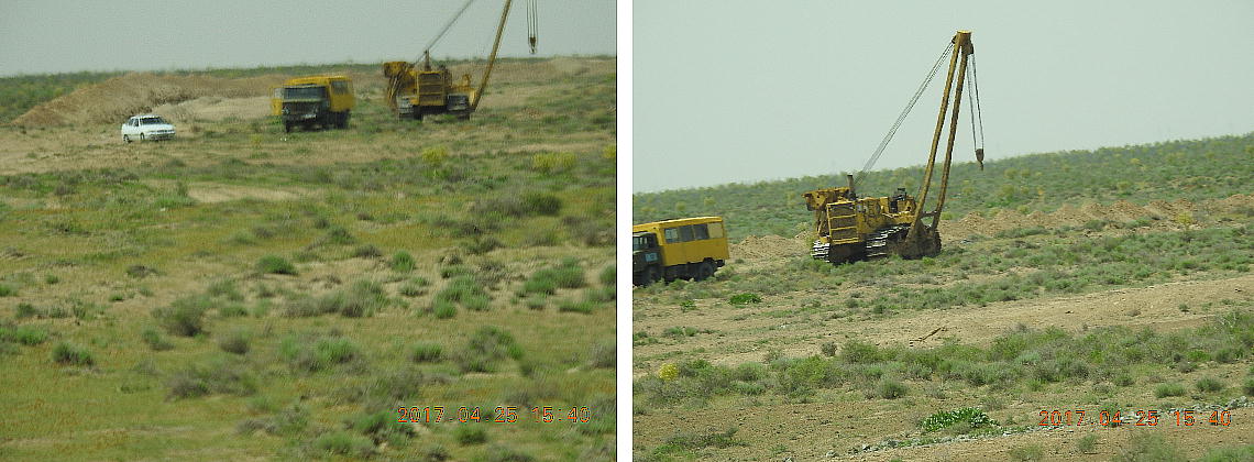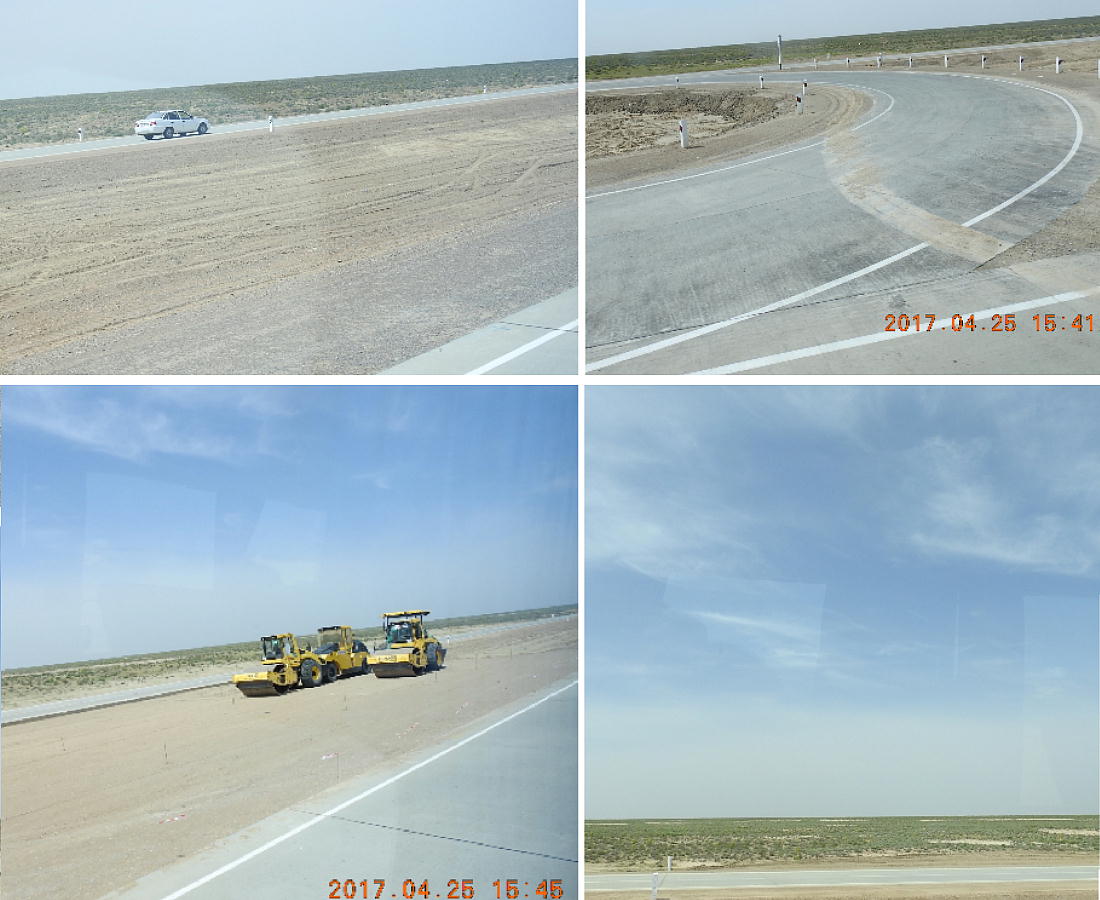 2017.4.25.(火) 〜ブハラからヒワへ〜 キジルクム砂漠をゆく 今日はキジルクム砂漠をバスでゆく。ブハラーヒワ間約450km。終日バスの中である。高速道路 があれば4〜5時間なのだろうが、日本の高速道路に匹敵するような道はない。戦後すぐのようなデ コボコ道と、舗装された道との組み合わせだ。一応8時出発で5時半到着予定だから、9時間半の移 動予定。途中のオアシスでの昼食と、2回のトイレタイムがあったのでそれを差し引いても、ま、8 時間ほどのバスの旅だった。飛行場も鉄道もないのでバスでゆくしかないのである。しかし車が出現 するまでは、この道を馬車と駱駝の隊商達が徒歩で通っていたのだ。 いざ、キジルクム砂漠縦断の旅へ出発。 東トルキスタンのゴビ砂漠のような礫(れき)の砂漠ではなく、タクラマカンのような砂の砂漠でも ない。荒れ地に灌木が点在する、まさに「荒野」という形容がぴったりの砂漠だった。 ブハラとヒワの間にはこの道路しかない。鉄道は建設中だがまだ完成していないし、ヒワには空港は あるが、ブハラには無いようだ。あったとしても、このツアーではその費用を出せないのかもしれな い。延々とバスで移動など、何か無駄な行程のような気がしたが、存外おもしろかった。果てしなく 続く砂漠にも、様々な表情があるのだ。乗客の殆どはその行程の大半を眠っていたようだが、私は砂 漠を見続けながら、深遠な宇宙の真理など、様々な思索にふけっていた。 さぁそれでは、延々と続く砂漠の旅をご覧ください。今日は一日これです。 まだブハラの近郊だからか、結構農作業の機械や人を見る。 小さな村のような集落が点在している。 <キジルクム砂漠> 出典:ウィキペディア他 キジルクム砂漠(英語:Kyzyl kum)は、カザフスタン、ウズベキスタン、それにトルクメニスタン の一部にかけて広がる砂漠。キジルクムはテュルク諸語で「赤い砂」を意味する。面積は約29万8000 km2。北東にシルダリヤ川、南西にアムダリヤ川が流れている。金や天然ガスといった資源が眠り、 川やオアシス周辺では農業がおこなわれている。 ウズベキスタン北西部のキジルクム砂漠には、古代ホレズム王国の都城遺跡(カラ)が点在している。 荒涼とした砂漠に聳える遺跡群で、アヤズ・カラが有名。今回は訪れないが、上の地図には示されて いる。しかしヒワ(ヒヴァ)のイチャン・カラは、1990年にユネスコの世界遺産に登録されているし、 ヒワの旧市街地でこの王国のよすがを今も忍ぶことができる。 イチャン・カラ(ウズベク語: Ichan Qa'la)とは、中央アジア、西アジアの都市に見られる市街地の 形態である。城壁に囲われた市街地で、日本語に直訳すると「内城」となる。城壁の外に発展した郊 外の区域は「デシャン・カラ(ディシャン・カラ、外城)」と呼ばれる。 <古代ホレズム王国> 出典:[国立情報学研究所] 『"古都ホレズムは中央アジアのエジプトである" ― 人類の文明を探求し続けてきた考古学者らは、 古代ホレズムの研究を通じ、偉大な結論に辿り着いた。彼らはホレズムの文化・芸術・歴史は中央ア ジアの発展に密接に関係していることを証明したのである。』 <ソ連の民族学者 S.P.トルストフ> 地理的にホレズムという地域はアラル海の南東、アムダリヤ川下流の両岸と、イラン北東部付近一帯 を指します。また、アラル海の南西部にある乾燥したウスティユルト高原の南側地域と、アムダリヤ 川とシルダリヤ川に挟まれた地域も含みます。現代ではウズベキスタン共和国内にあたり、古くはシ ルクロード上の重要な地域であったところです。 ホレズムという名称はアヴェスタと呼ばれるゾロアスター教の経典の中で記述されています。アヴェ スタには当時、イラン東部と中央アジアには経済格差のある階級社会が存在していたこと、また、国 家を形成していた聖職者、軍人、農夫、職人、奴隷らについても詳細に記されています。また“アリ アナム・バイジャ”の地で起こった物語が翻訳されており、権威あるホレズムの科学者によって立証 されています。 11〜13世紀のホレズム帝国にはパルティア(カスピ海南東部、イラン高原東北部)、メルブ(トルク メニスタン)、ソグディアナ(ウズベキスタンのサマルカンド州とブハラ州、タジキスタンのソグド 州)、ホレズム(ウズベキスタン西部)が含まれていました。 中央アジアで最初の国家は、紀元前 9〜8世紀頃にアラル海南部のバクトリア地域で発展しました。 ホレズムは、紀元前6世紀に王国として発展しバクトリアとホレズムは、アムダリヤ川河口において、 開拓地を共有していました。乾燥したホレズム地方での最初の灌漑工事が紀元前6−5世紀頃から始ま ったと言われています。住民は、主に村では農夫、都市では職人と貿易商で占められていましたが、 遺跡の発掘により科学者の存在も確認されています。 ホレズム人は天文学、数学において高い知識を持っており、角度を測定する道具を発明し、それらを 科学の研究に使用して