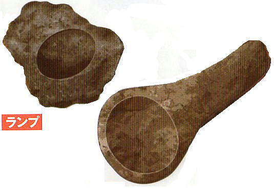 ランプは、このように加工して綺麗に仕上げたもの、自然石の窪みを利用したものなど100点あまり出土している。窪みに