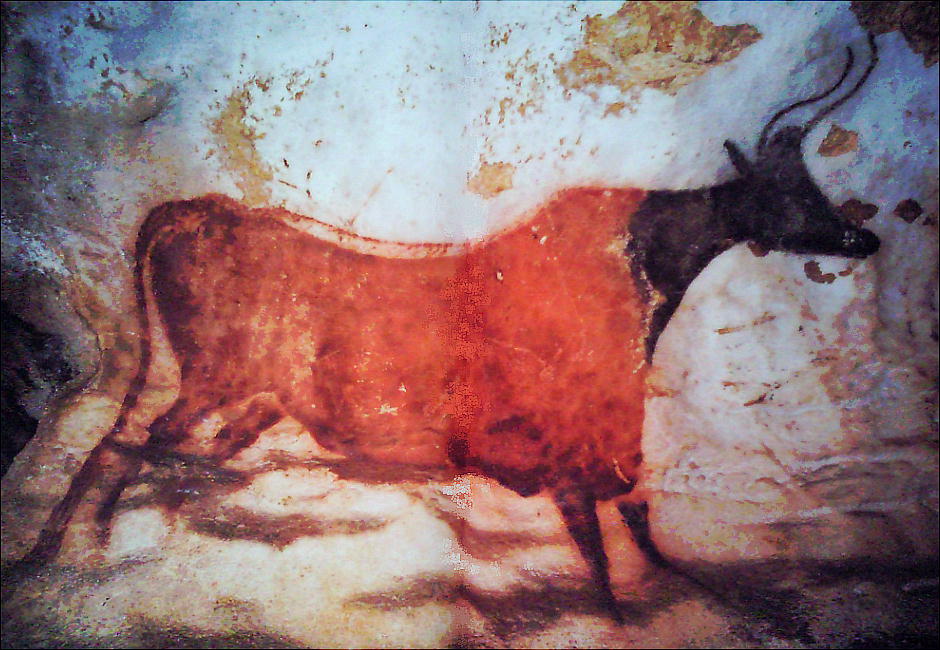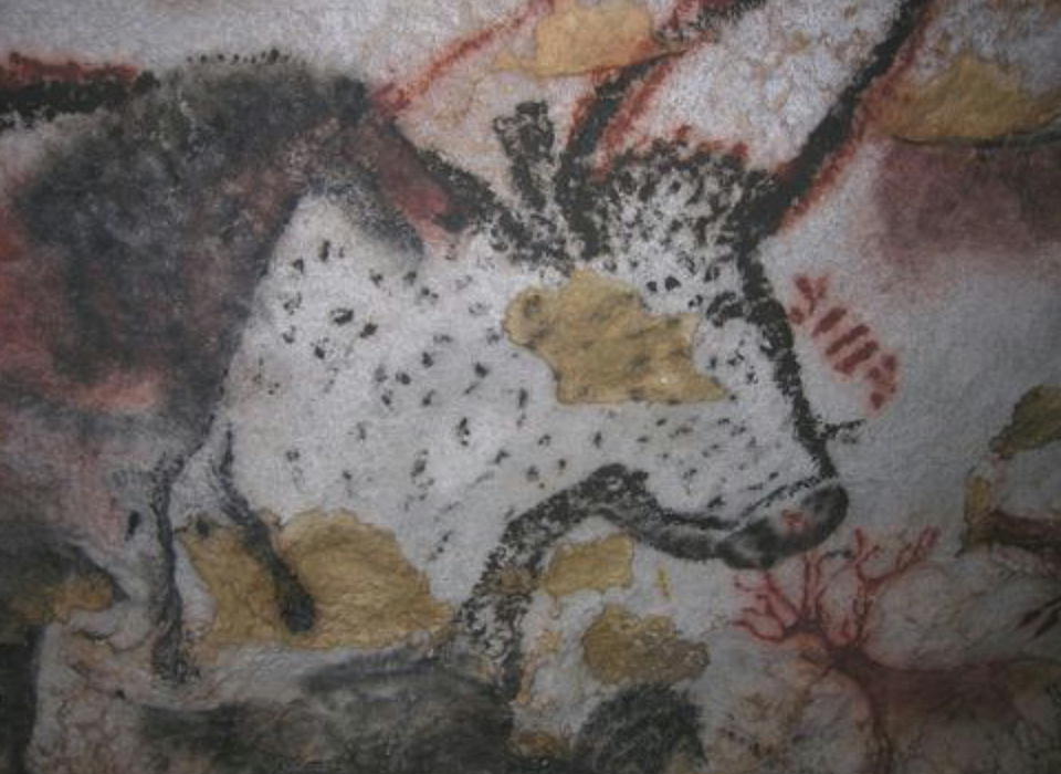 無数の壁画がある内の1つ、黒い牛の絵の角に遠近法が用いられている。手前の角が長く描かれ、奥の角は手前の角より短く描かれ