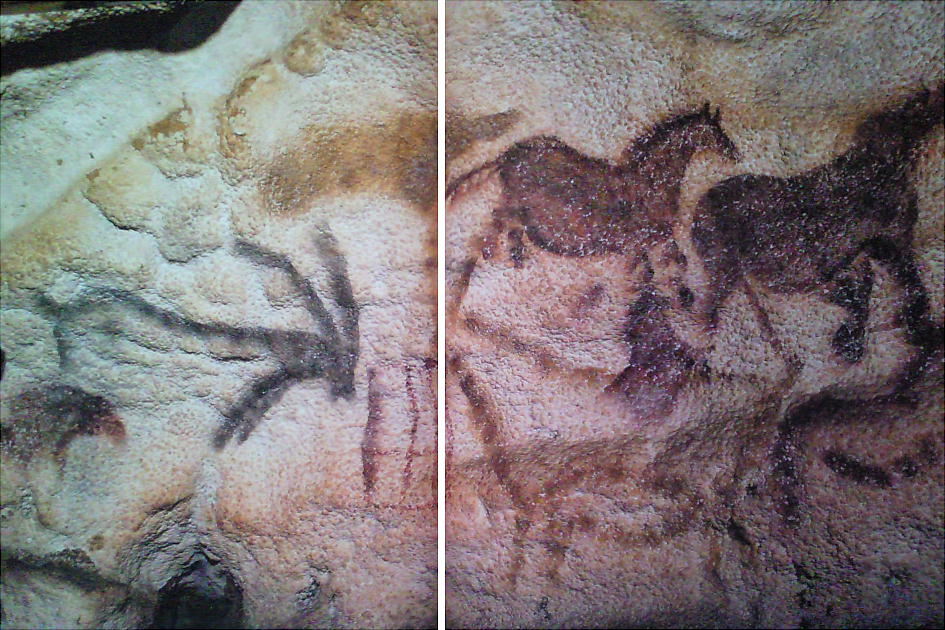 人間・幾何学模様の彩画、刻線画、顔料を吹き付けて刻印した人間の手形が500点もあった。これらは15,000年前の旧石器時代後期