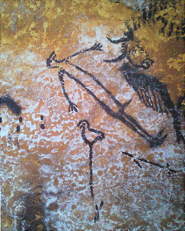 これは、この洞窟で唯一描かれている「人間」の図。バイソンに突かれて倒れているようにも見えるし、ただ寝そべっているよ