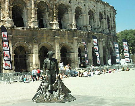 フランスでも、ここニームは闘牛が人気があるそうで、ここでも時々行われる。ニームで人気闘牛士だった人物のブロンズ像がある。