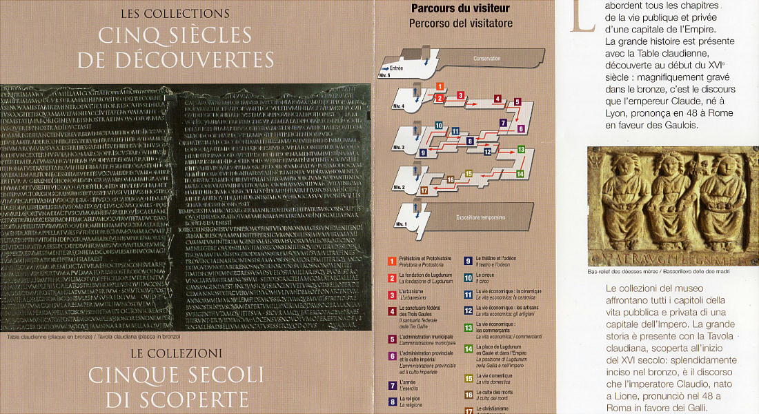 展示は、紀元前の歴史、リヨンの都市計画、行政、文化、宗教、工芸、流通、生活など、テーマ別に 17のスペースに分られ、