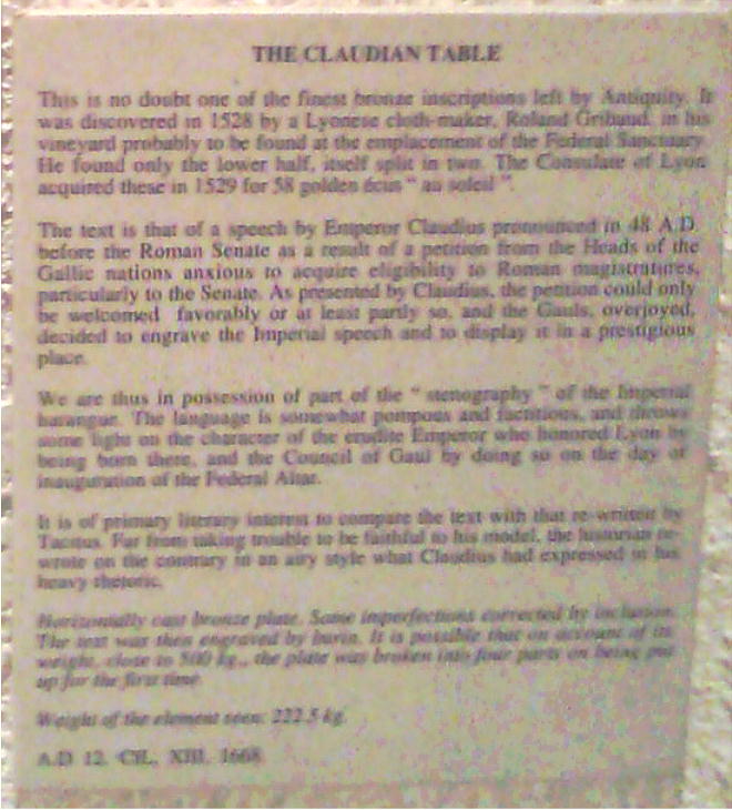 なかでも1528年に発見された「クラウディウスの青銅板(Table Claudienne)」は代表的なもので、48年にローマの元老院で行っ