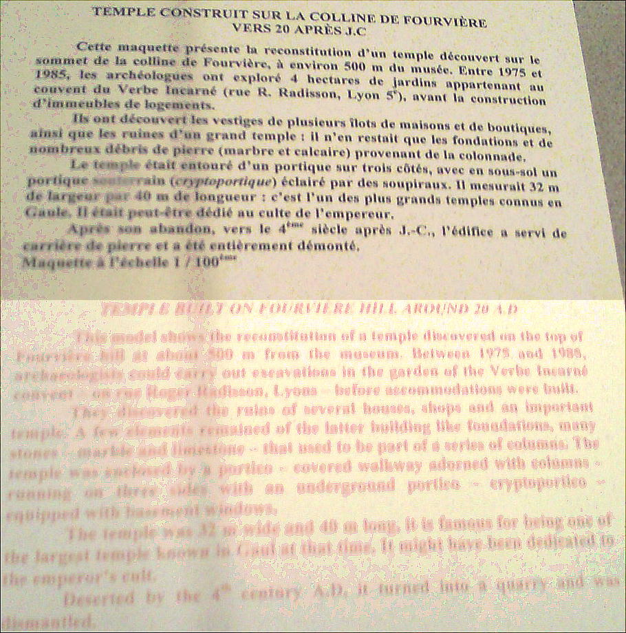 英語がぼけていてよく判らんが、フルヴィエールの丘にA.D.20年頃に建った寺院(の模型)。と書いてあるのかな?
