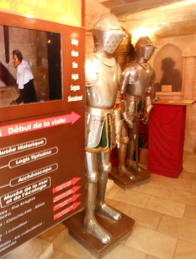 土産が並んでいる。等身大の中世の甲冑、絵ハガキ、Tシャツ、ハンカチ等々、所狭しと並んでいる。資料館もあ