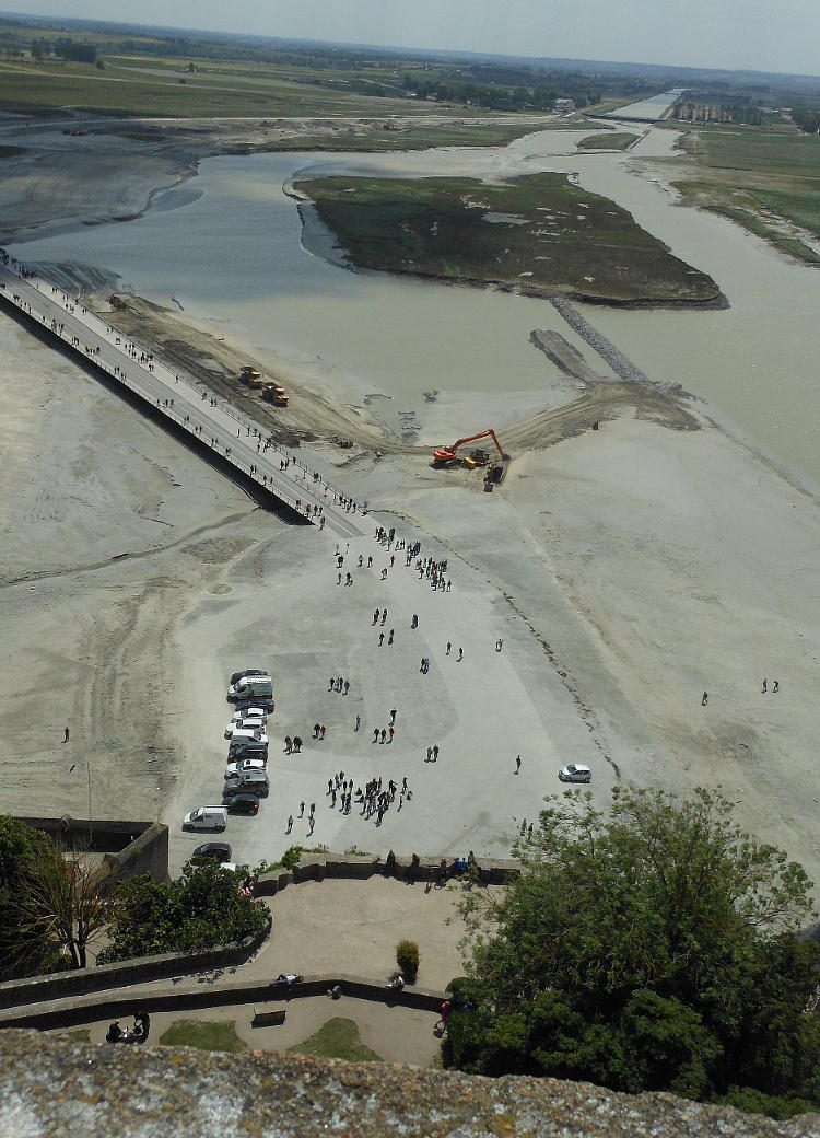 塔の上から見たモンサンミッシェル大橋(?)。何か埋め立て工事をやっていて、ダンプやショベルカーが見える。