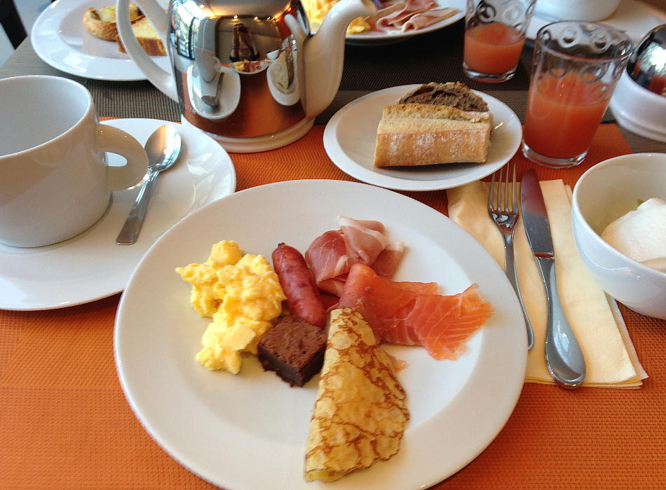 朝食。フランスはイギリスと違って、何処の朝食も旨い。いくらでも食べられる。