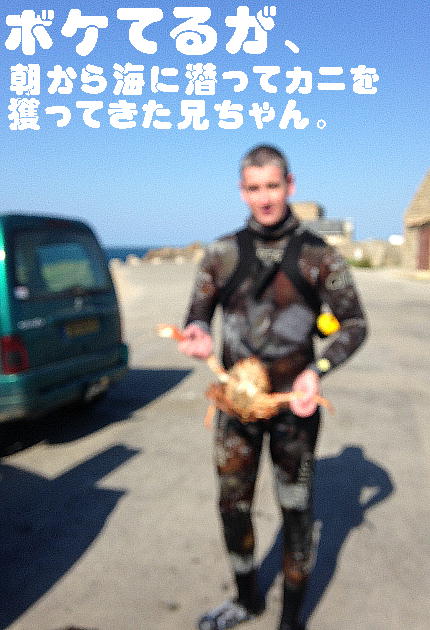 あり、バンでウェットスーツを着替えていた兄ちゃんは、大きなエビを我々に見せて、「この下で採ってきた」と