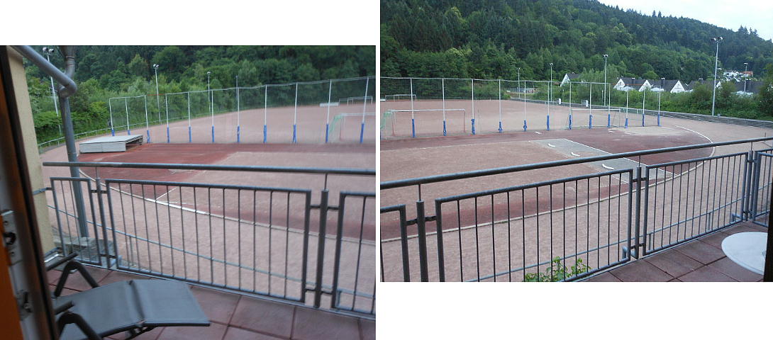 部屋のベランダから運動場が見え、学生達のグループが何組か運動場付近にいて、アスリート達も練