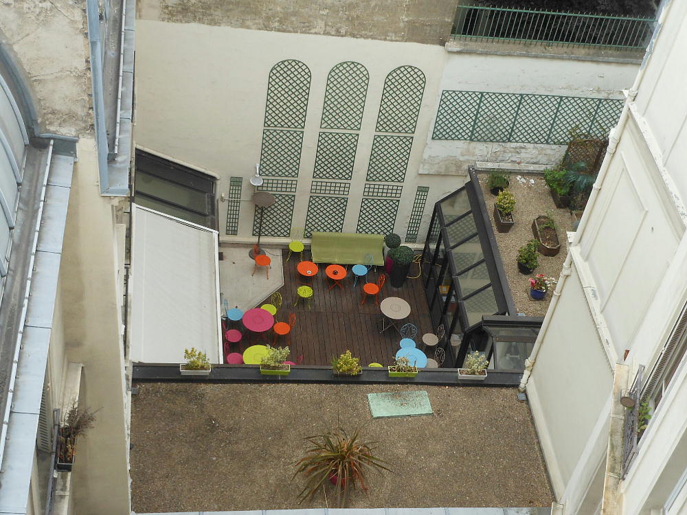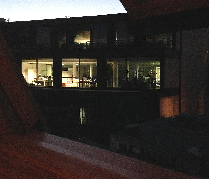 上左は、我々の部屋から見た中庭と広場。上右は部屋の真向かいにある事務所。勿論この時間には誰も居ない。