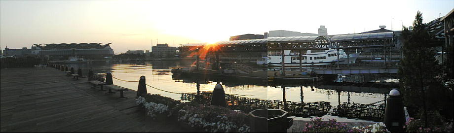 朝7:00のジエット船出発を待つ博多港のフェリー乗り場桟橋(上)。太陽の光の辺りが高速船乗り場だ。下は乗り込んだジ
