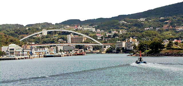 郷ノ浦港へ入る。タグボートの先に郷ノ浦大橋が見える。桟橋は左の方にある。